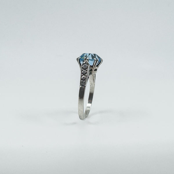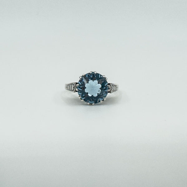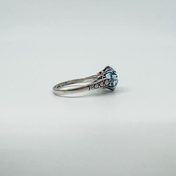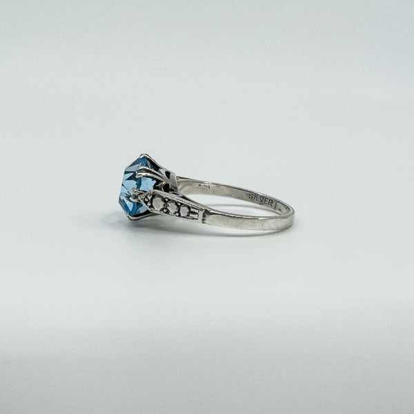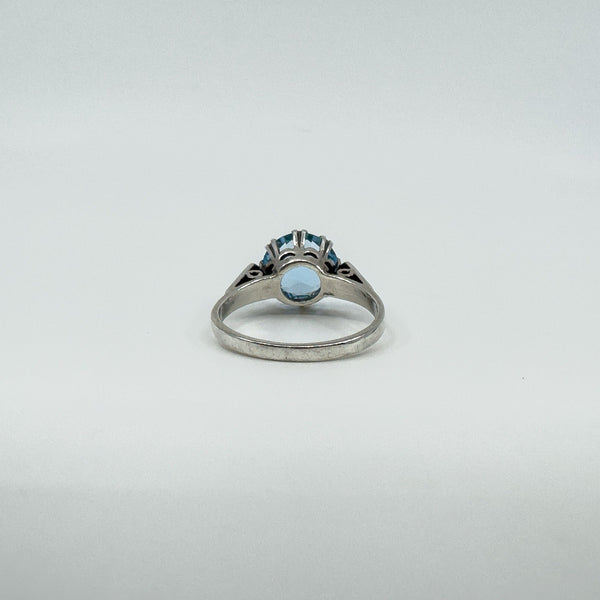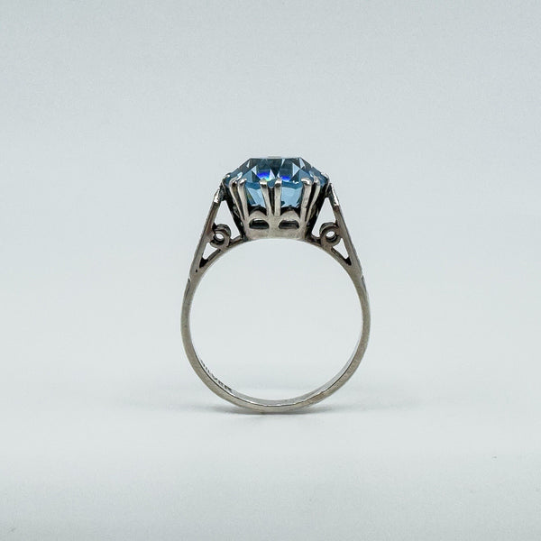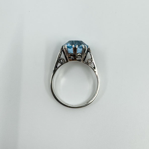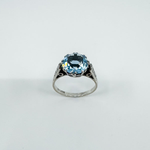 Vintage sterling silver blue topaz solitaire ring with a large stone in a classic high double gallery setting.