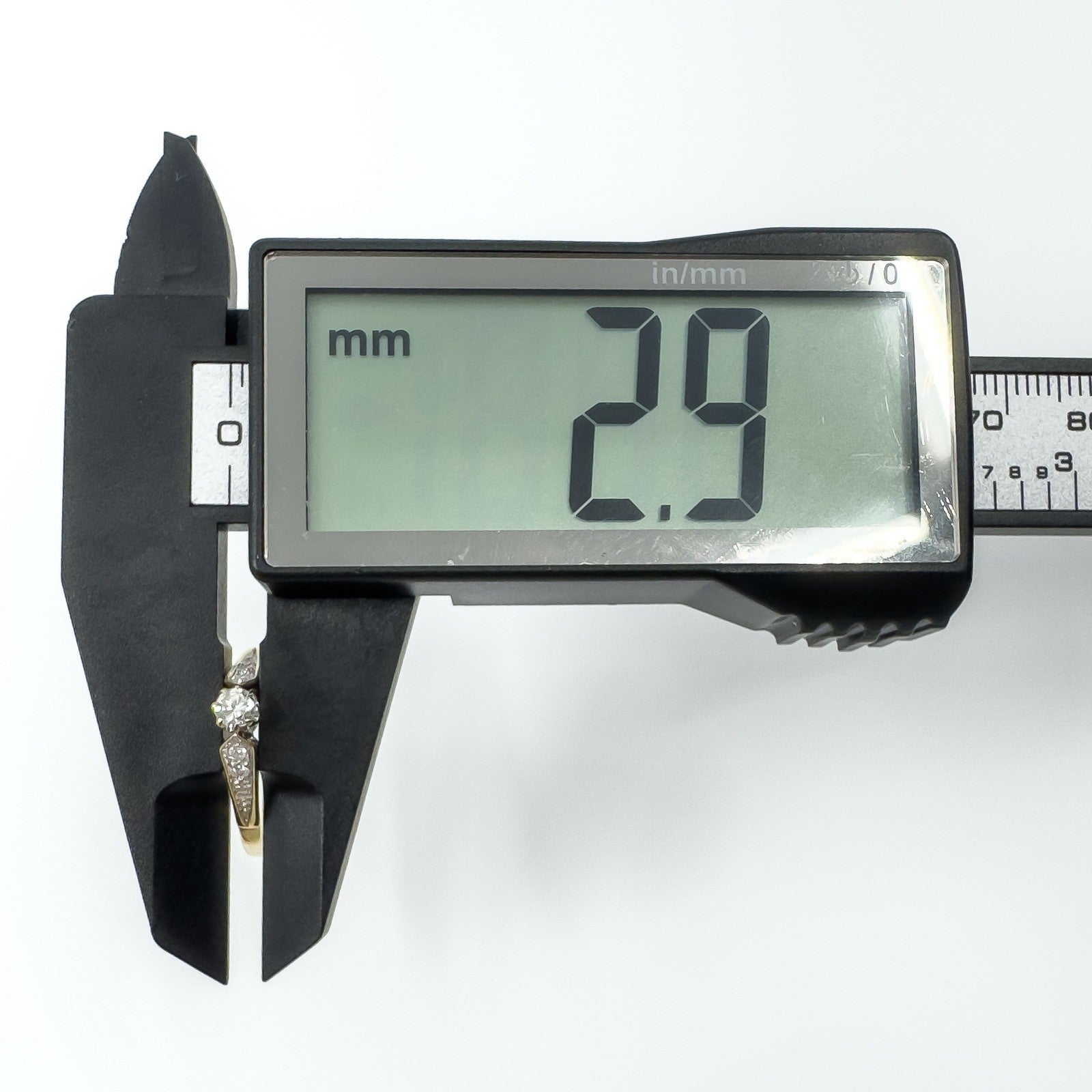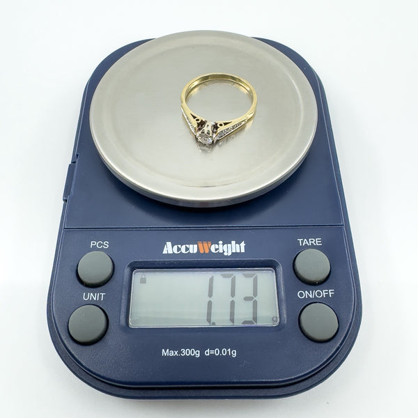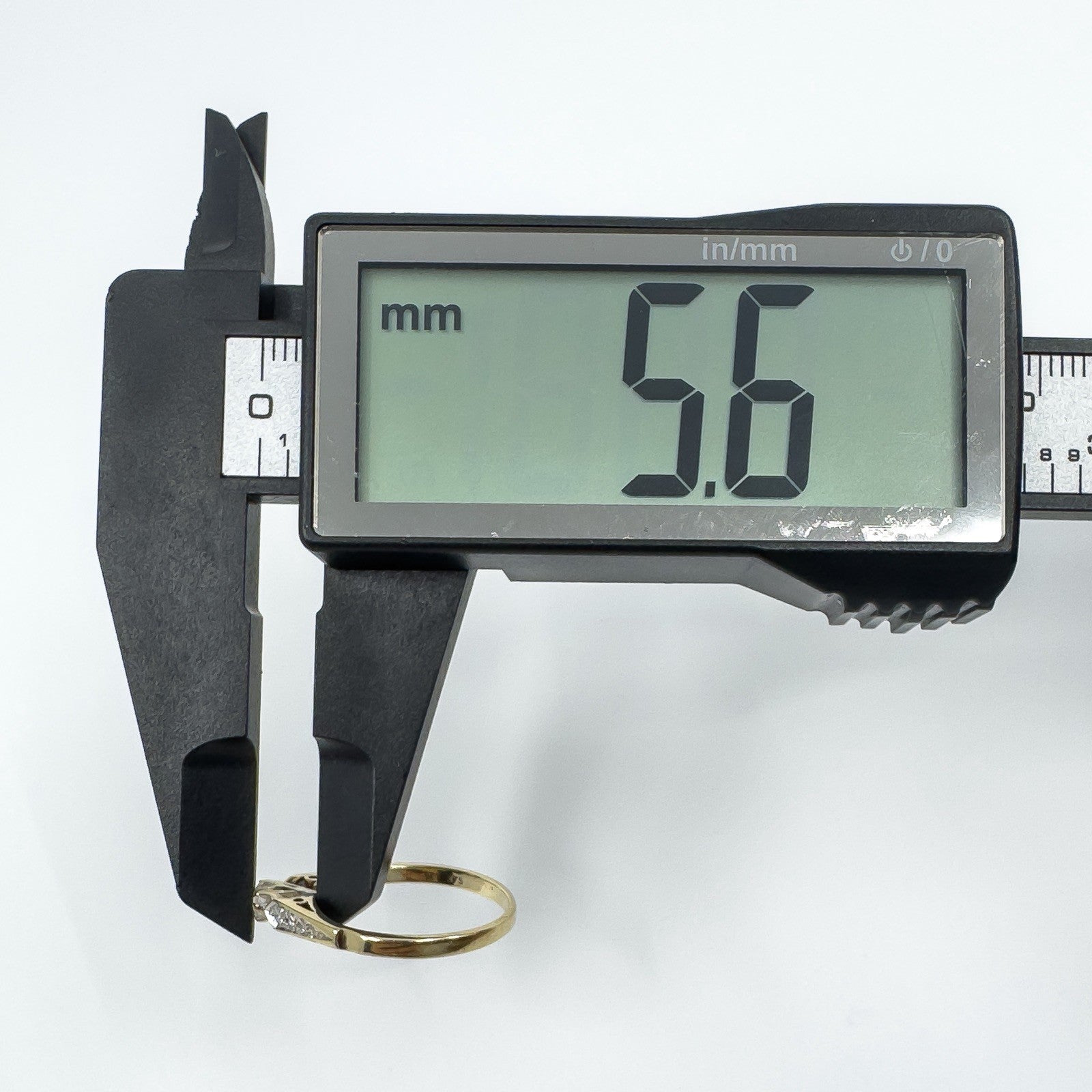 • Vintage 9ct gold 0.20ct diamond ring • Central natural round cut diamond ≈0.15ct (tested) • 3x small natural round diamonds on the shank, ≈0.20ct total • Stamped 9ct; ZJ; 375; import marks; P (1989) • Head of ring approx. 16.7 × 4 mm • Band width on underside approx. 1.7 mm • Depth of ring approx. 5.6 mm • Weight approx. 1.7 g • Ring size M (UK)