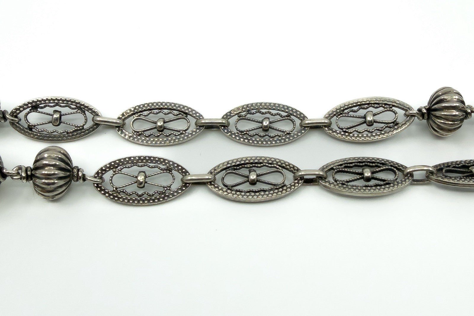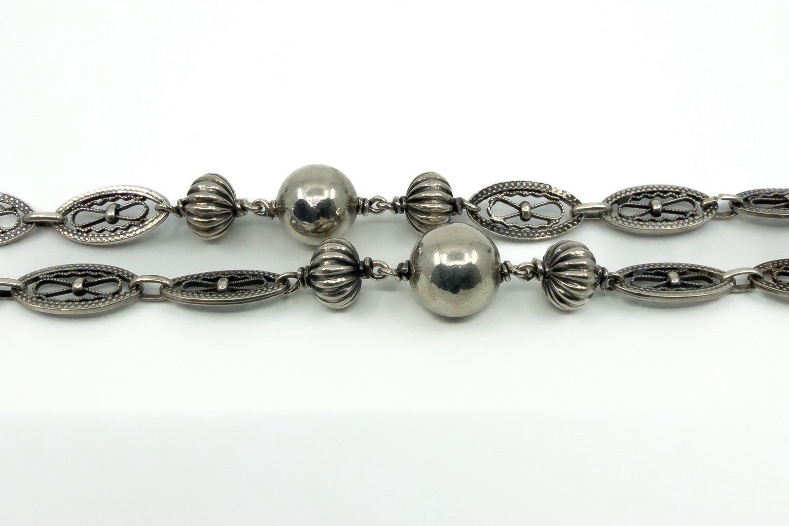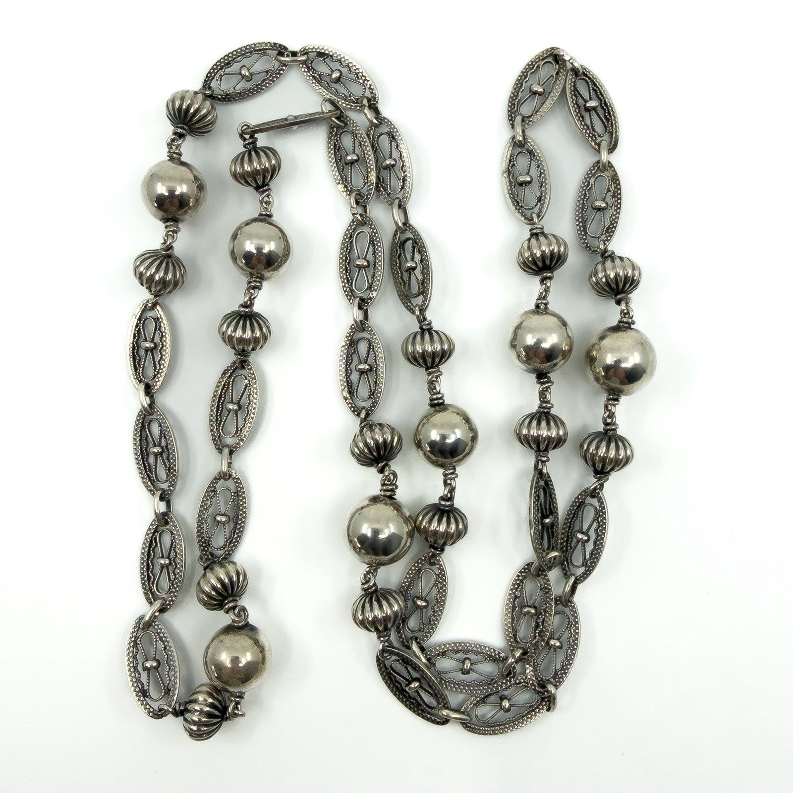 An antique Victorian 800 silver fancy link beaded ball necklace with fine filigree openwork links and ornate beaded ball details. It is a long 30 inch chain with no clasp, so it slips over the head to wear.
