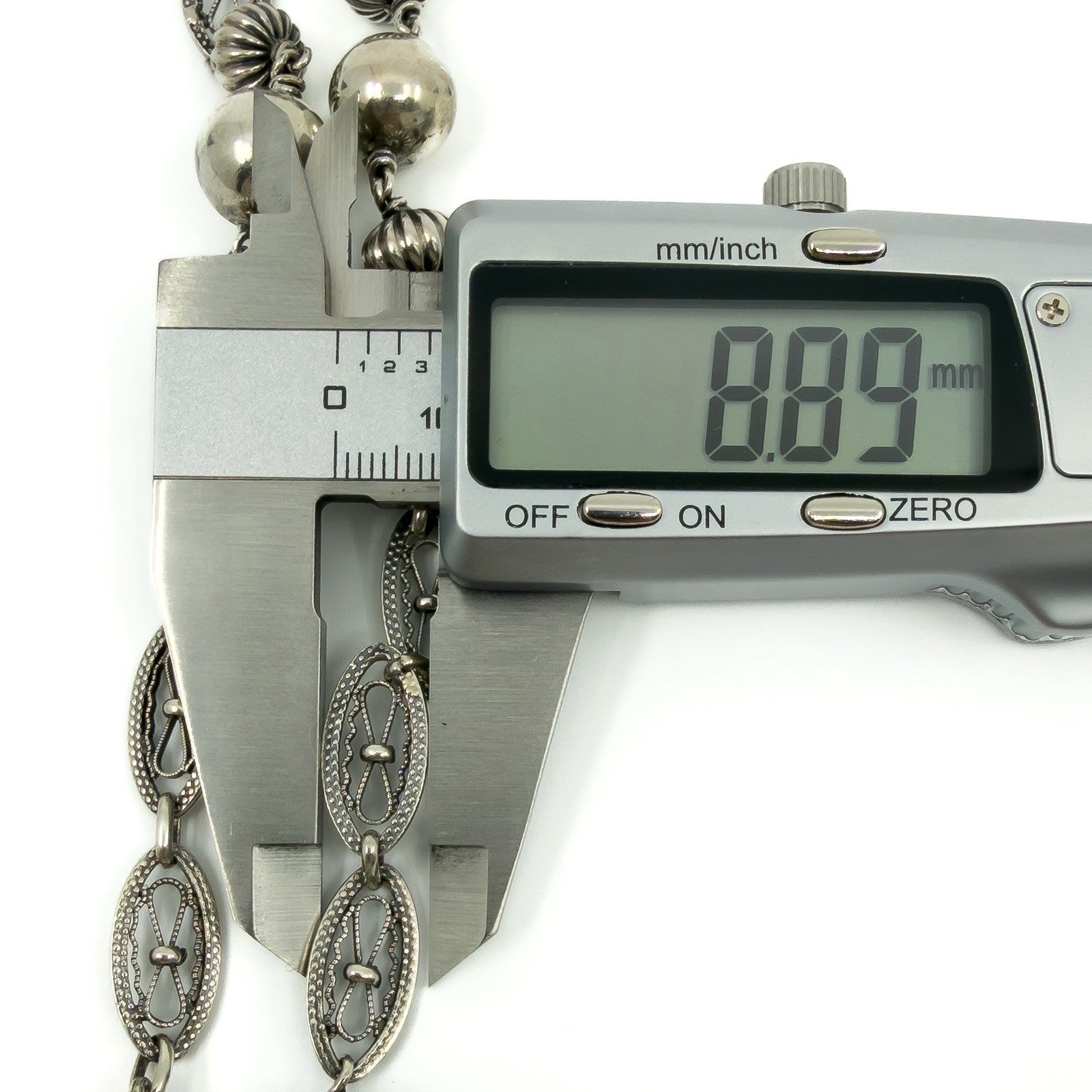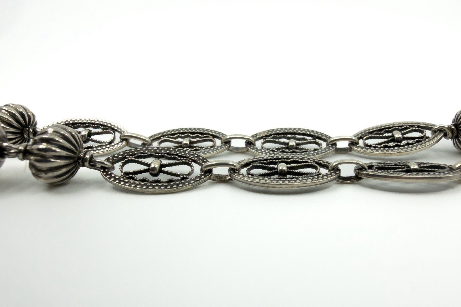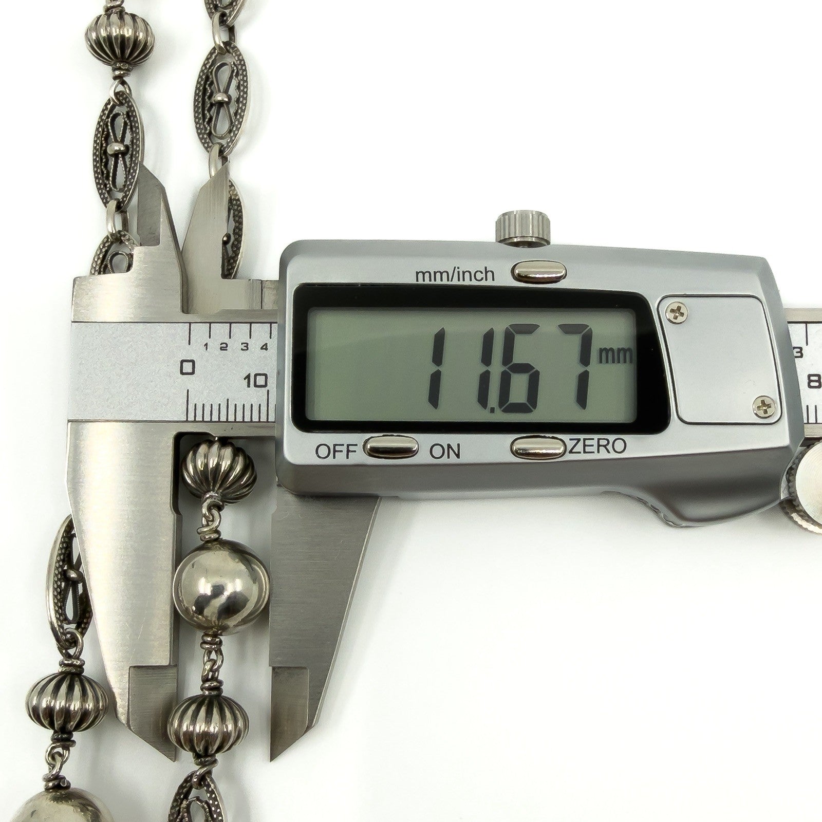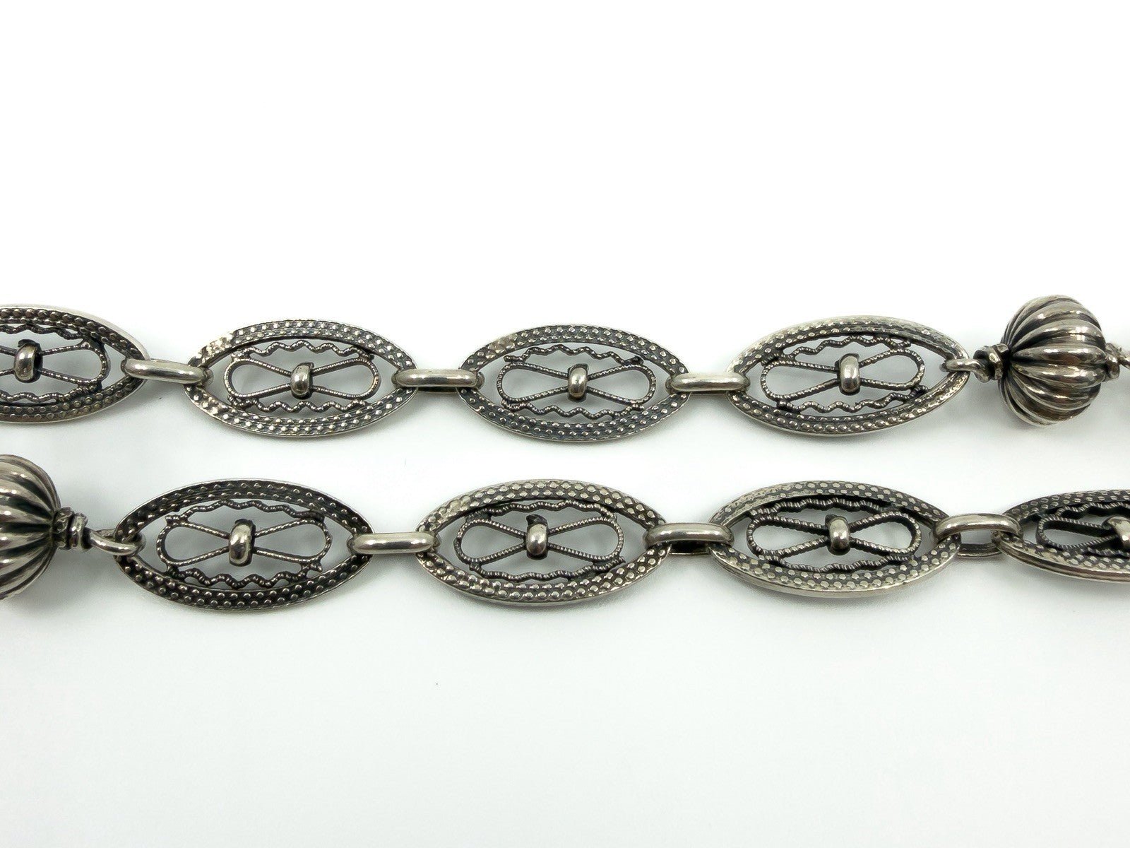 An antique Victorian 800 silver fancy link beaded ball necklace with fine filigree openwork links and ornate beaded ball details. It is a long 30 inch chain with no clasp, so it slips over the head to wear.
