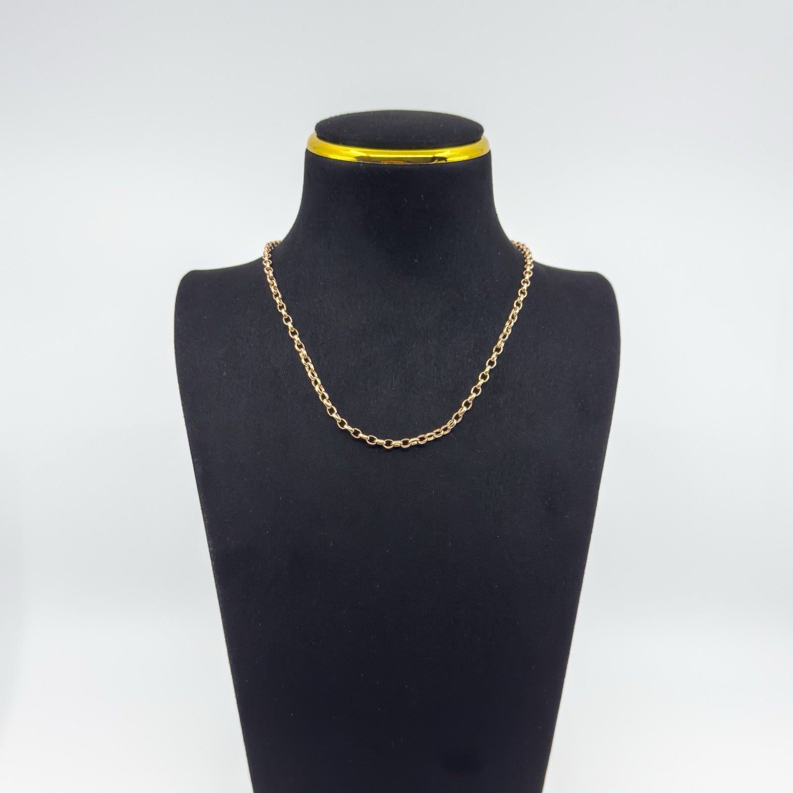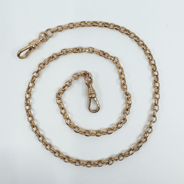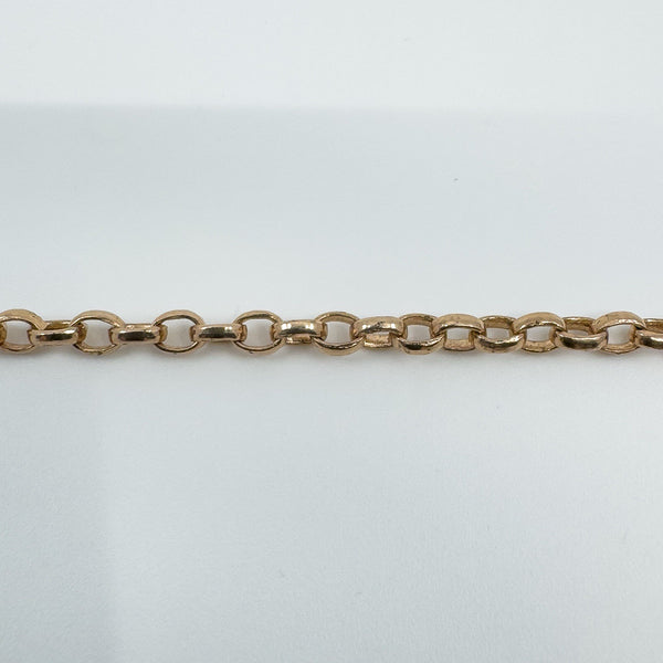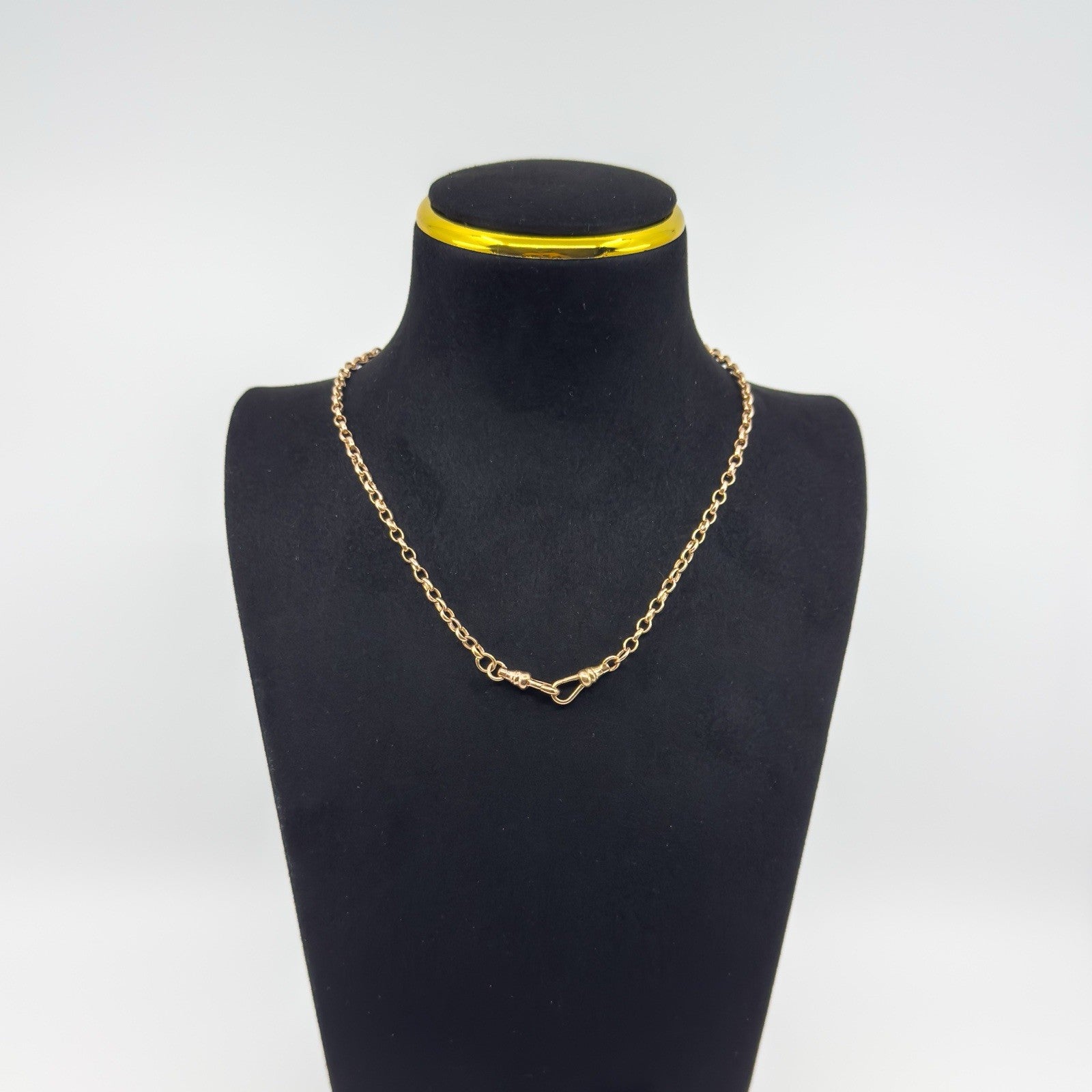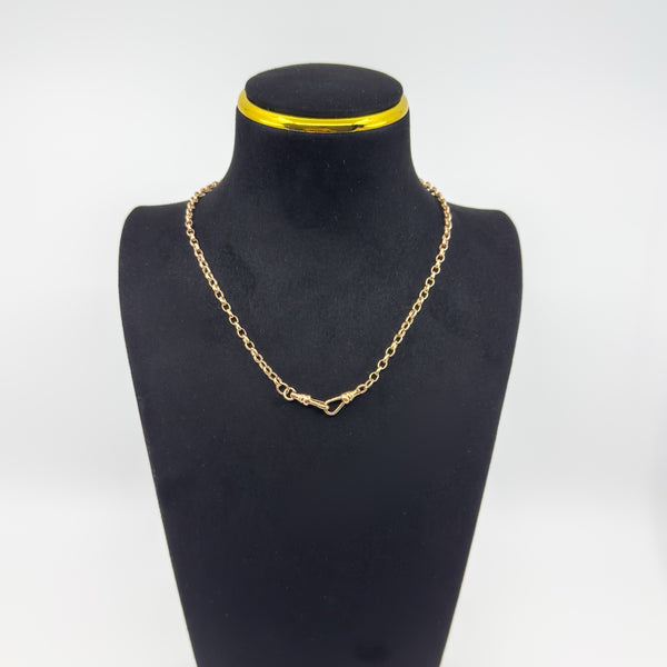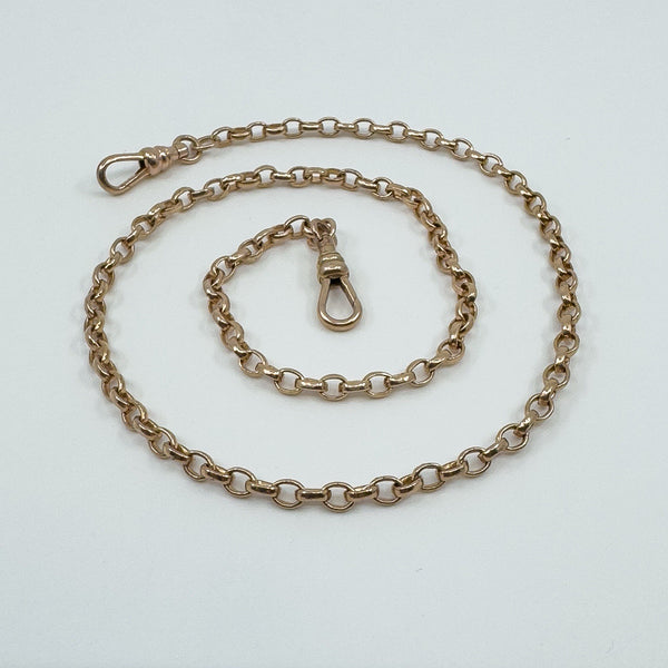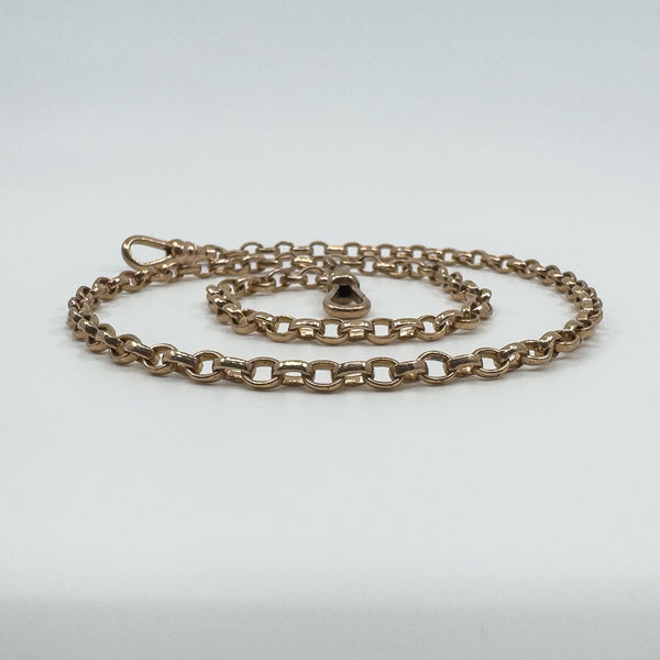 A vintage 9ct rose gold belcher/rolo chain necklace, complete with double dog clips. Measuring 15.8 inches in length, this versatile chain can be worn alone, stacked, or used as a charm necklace or extender.