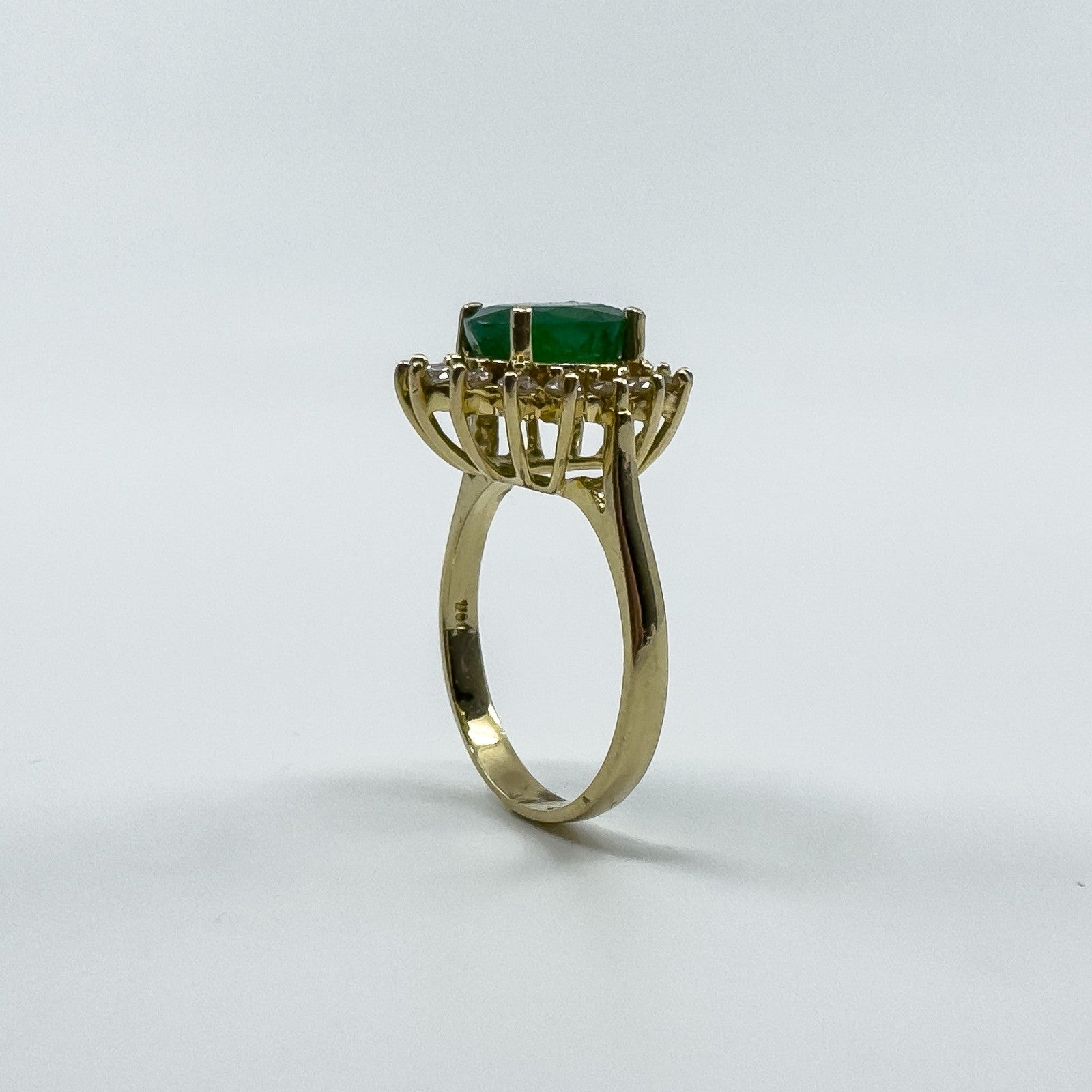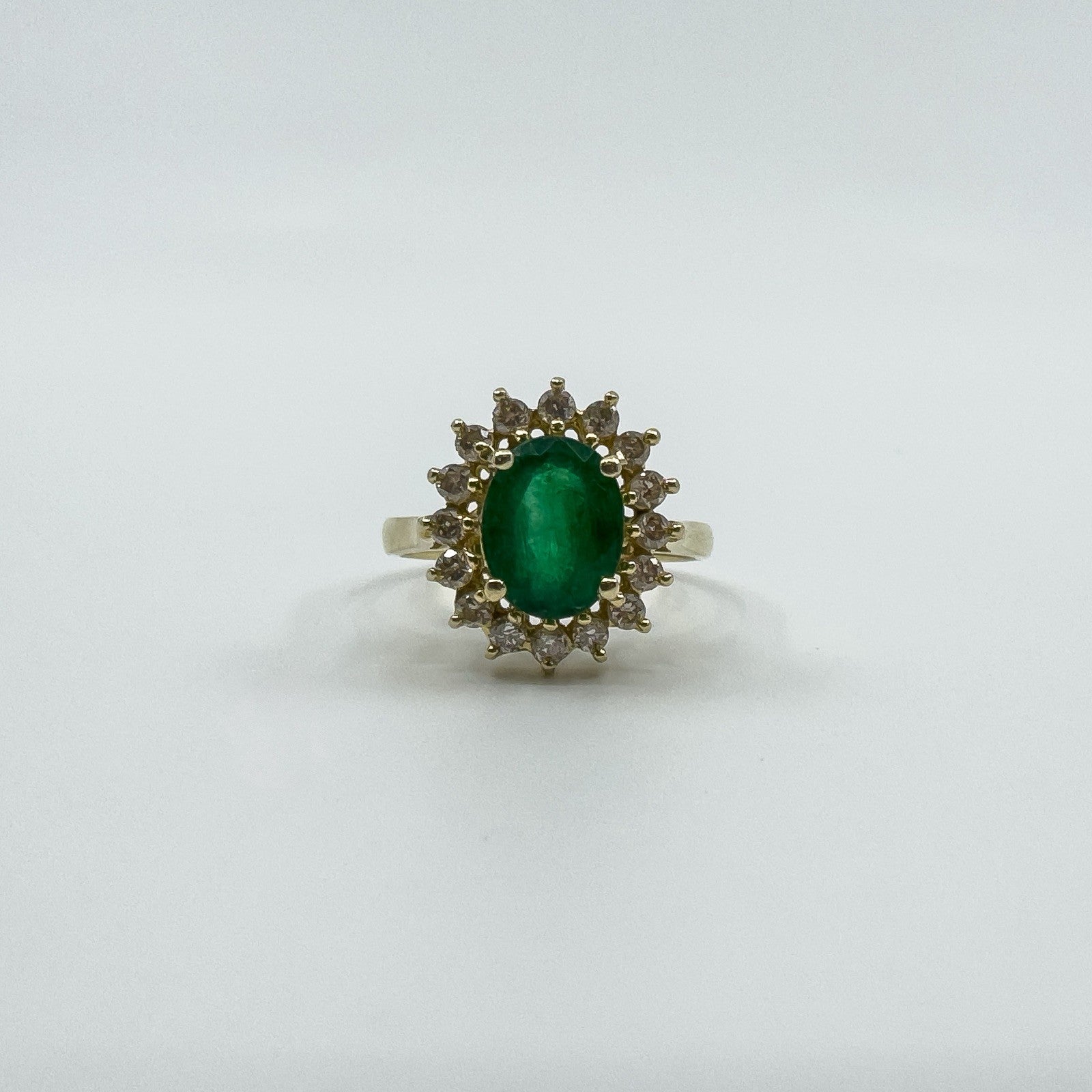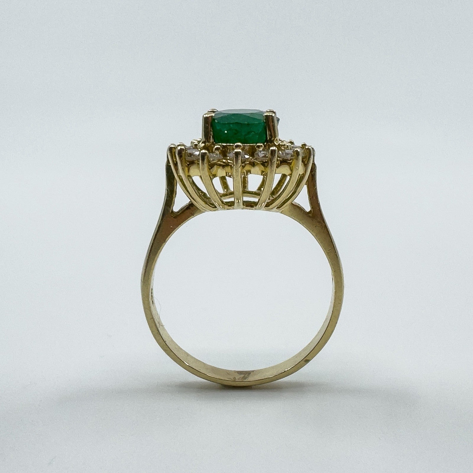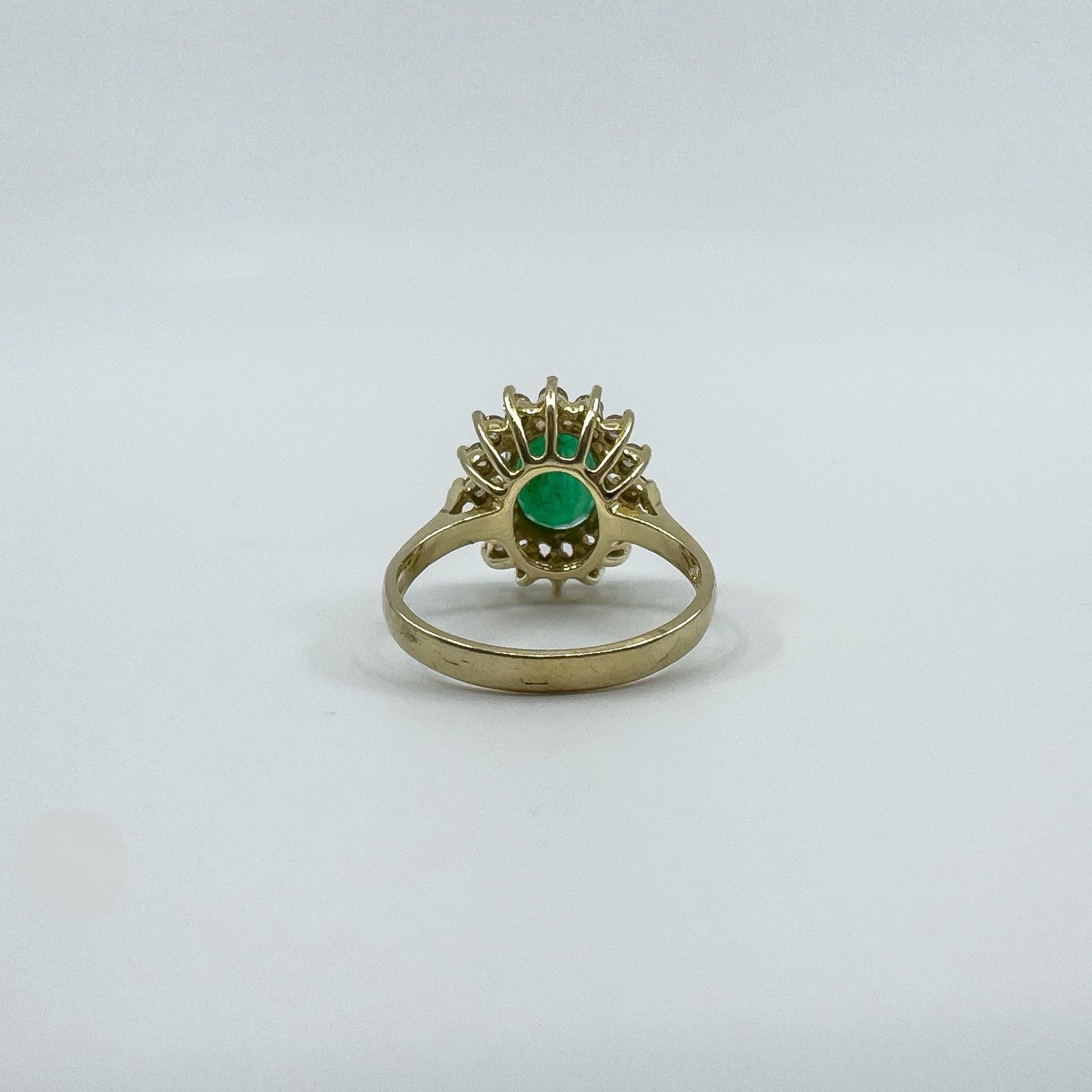 A 14ct gold emerald and diamond cluster ring with a bold traditional cluster look and a high setting that really shows the stones off.