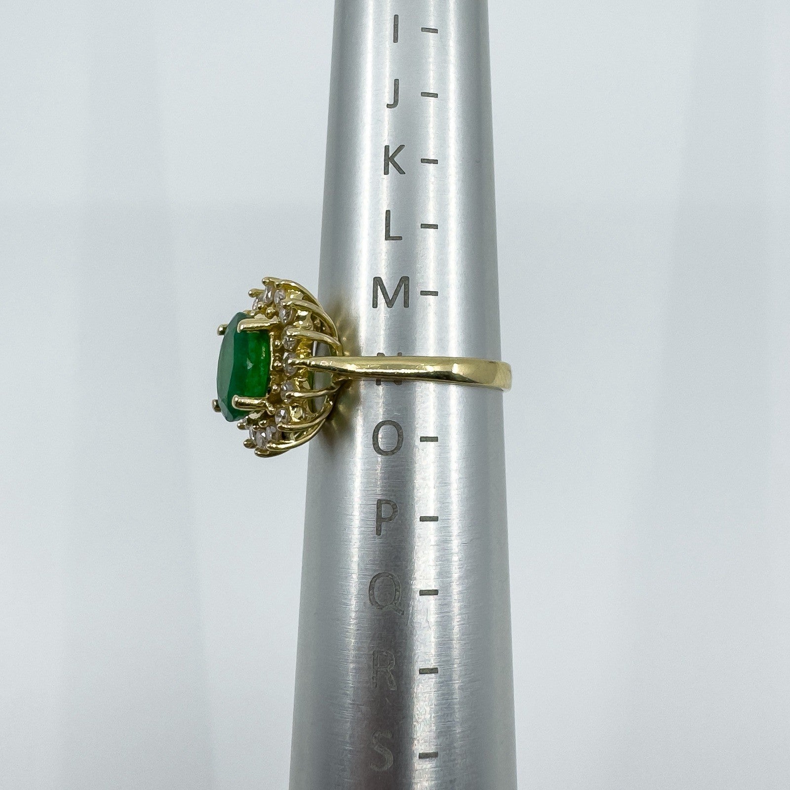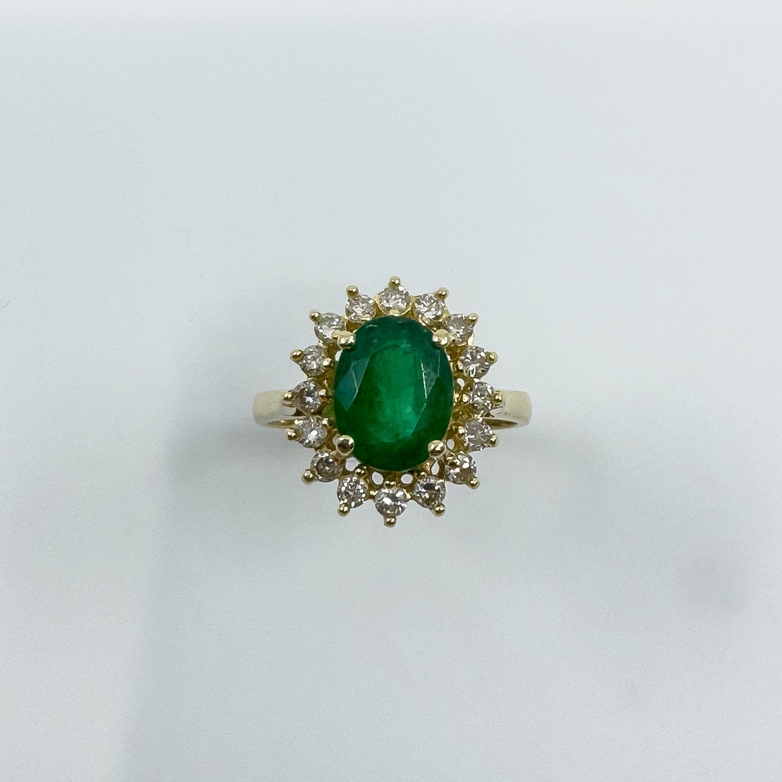 Set with an oval cut dark green natural emerald, estimated at around 1.45ct, surrounded by 16 round cut natural diamonds (tested) weighing around 0.32ct in total. Stamped 14k and sized N.