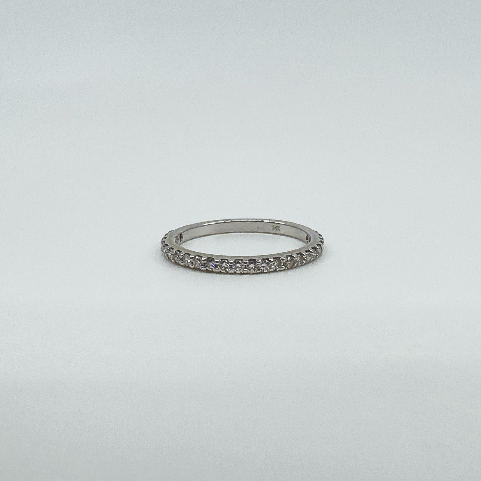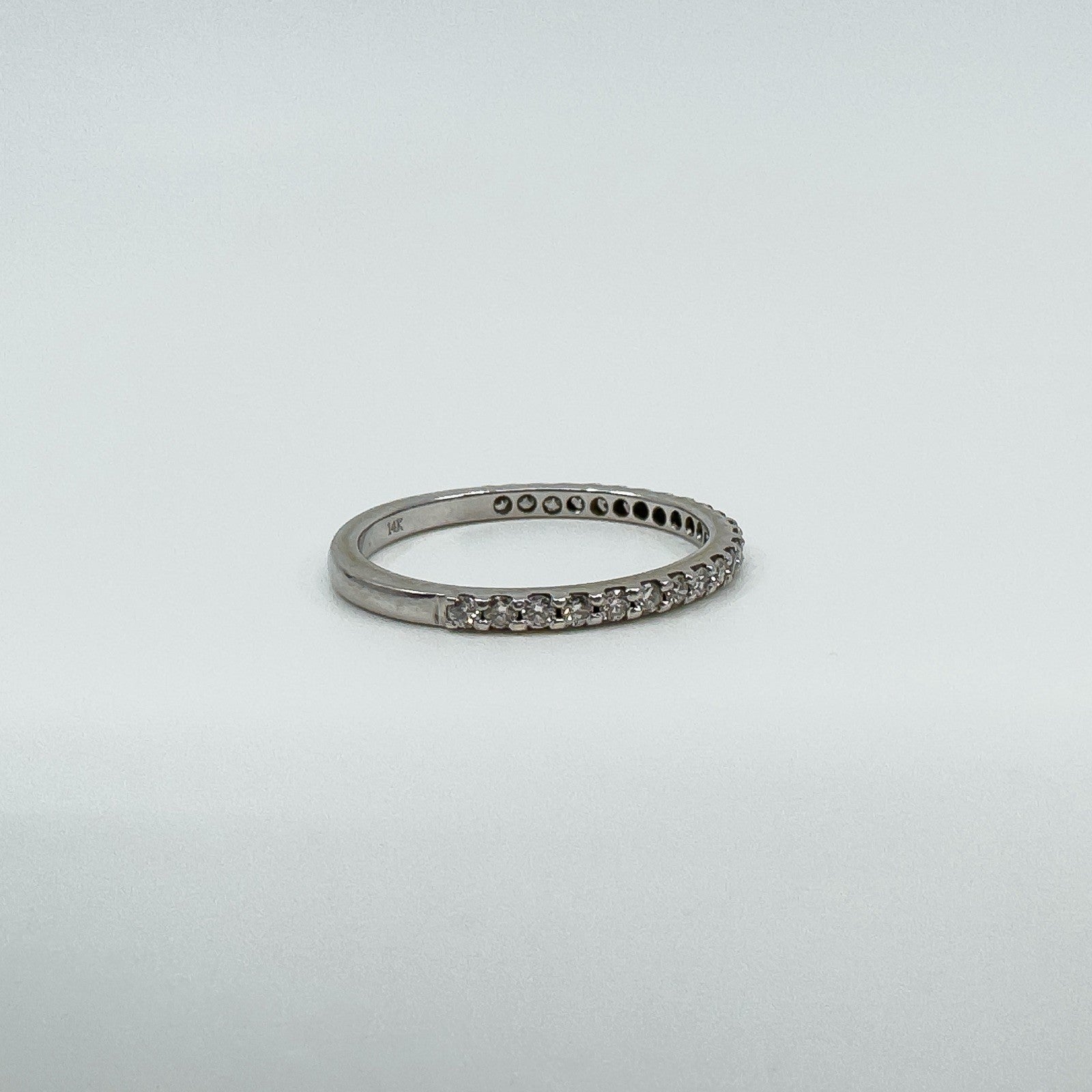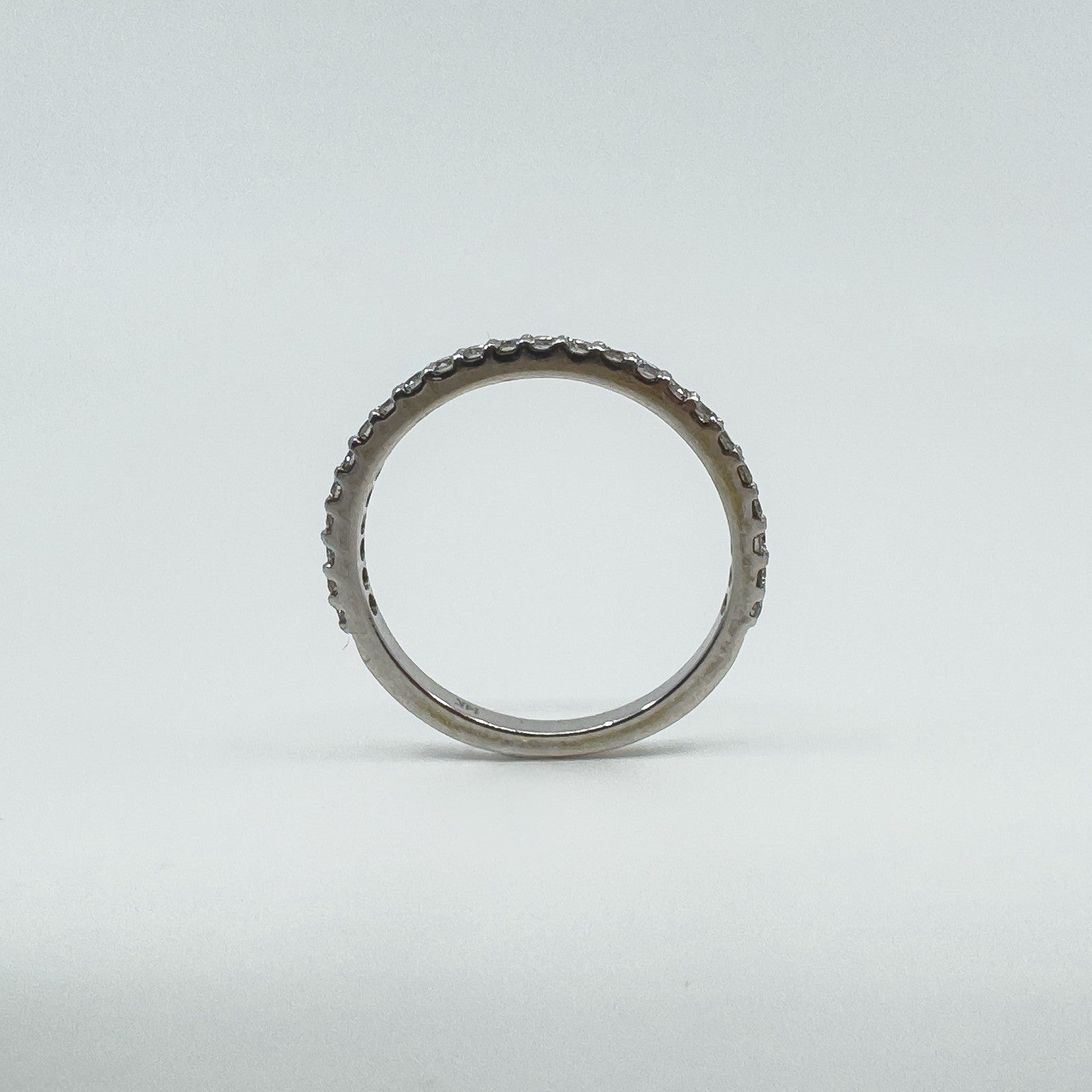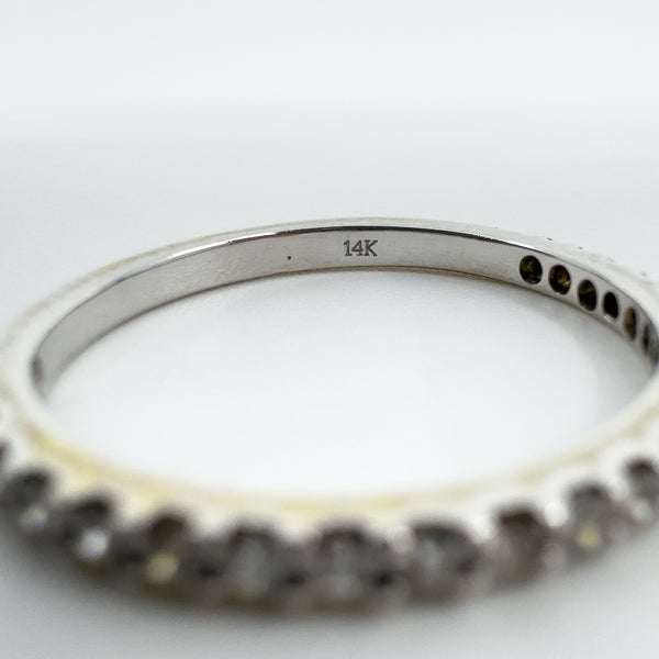 • 14ct white gold diamond three-quarter eternity band • Natural round diamonds (tested), est. total ≈0.35 ct • Prong set; low profile • Head measures approx. 18.9 × 1.9 mm • Band underside approx. 1.8 mm • Depth approx. 2 mm • Weight approx. 1.9 g • Ring size O • Stamped 14K