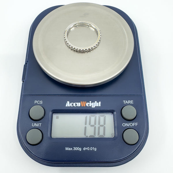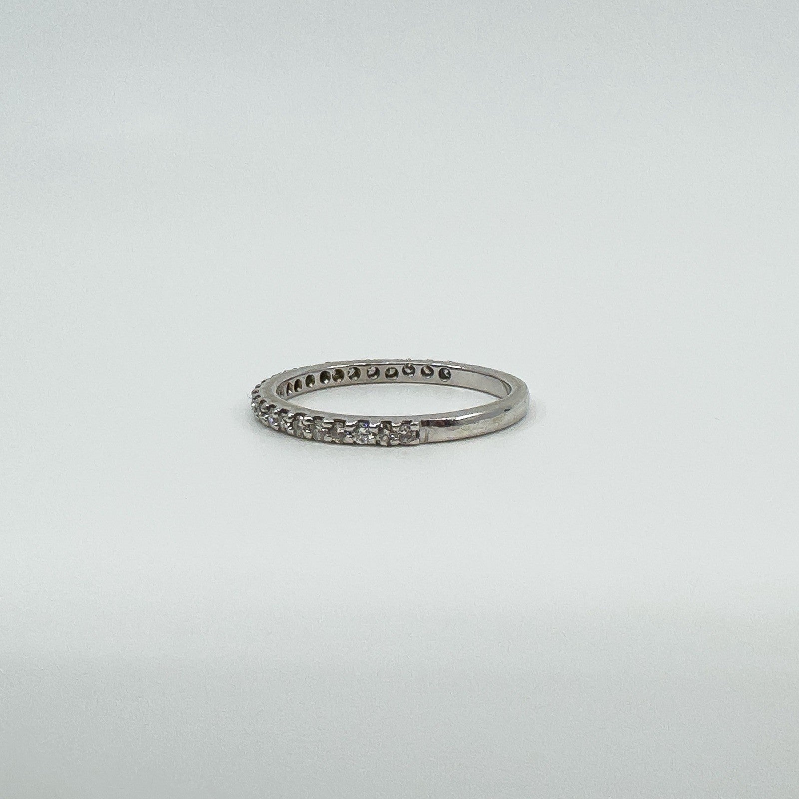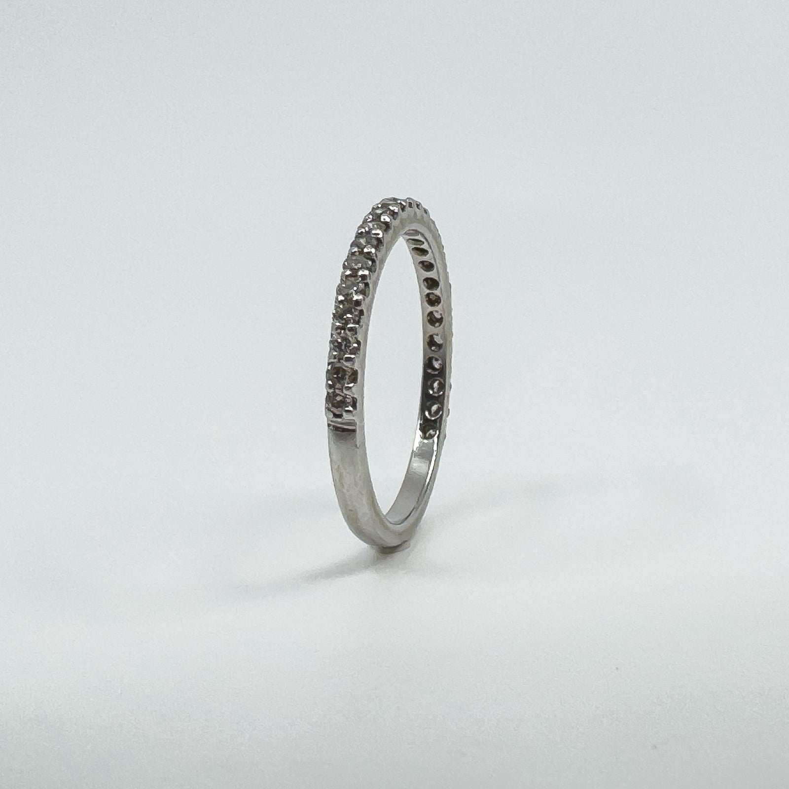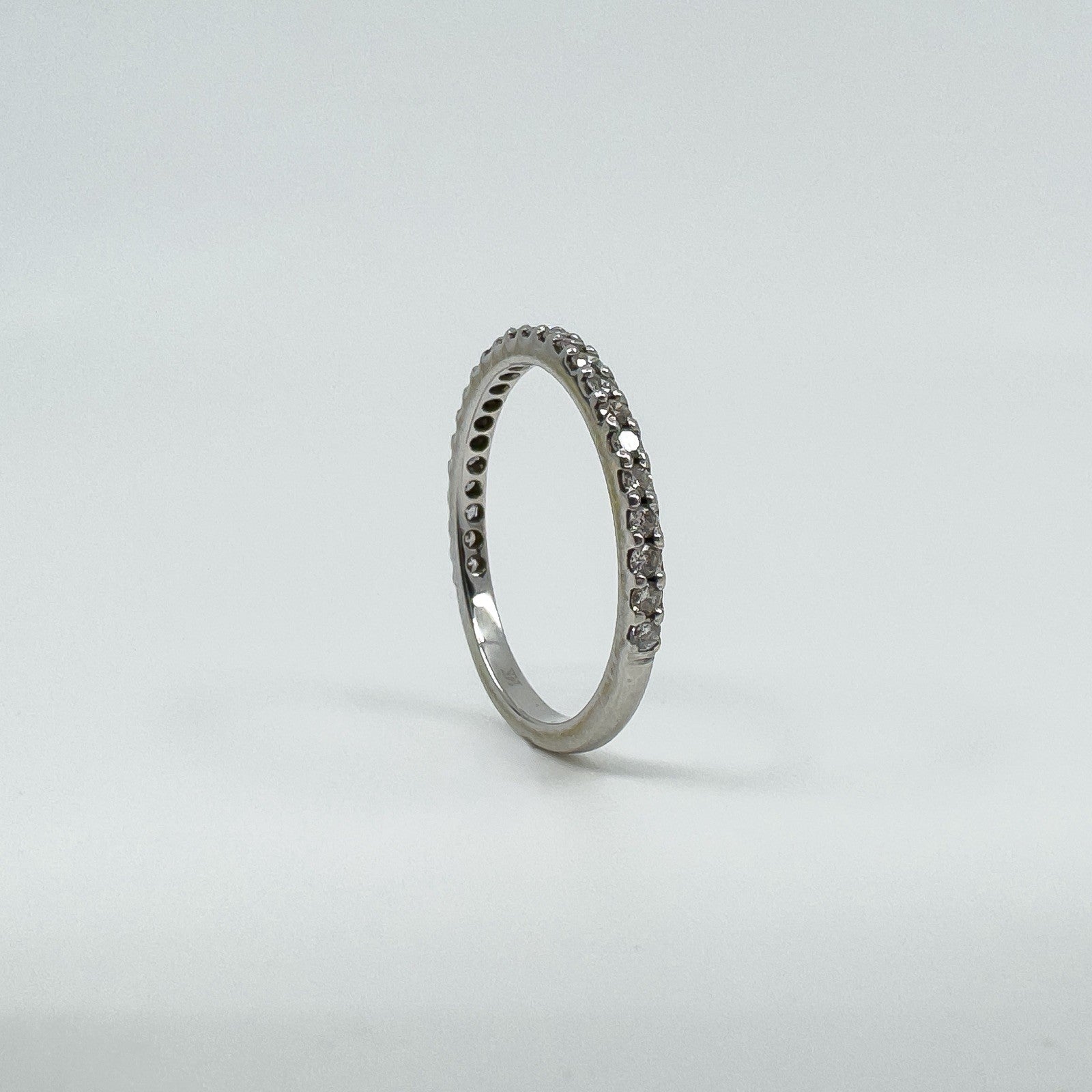 • 14ct white gold diamond three-quarter eternity band • Natural round diamonds (tested), est. total ≈0.35 ct • Prong set; low profile • Head measures approx. 18.9 × 1.9 mm • Band underside approx. 1.8 mm • Depth approx. 2 mm • Weight approx. 1.9 g • Ring size O • Stamped 14K