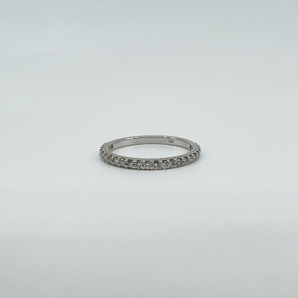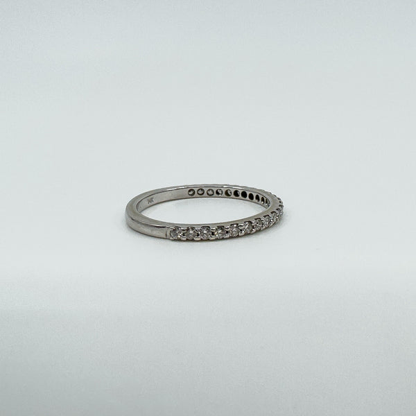 A 14ct white gold band set with natural round diamonds in prong settings around three quarters of the shank. Low profile on the finger.