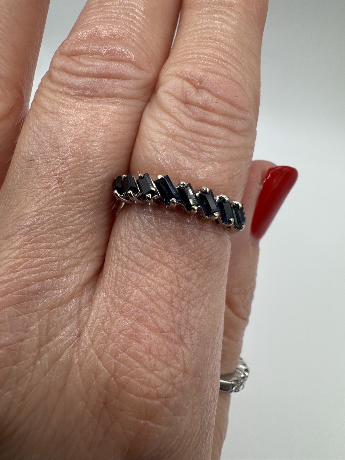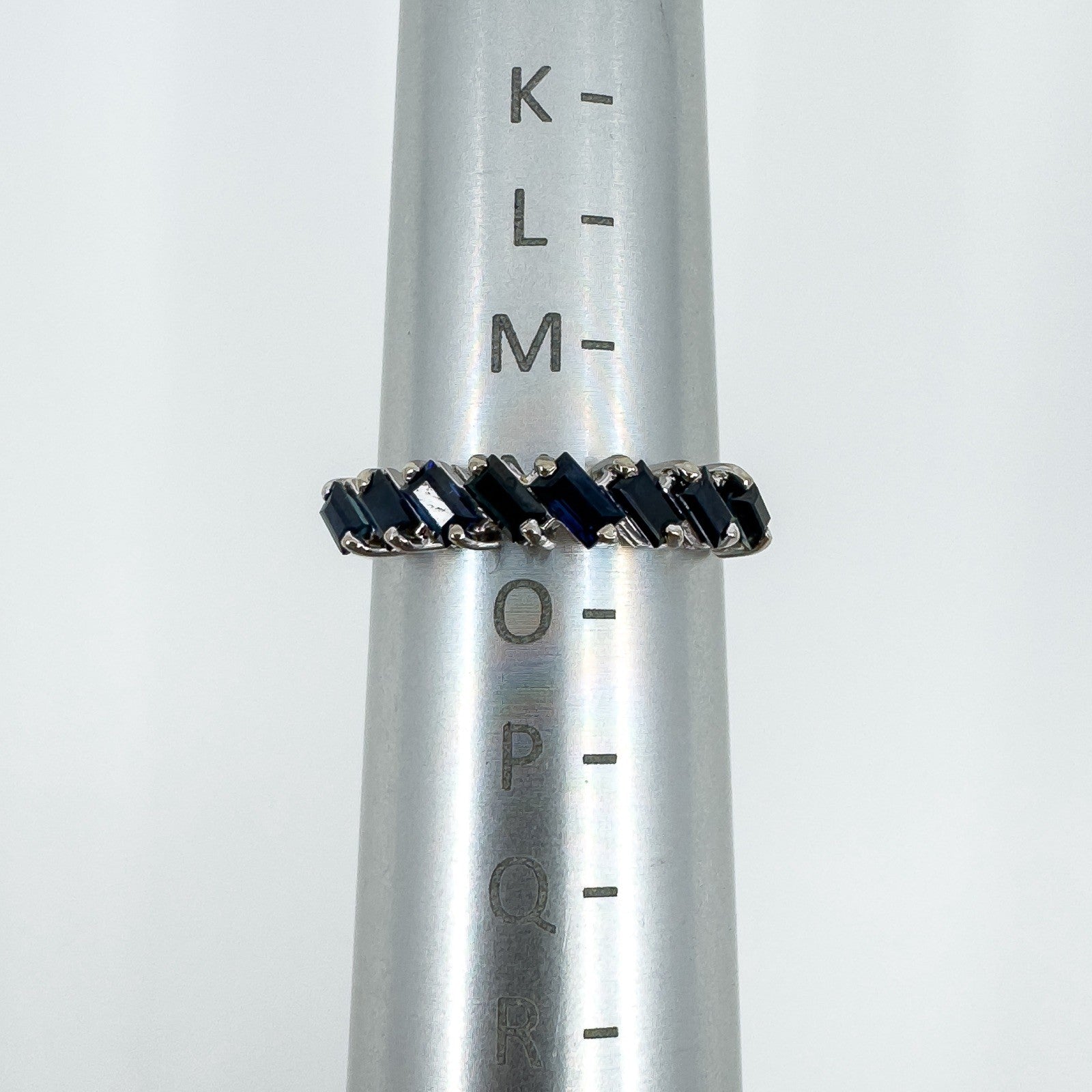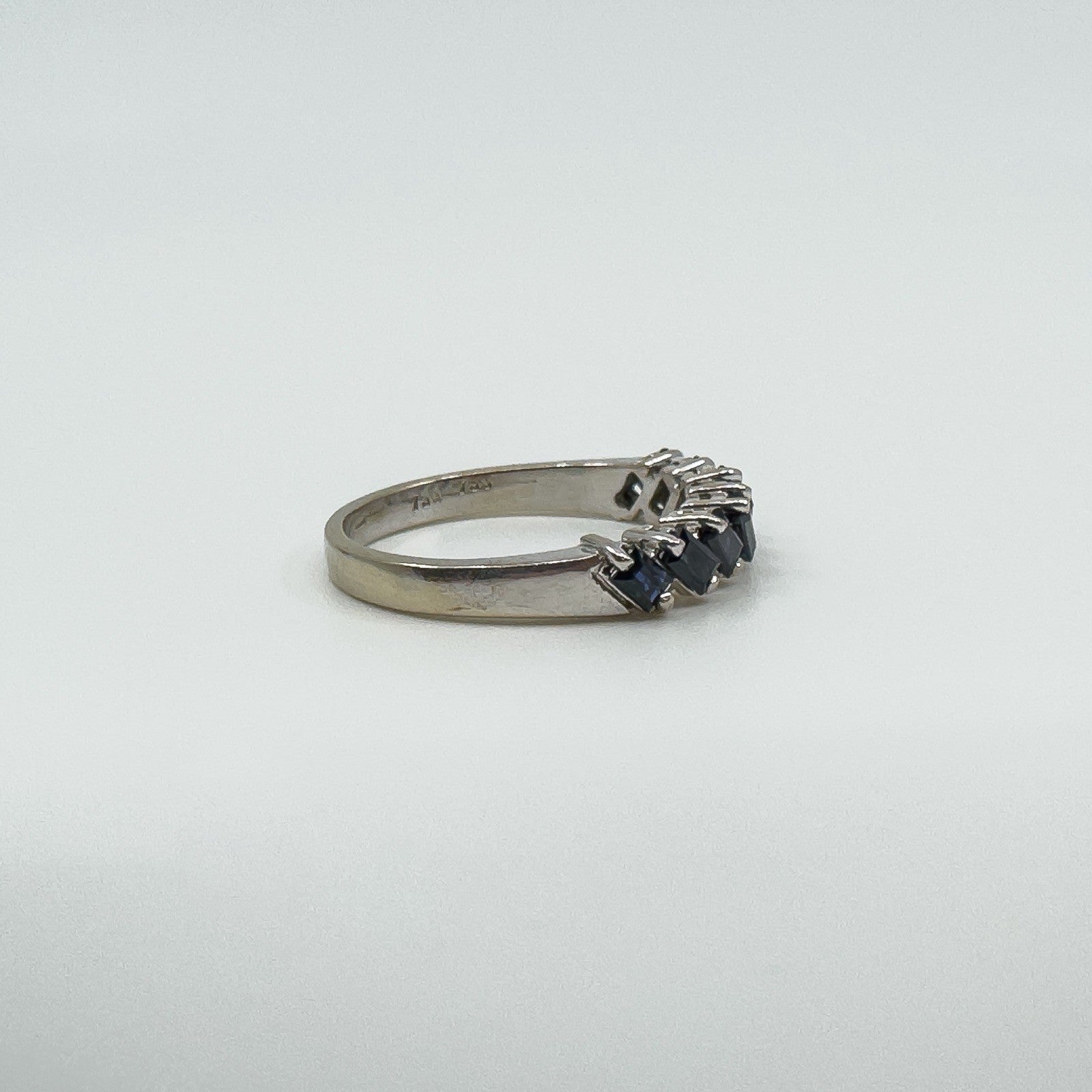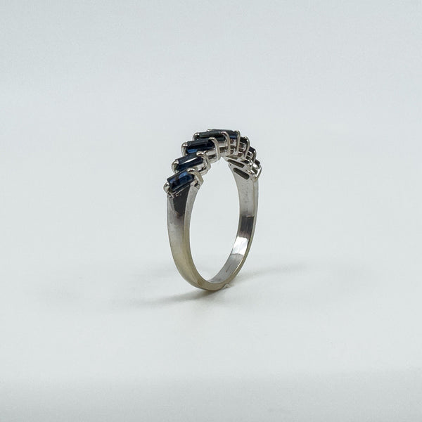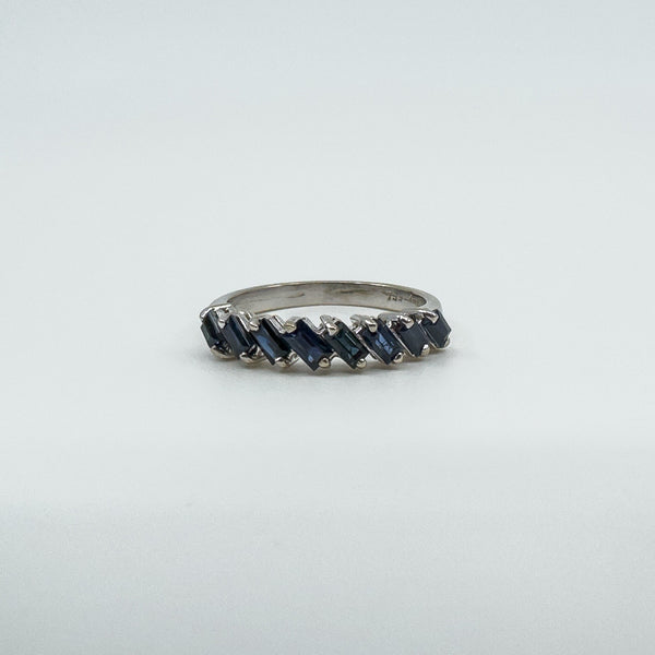 • 18ct white gold sapphire half eternity ring • Eight baguette-cut natural sapphires (est. ≈0.80 ct total) • Stamped 750 • Head measures approx. 20.6 × 4.2 mm • Depth approx. 3.4 mm • Band underside approx. 2.3 mm • Weight approx. 3 g • Ring size N