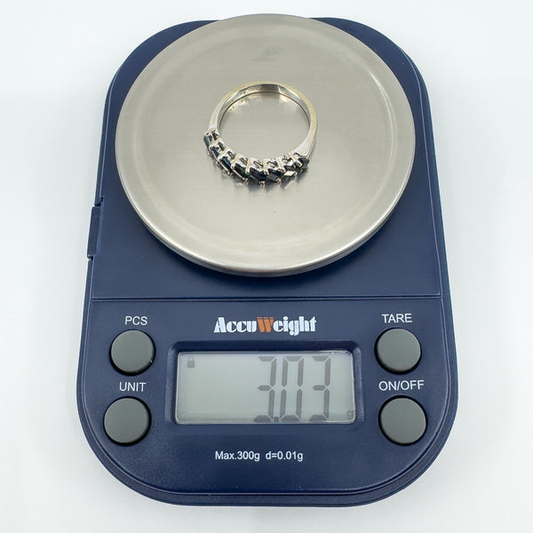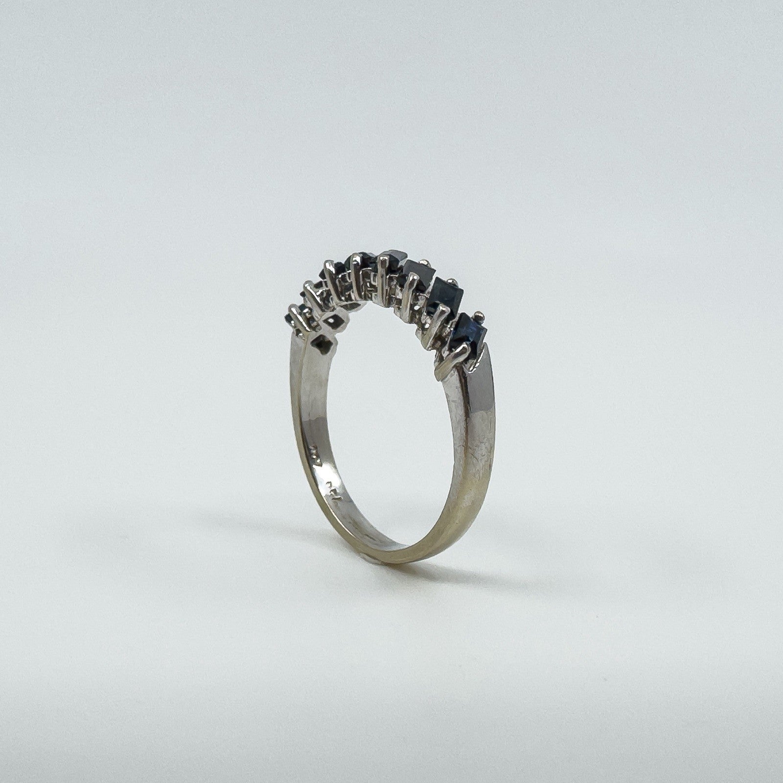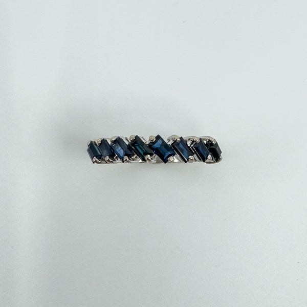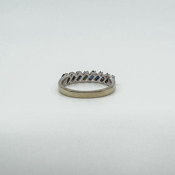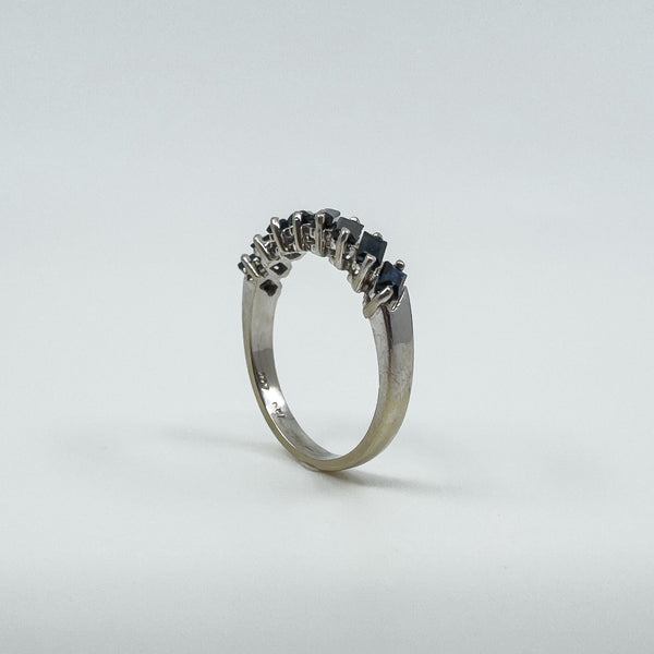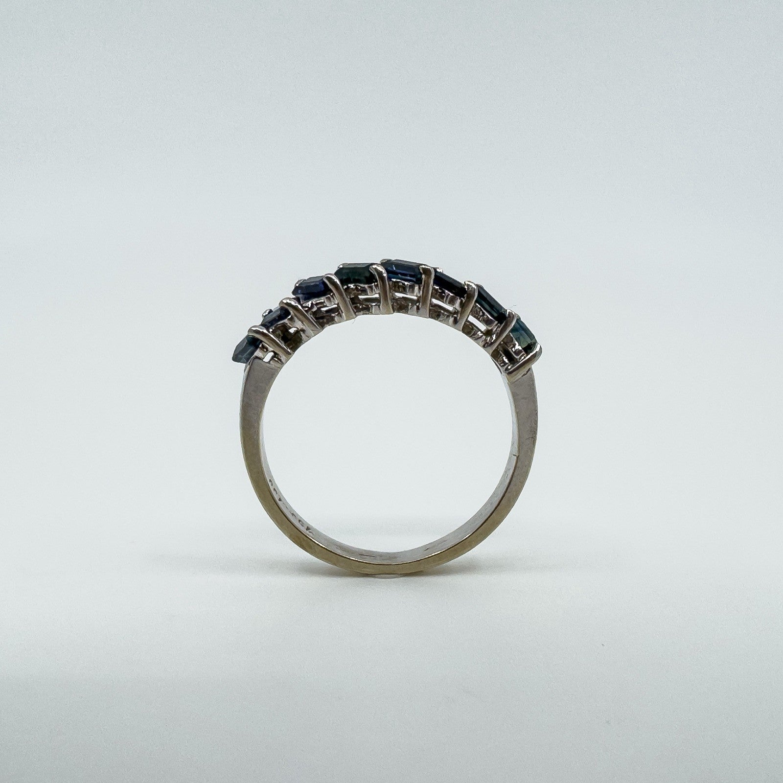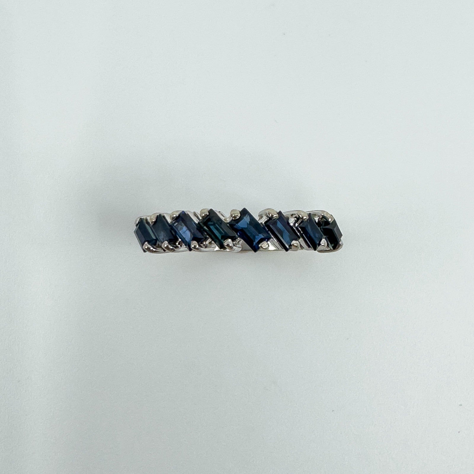 • 18ct white gold sapphire half eternity ring • Eight baguette-cut natural sapphires (est. ≈0.80 ct total) • Stamped 750 • Head measures approx. 20.6 × 4.2 mm • Depth approx. 3.4 mm • Band underside approx. 2.3 mm • Weight approx. 3 g • Ring size N