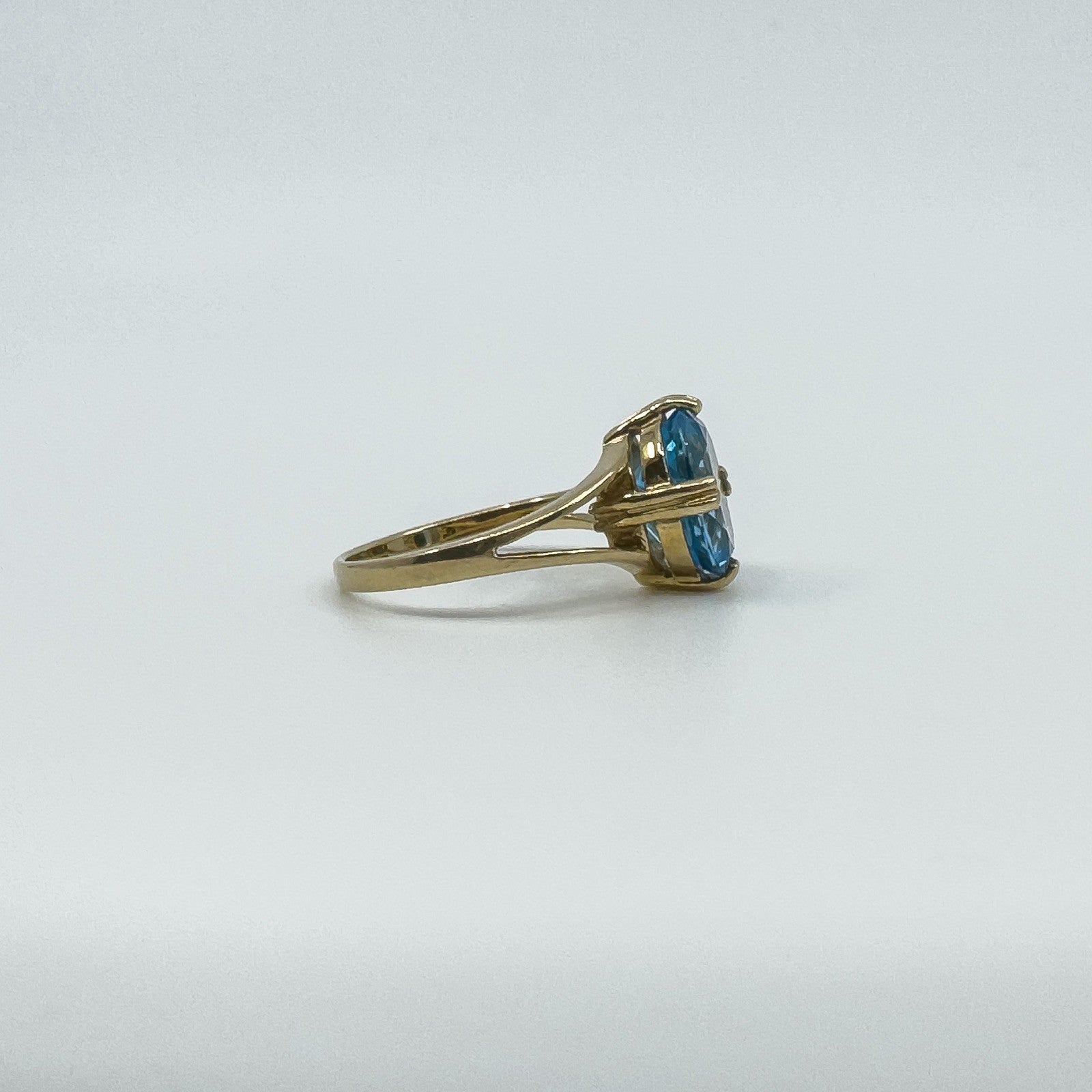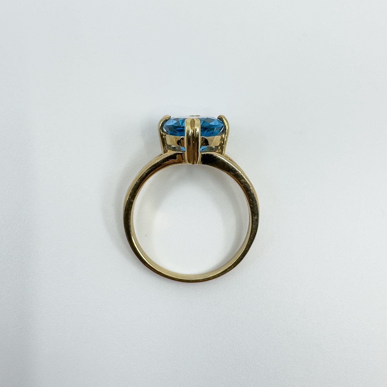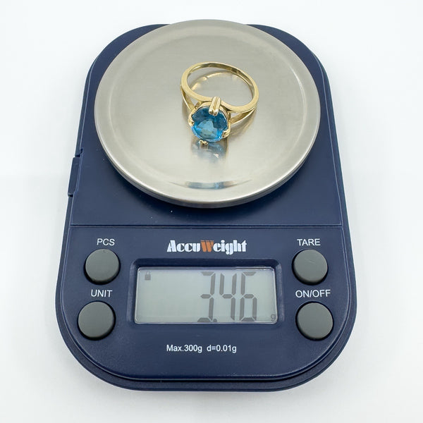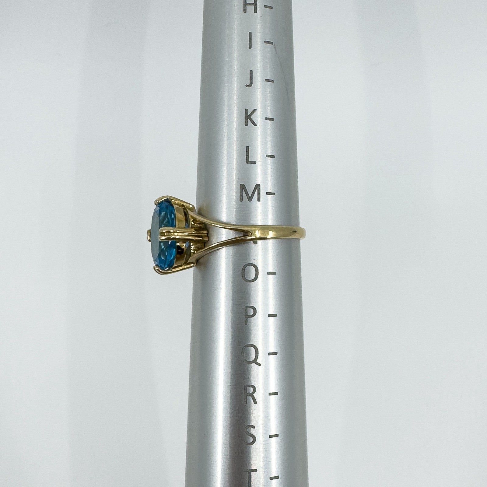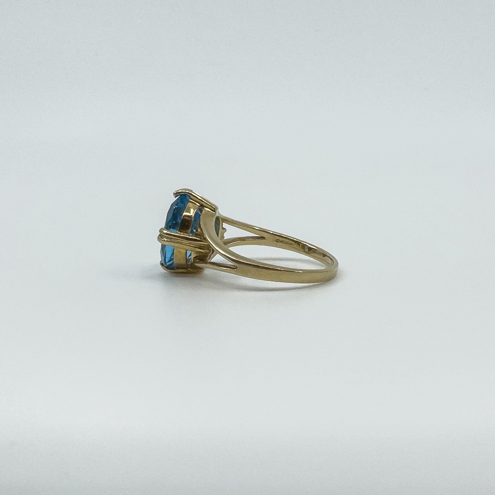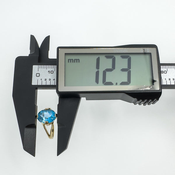 • 9ct yellow gold blue topaz solitaire ring • Oval blue topaz approx. 10.5 × 8.3 mm (est. ≈2.50 ct) • Prong setting • Head measures approx. 12.1 × 10.2 mm • Depth approx. 7 mm (high setting) • Band underside approx. 1.7 mm • Weight approx. 3.4 g • Ring size N • Hallmarked DK; 375; Anchor; date letter g (Birmingham 2006)