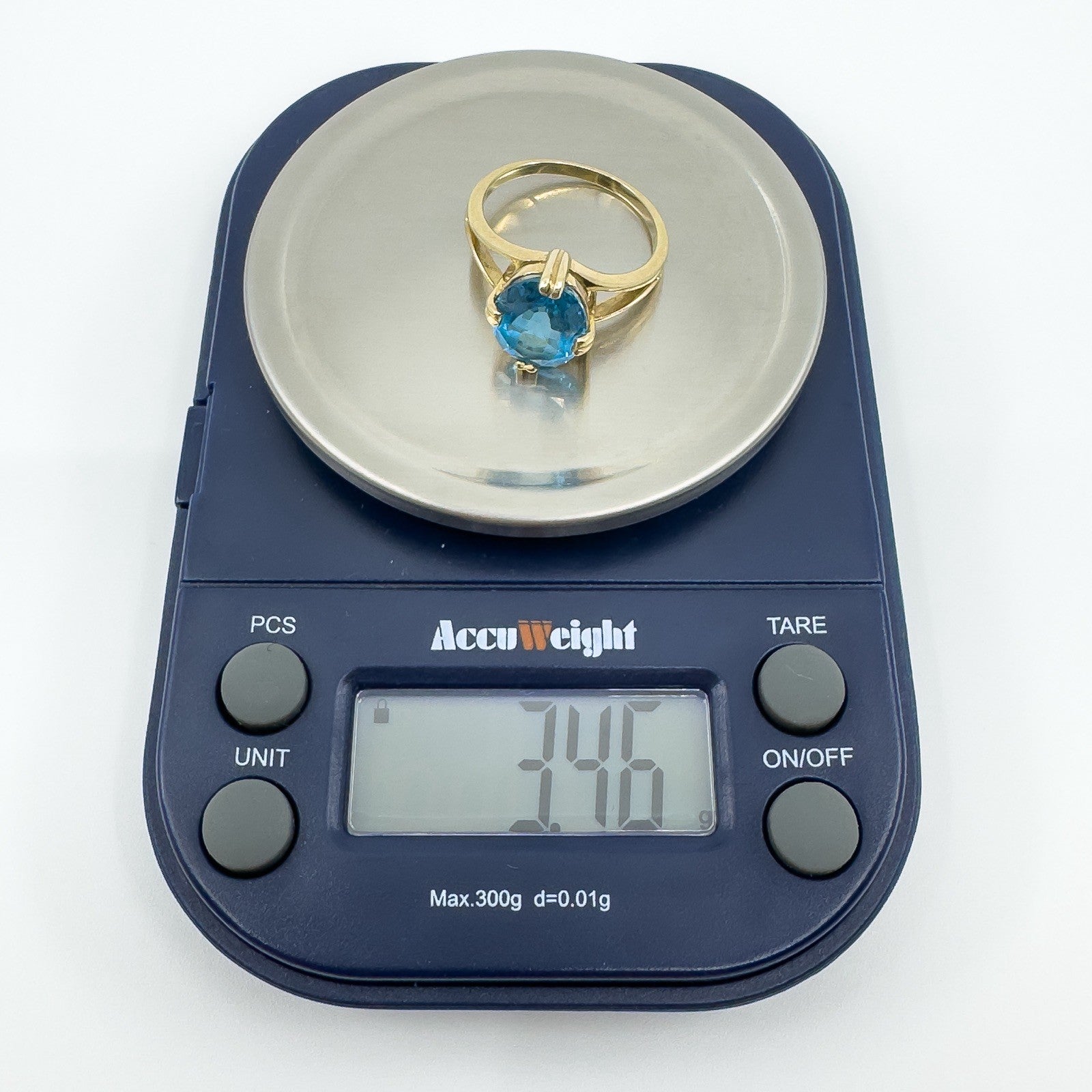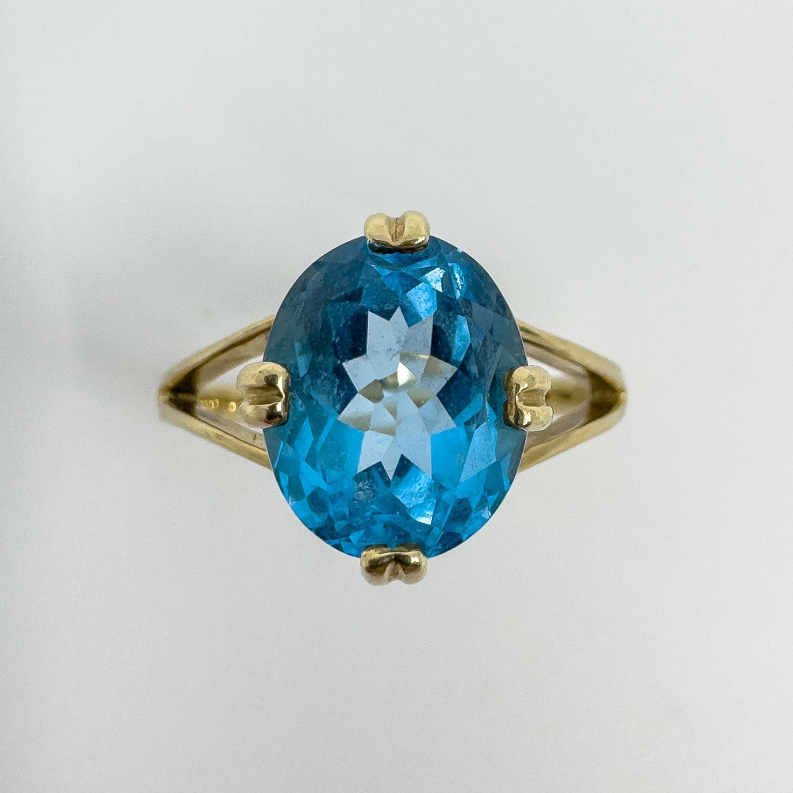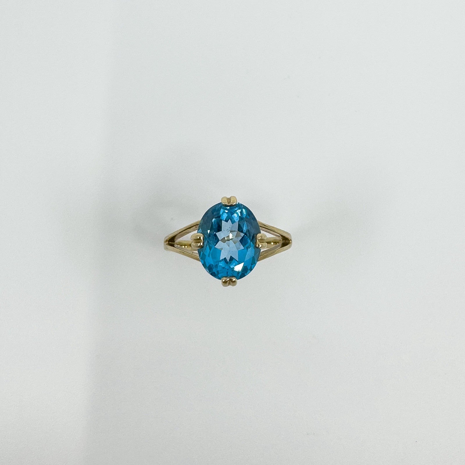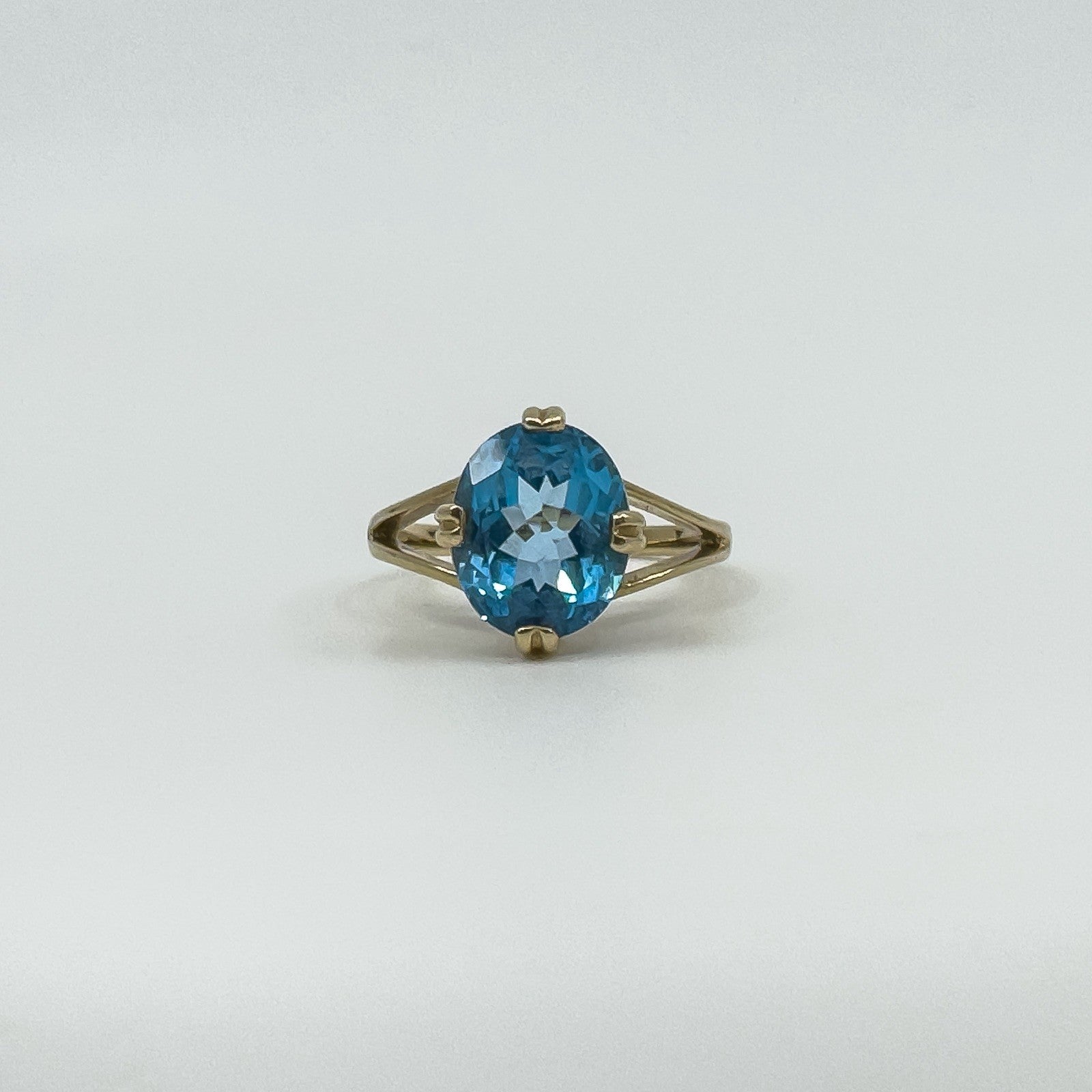 • 9ct yellow gold blue topaz solitaire ring • Oval blue topaz approx. 10.5 × 8.3 mm (est. ≈2.50 ct) • Prong setting • Head measures approx. 12.1 × 10.2 mm • Depth approx. 7 mm (high setting) • Band underside approx. 1.7 mm • Weight approx. 3.4 g • Ring size N • Hallmarked DK; 375; Anchor; date letter g (Birmingham 2006)