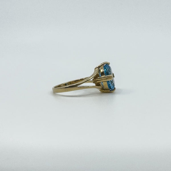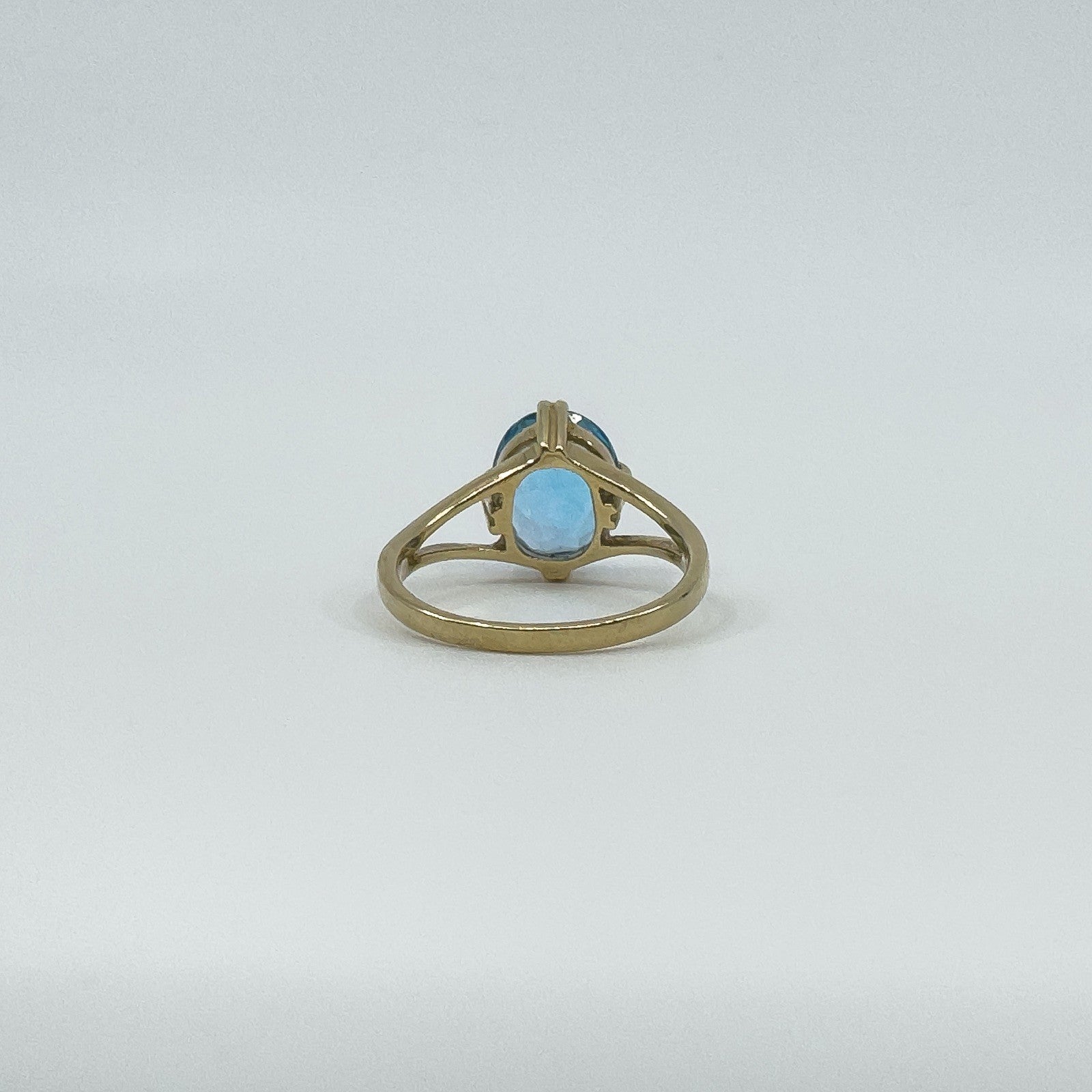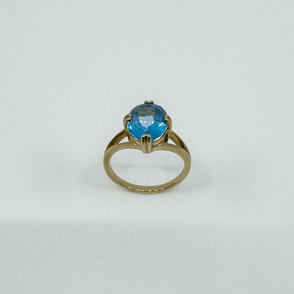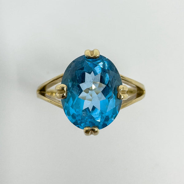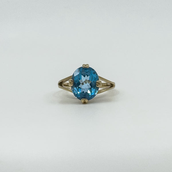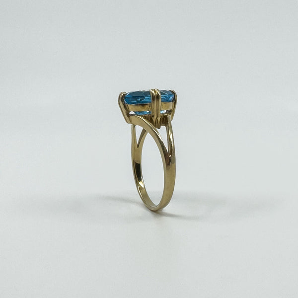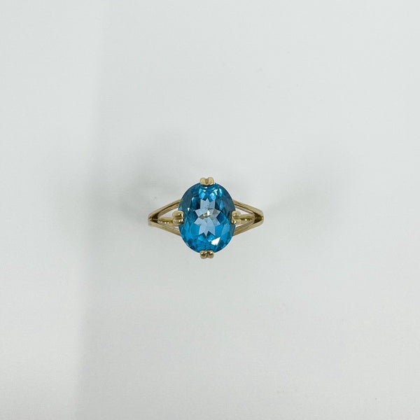 A 9ct yellow gold ring set with an oval blue topaz. Bright colour and a neat shape that wears well on its own or stacked.
