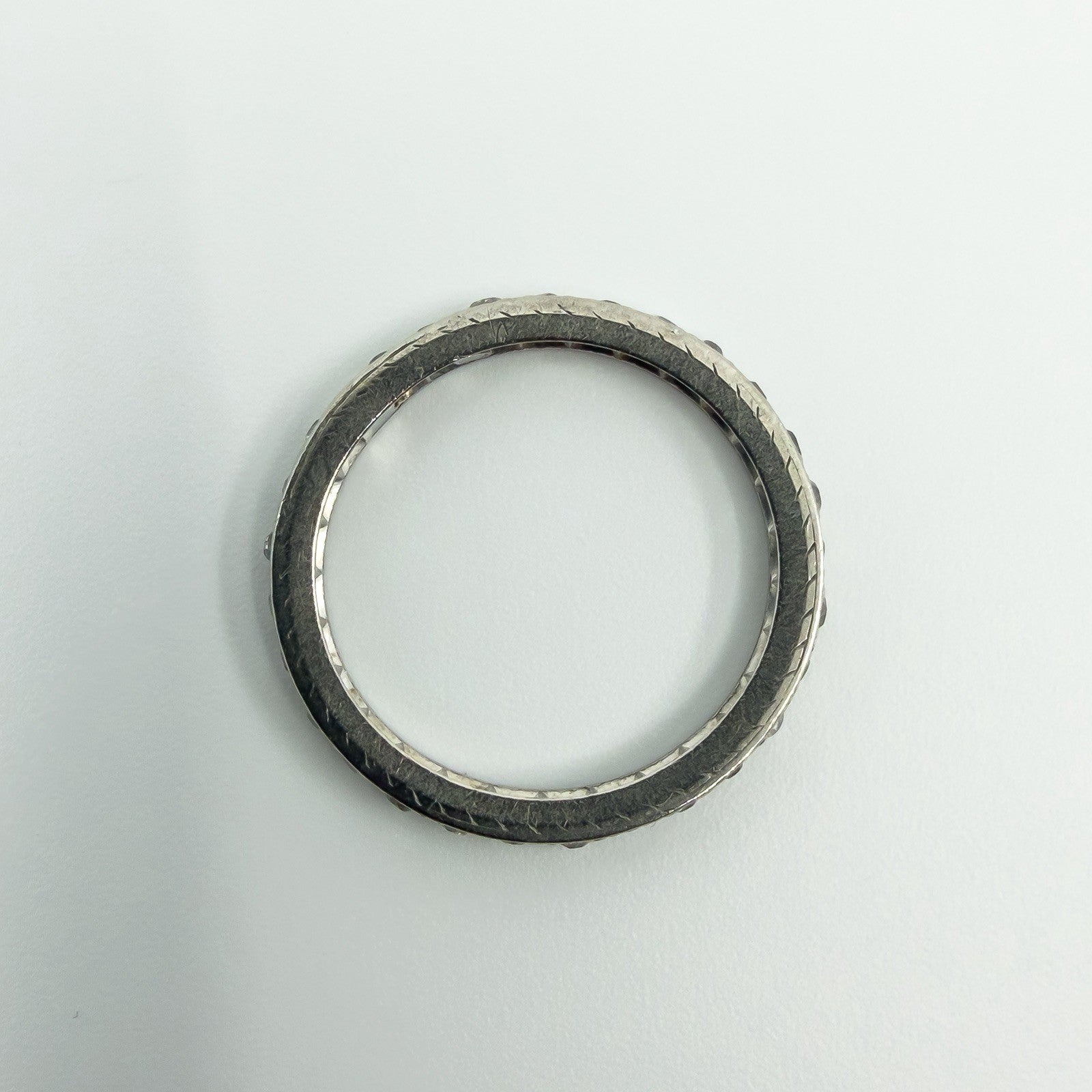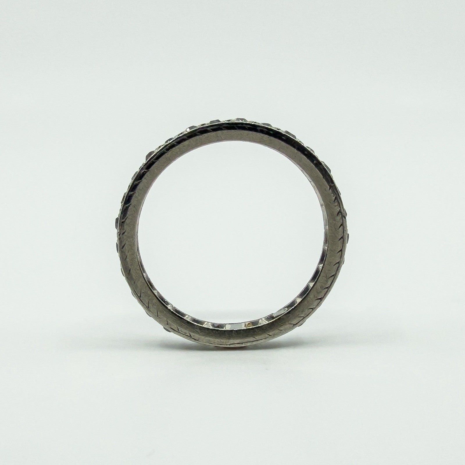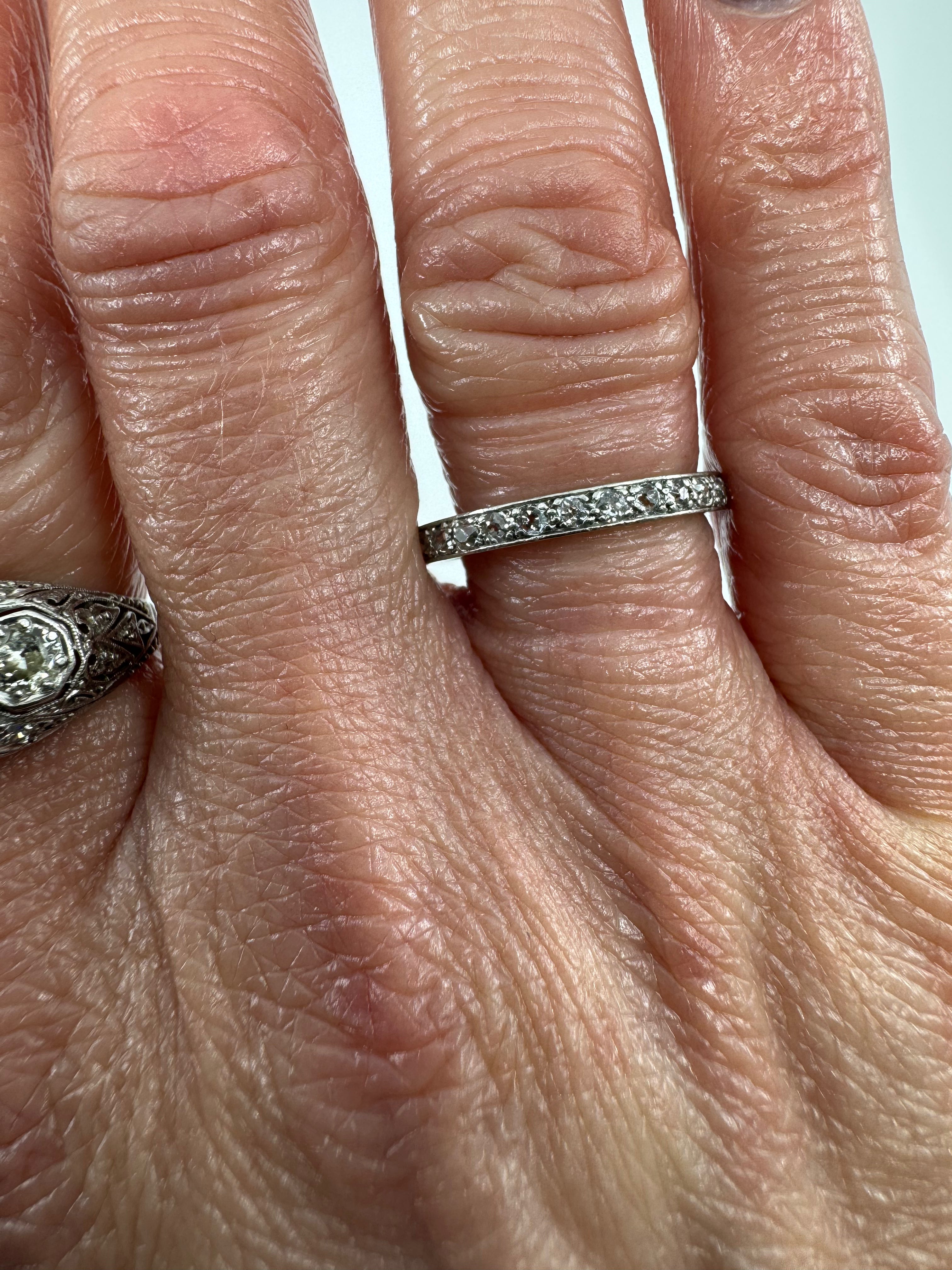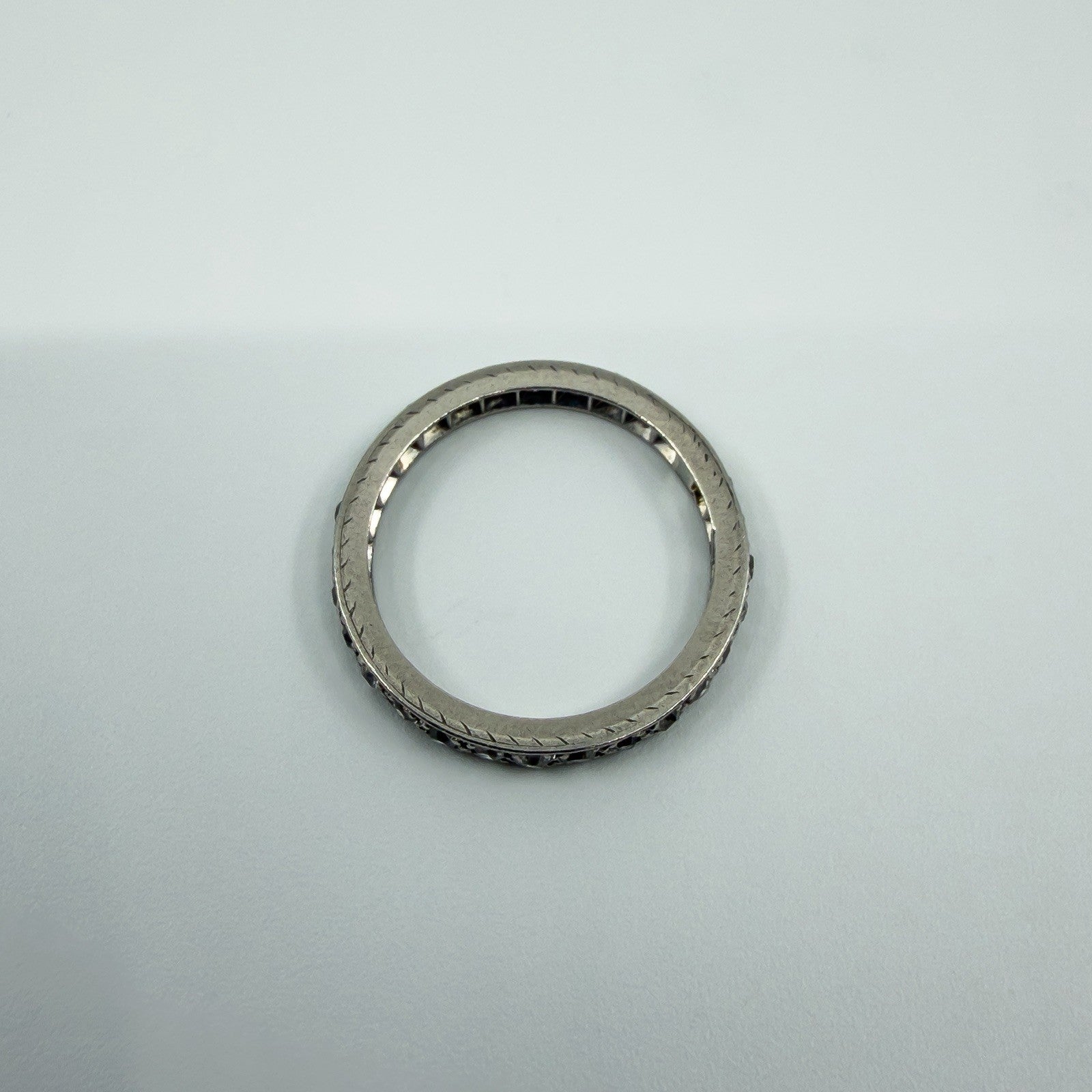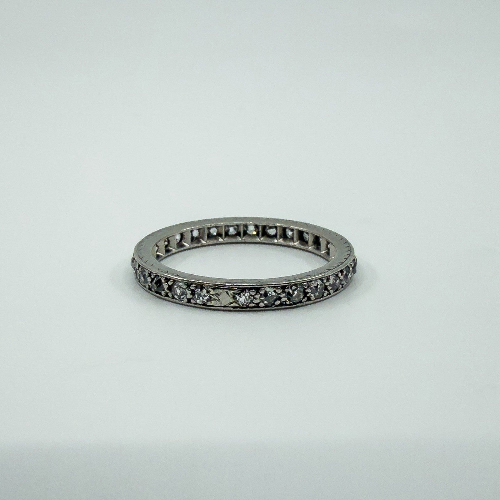 • Item: Antique diamond full eternity band • Metal: Platinum (tested, not stamped) • Diamonds: 28 old cut natural diamonds (tested) • Note: 1 blank plate, barely noticeable • Ring size: Size M • Resizing: Not resizable • Band size: Approx. 2.4mm x 1.9mm • Weight: Approx. 3g