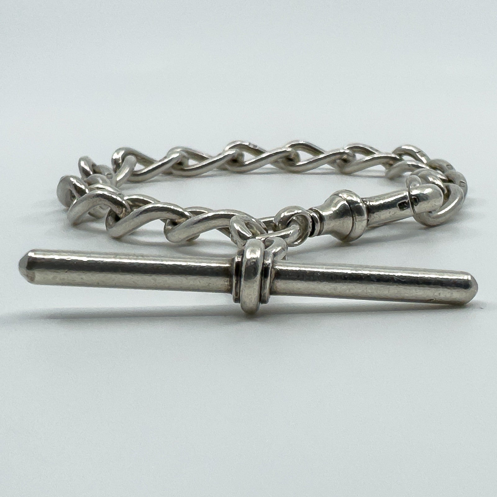 An antique chunky oval link bracelet in sterling silver, finished with a large swivel dog clip and an oversized T-bar charm.