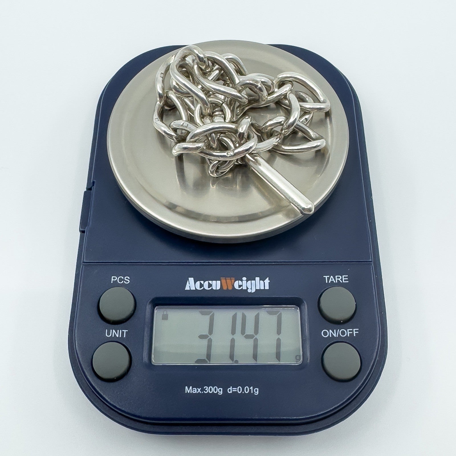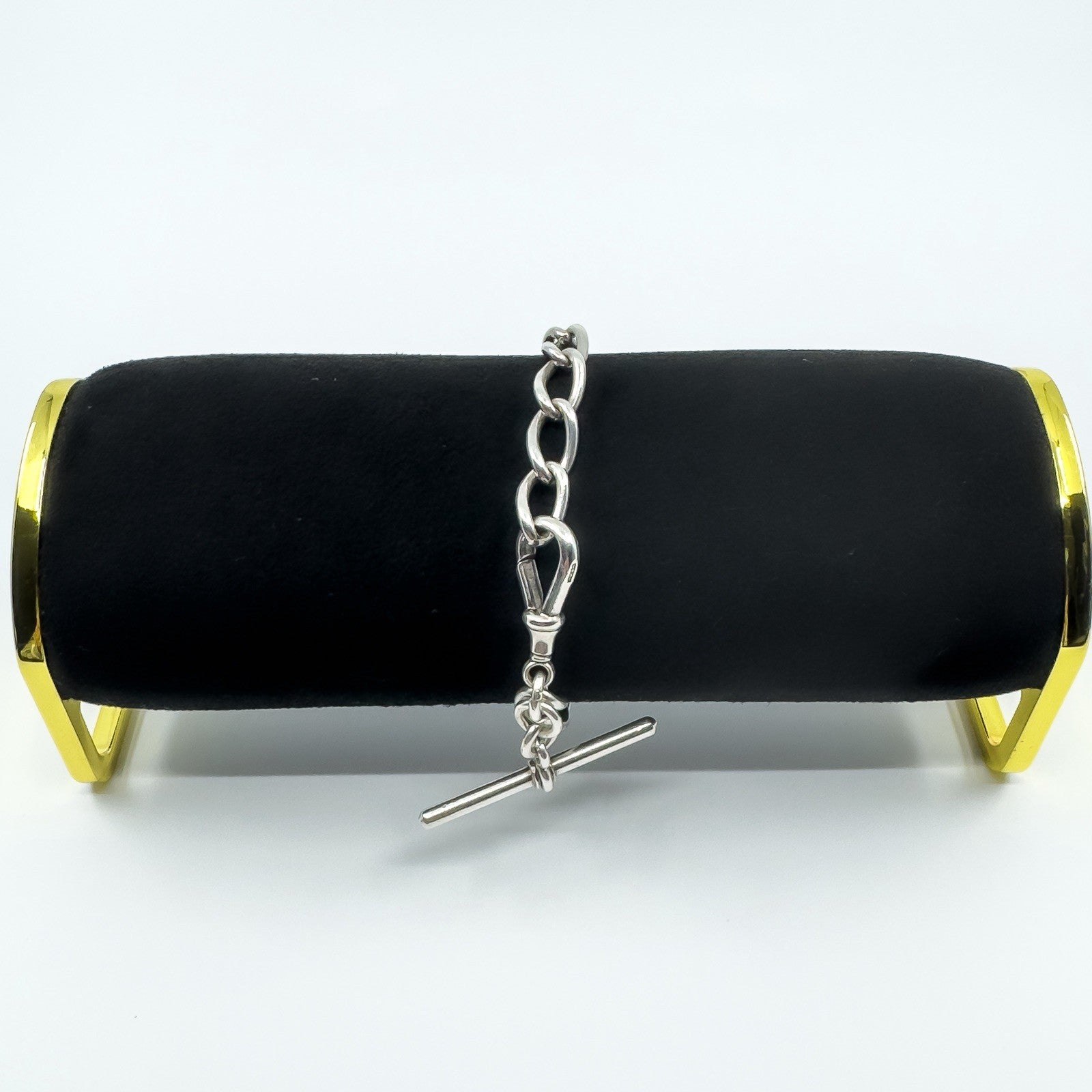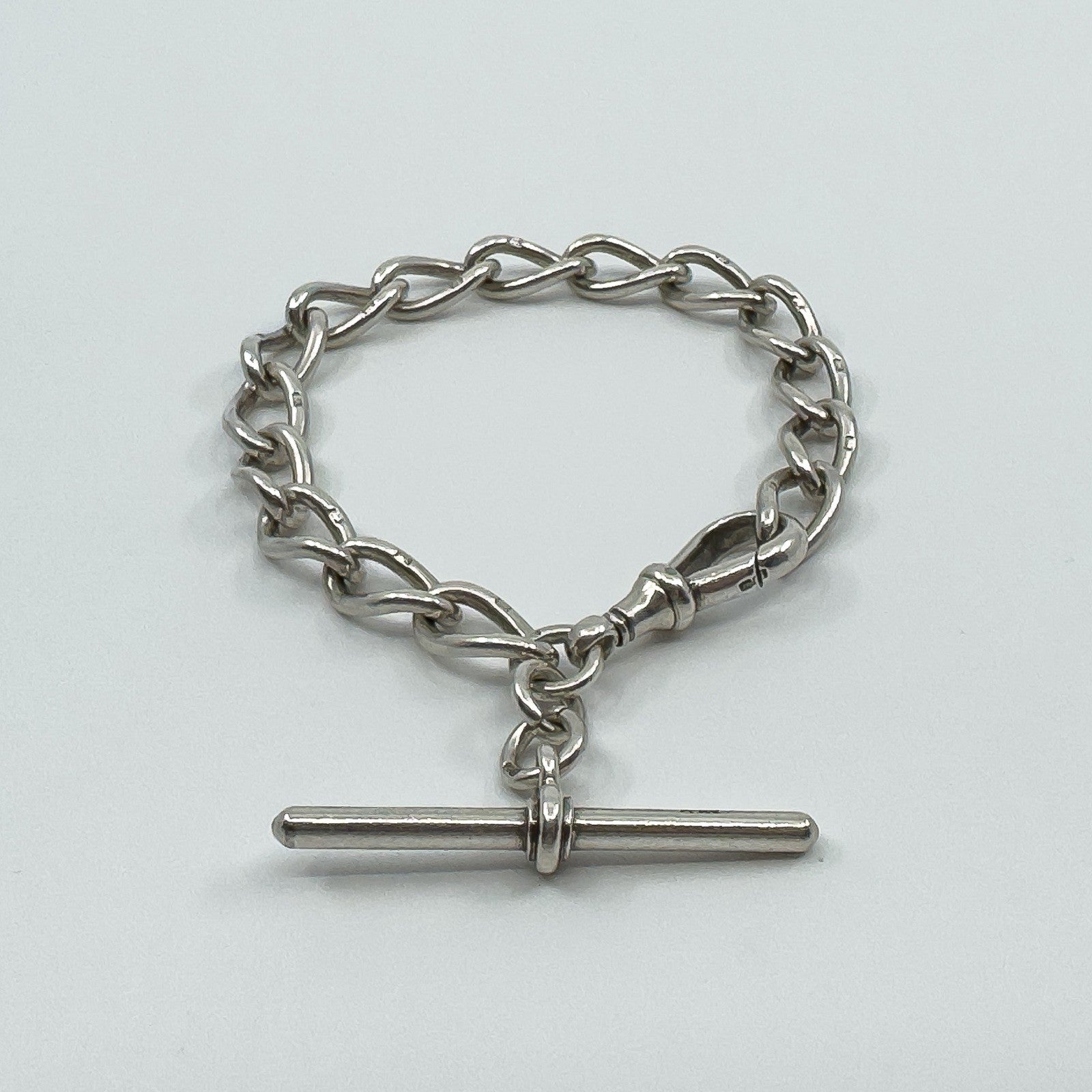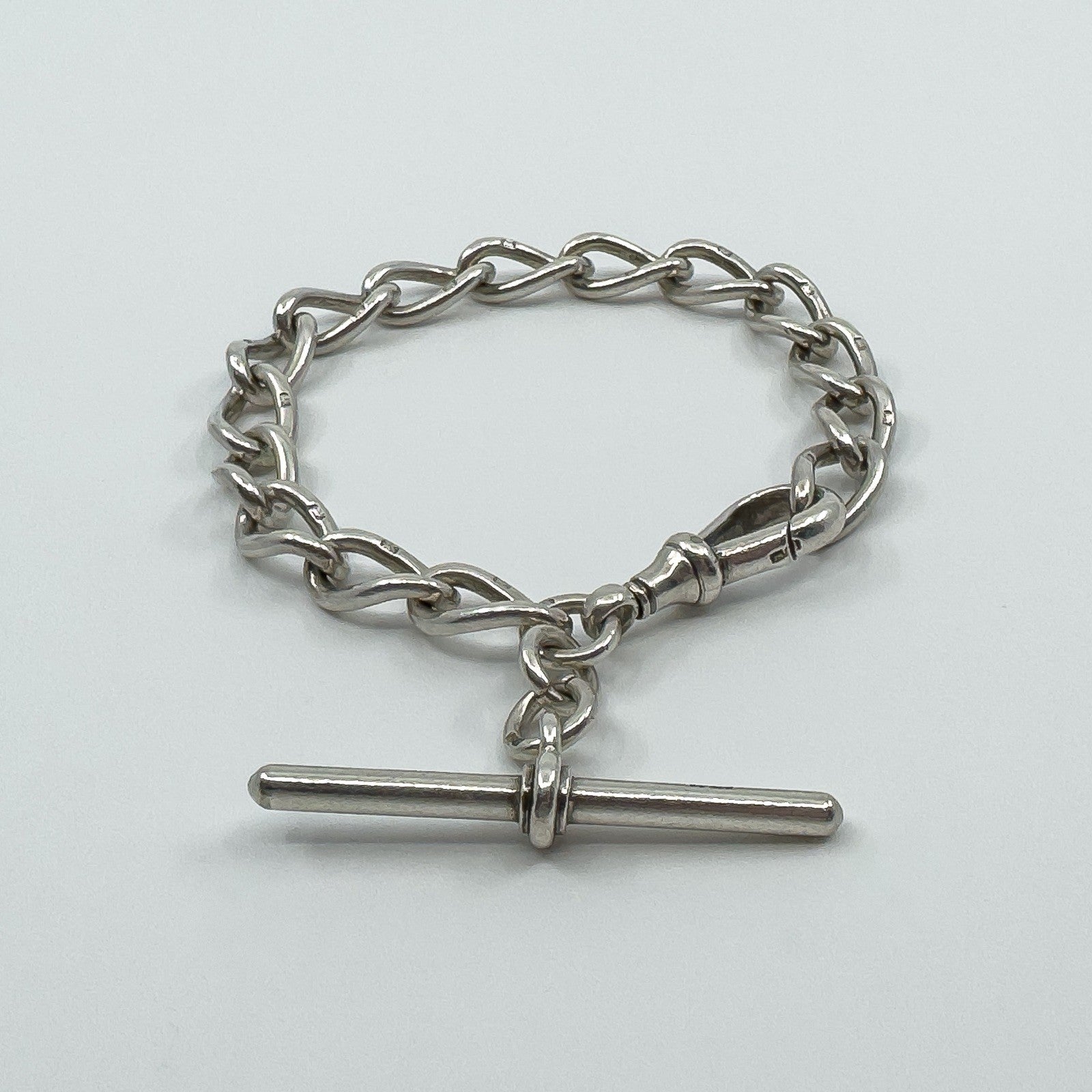 • Antique sterling silver chunky oval link bracelet • Large swivel dog clip and large T-bar charm • Stamped HF&S, lion passant, lion and n • Bracelet length approx. 8 inches • Fits approx. 8 to 9 inch wrist • Links approx. 8.9 x 2.3 mm • T-bar approx. 44.8 x 3.4 mm • Dog clip length approx. 27.9 mm • Weight approx. 31.4 g