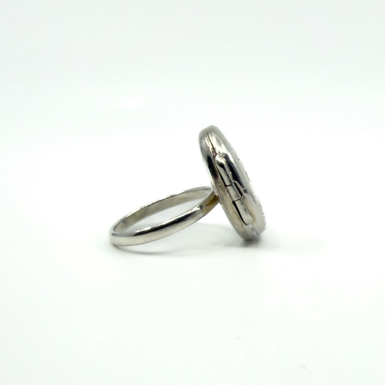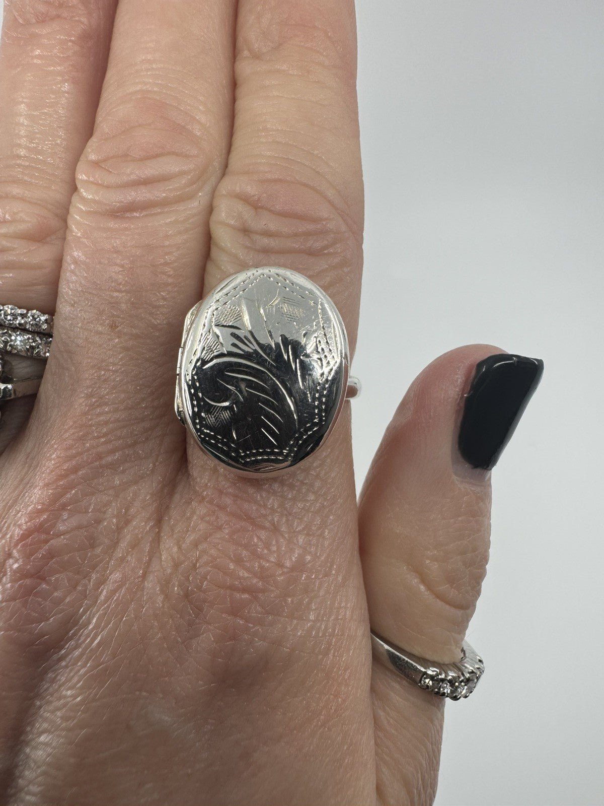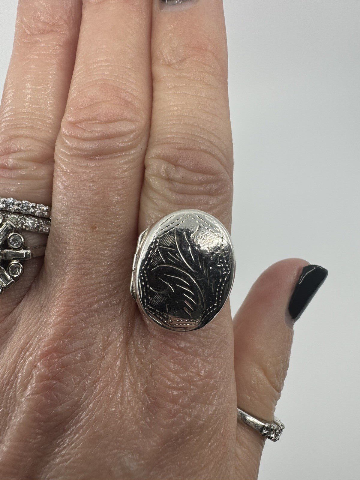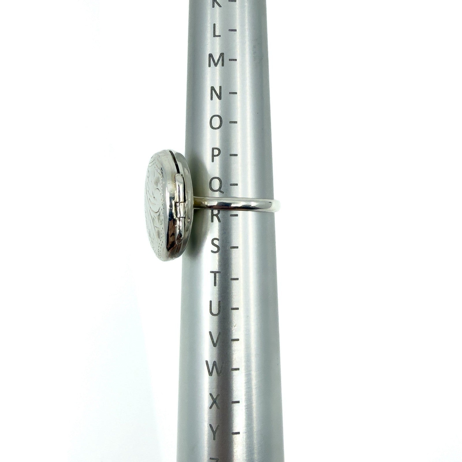 • Item: Vintage sterling silver secret locket ring• Metal: Sterling silver (stamped 925)• Design: Engraved foliate lid• Feature: Hinged locket with space for 2 photos or a tiny keepsake• Measurements: Head approx. 21.9mm x 17.7mm• Band width: Approx. 2.3mm• Depth: Approx. 7.2mm• Weight: Approx. 5.7g• Size: Size Q - R