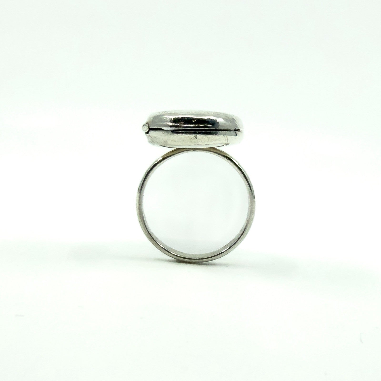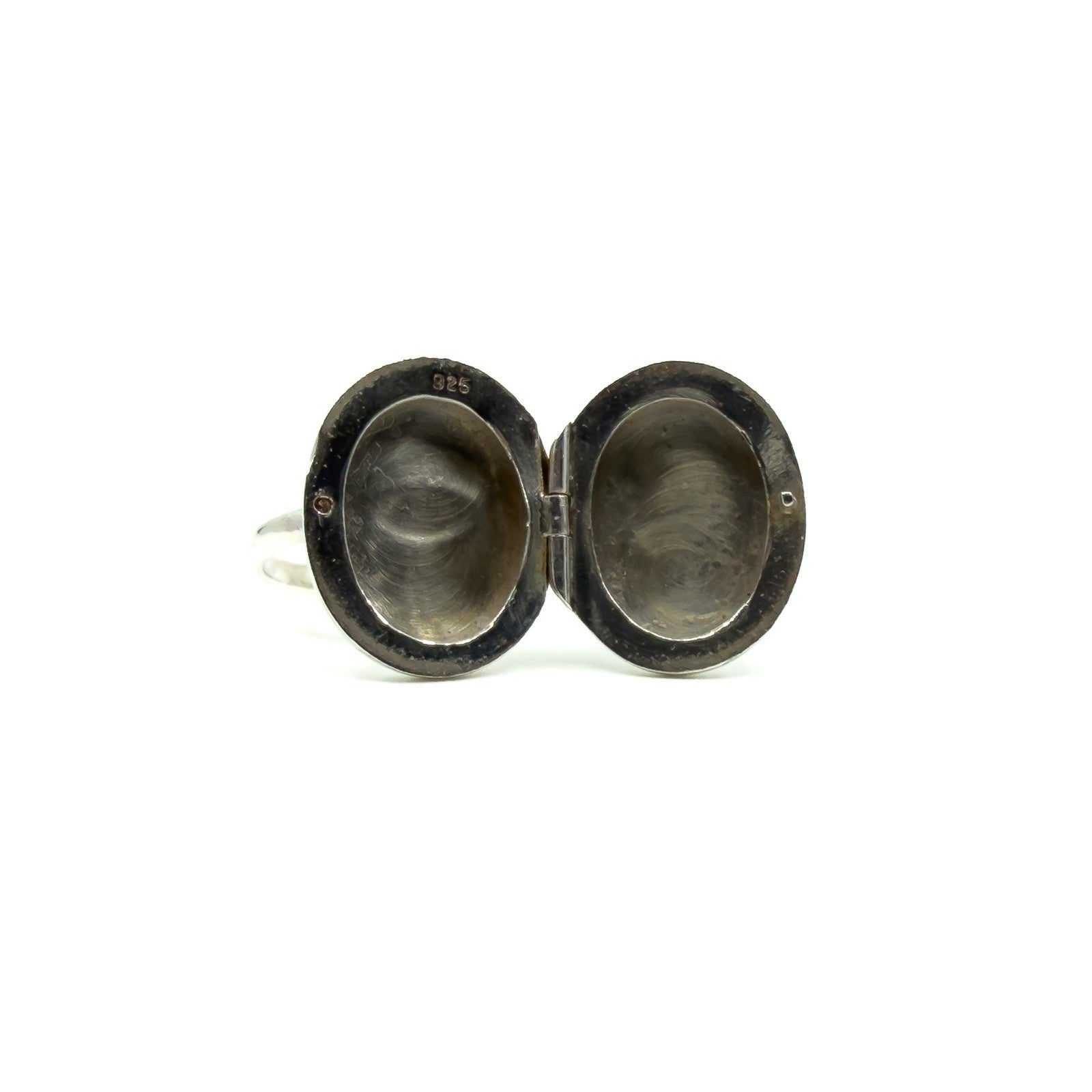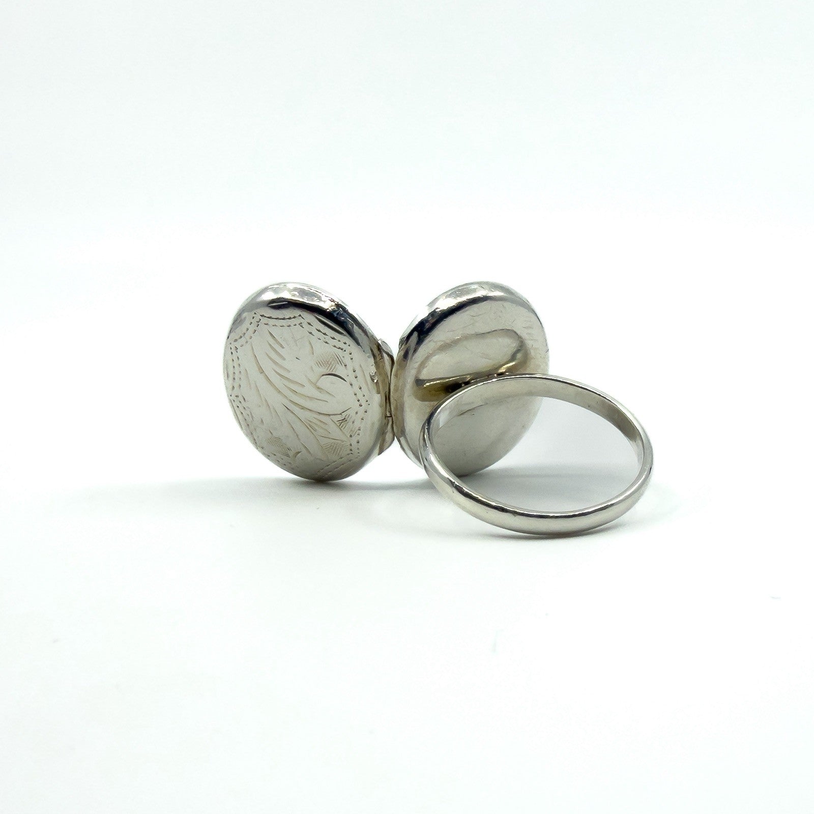 • Item: Vintage sterling silver secret locket ring• Metal: Sterling silver (stamped 925)• Design: Engraved foliate lid• Feature: Hinged locket with space for 2 photos or a tiny keepsake• Measurements: Head approx. 21.9mm x 17.7mm• Band width: Approx. 2.3mm• Depth: Approx. 7.2mm• Weight: Approx. 5.7g• Size: Size Q - R
