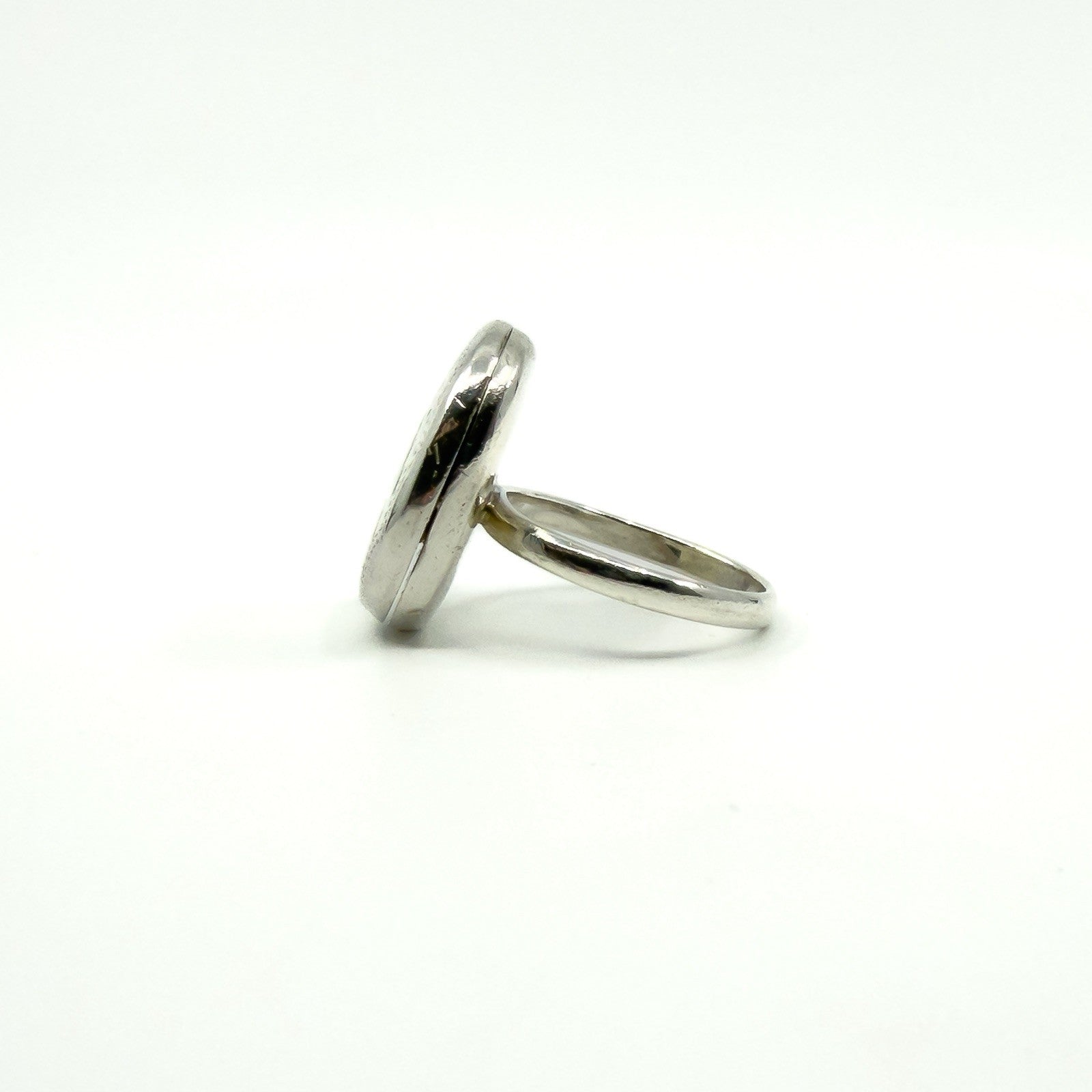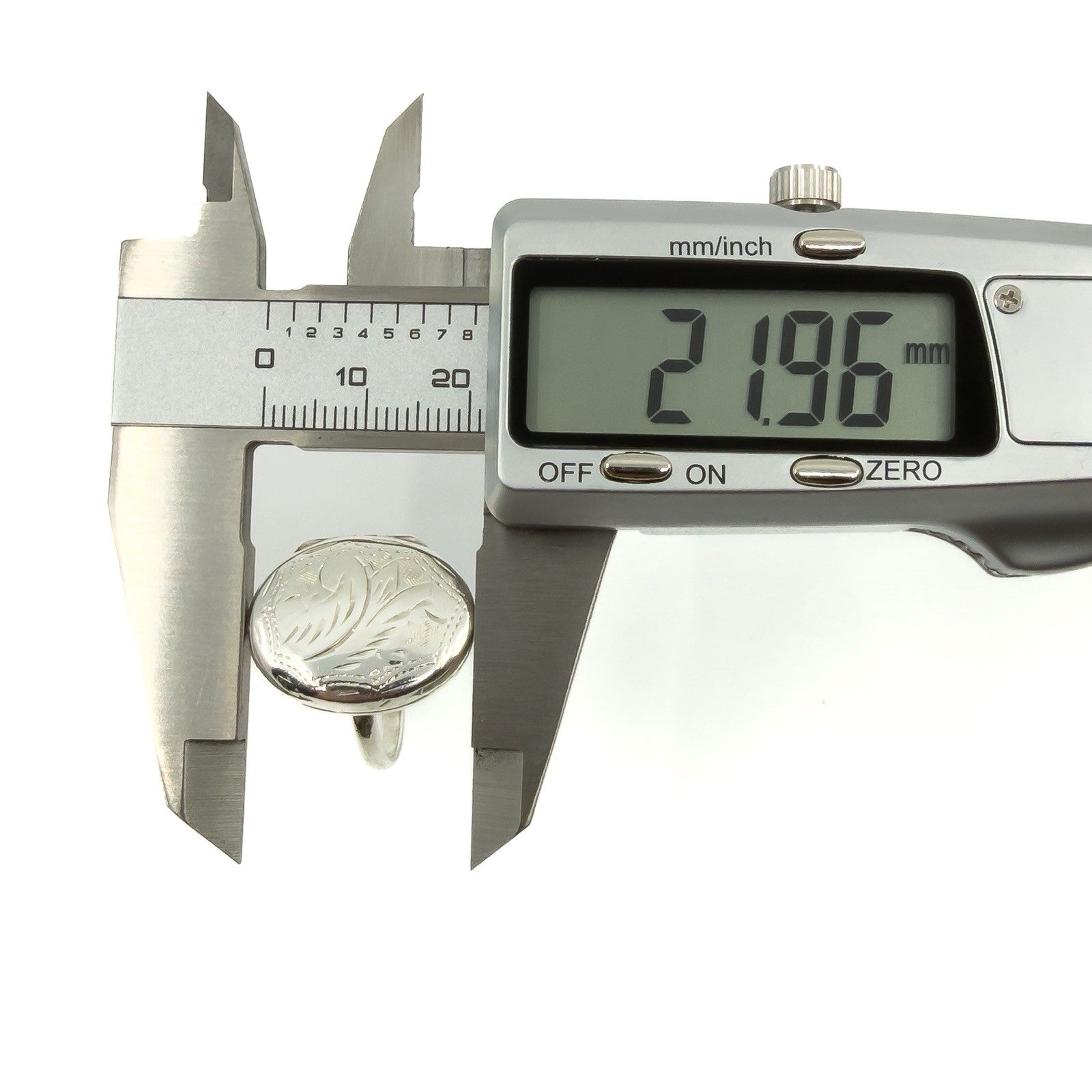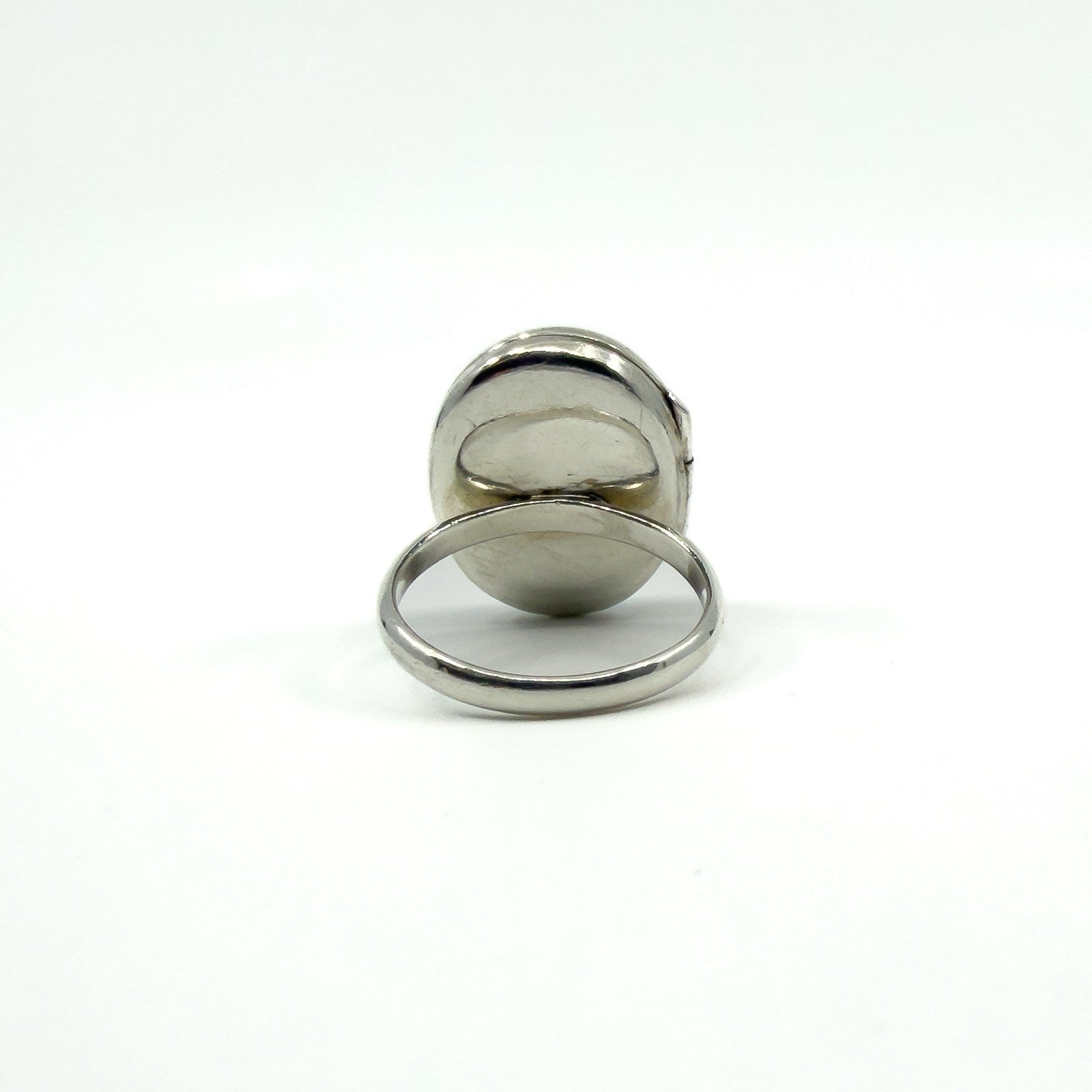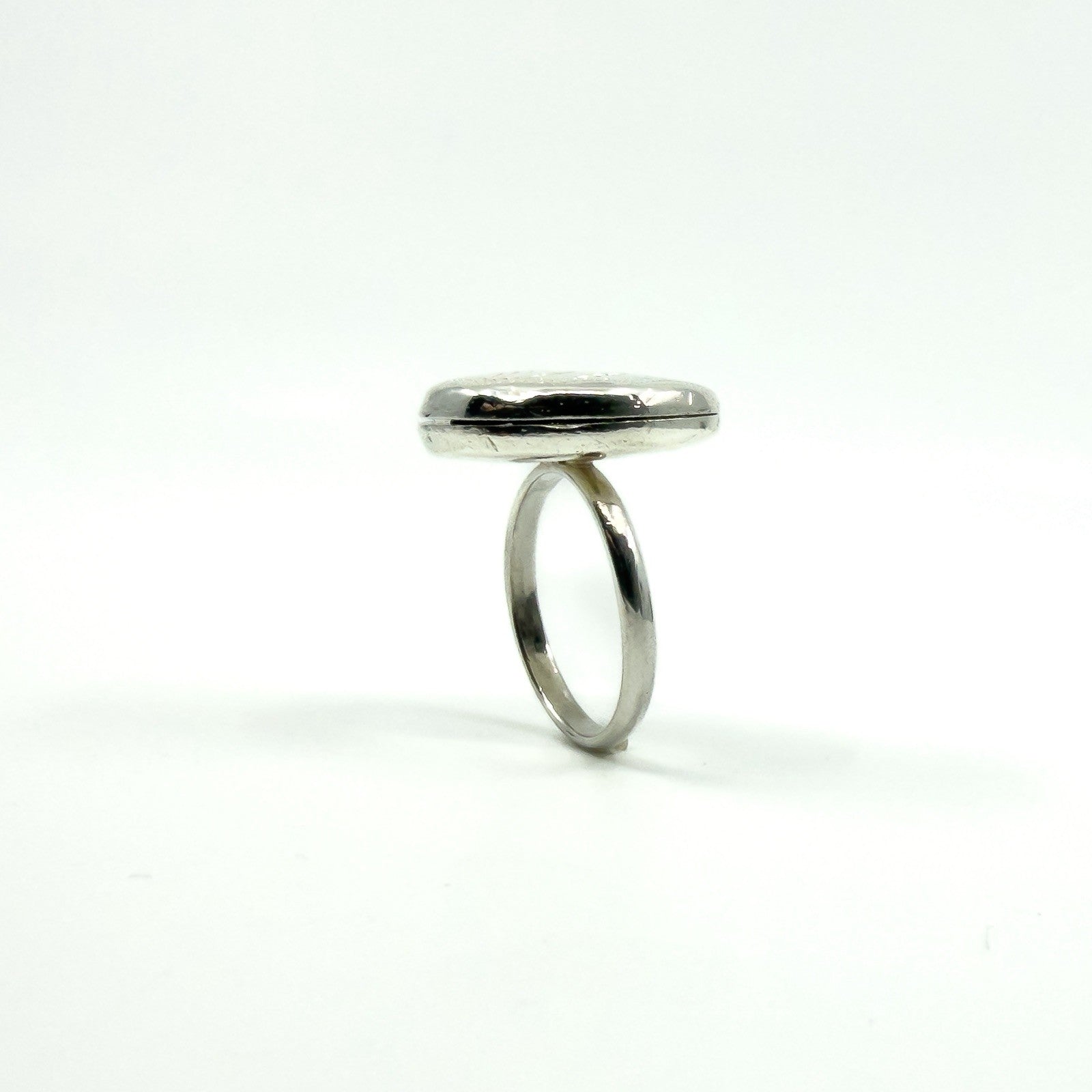 • Item: Vintage sterling silver secret locket ring• Metal: Sterling silver (stamped 925)• Design: Engraved foliate lid• Feature: Hinged locket with space for 2 photos or a tiny keepsake• Measurements: Head approx. 21.9mm x 17.7mm• Band width: Approx. 2.3mm• Depth: Approx. 7.2mm• Weight: Approx. 5.7g• Size: Size Q - R