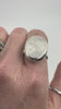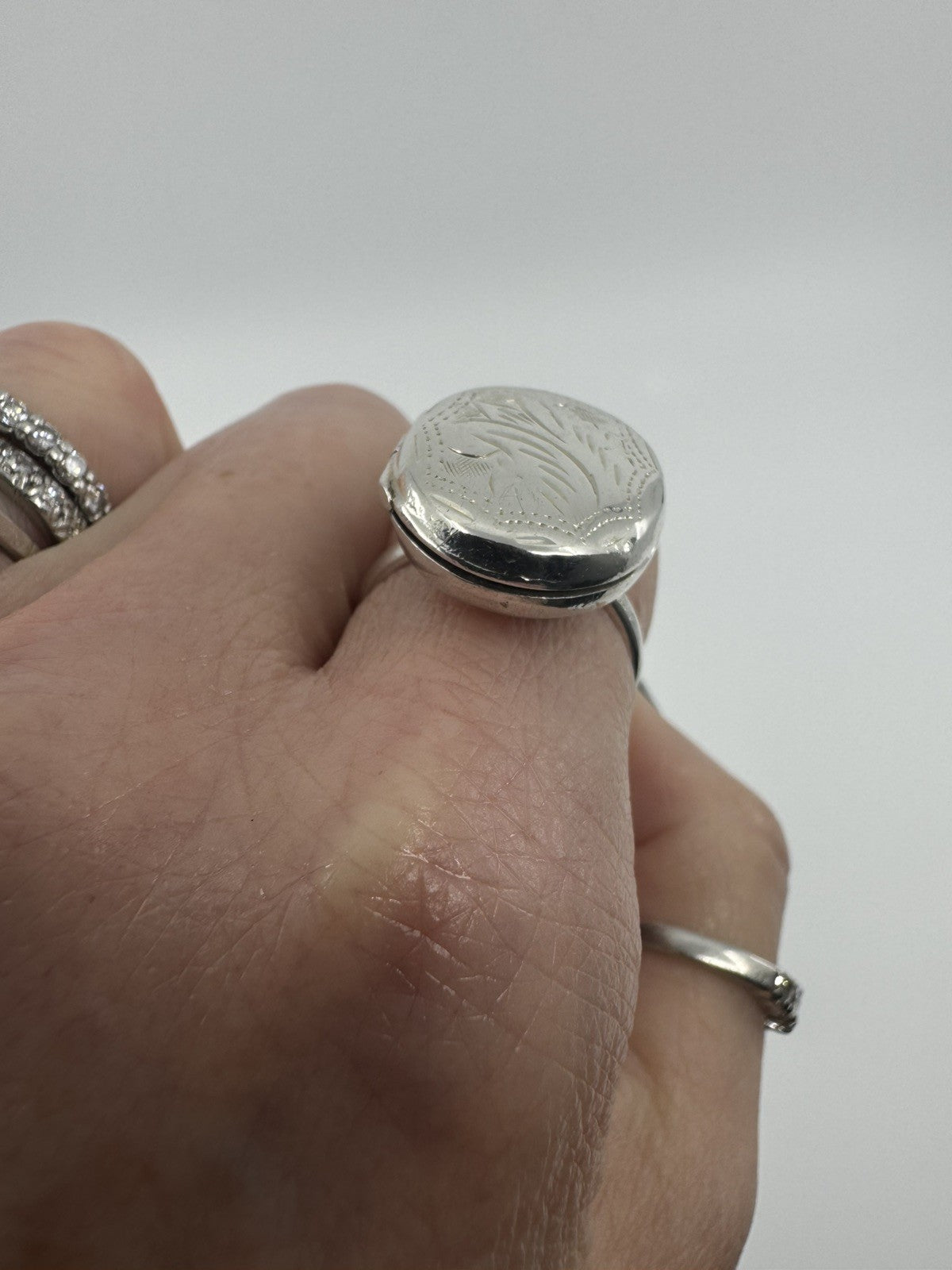 A large, chunky vintage sterling silver secret locket ring with an engraved foliate design to the hinged lid.