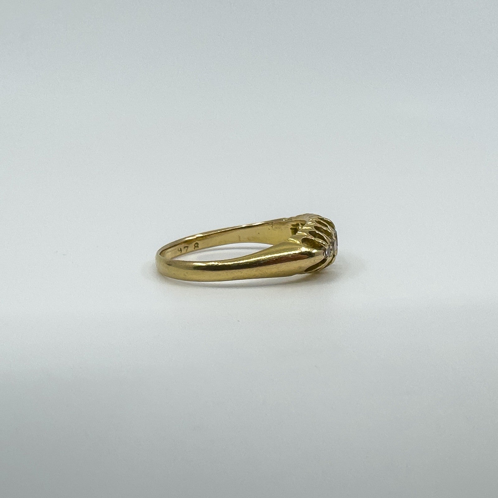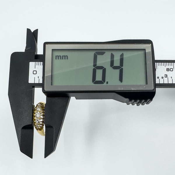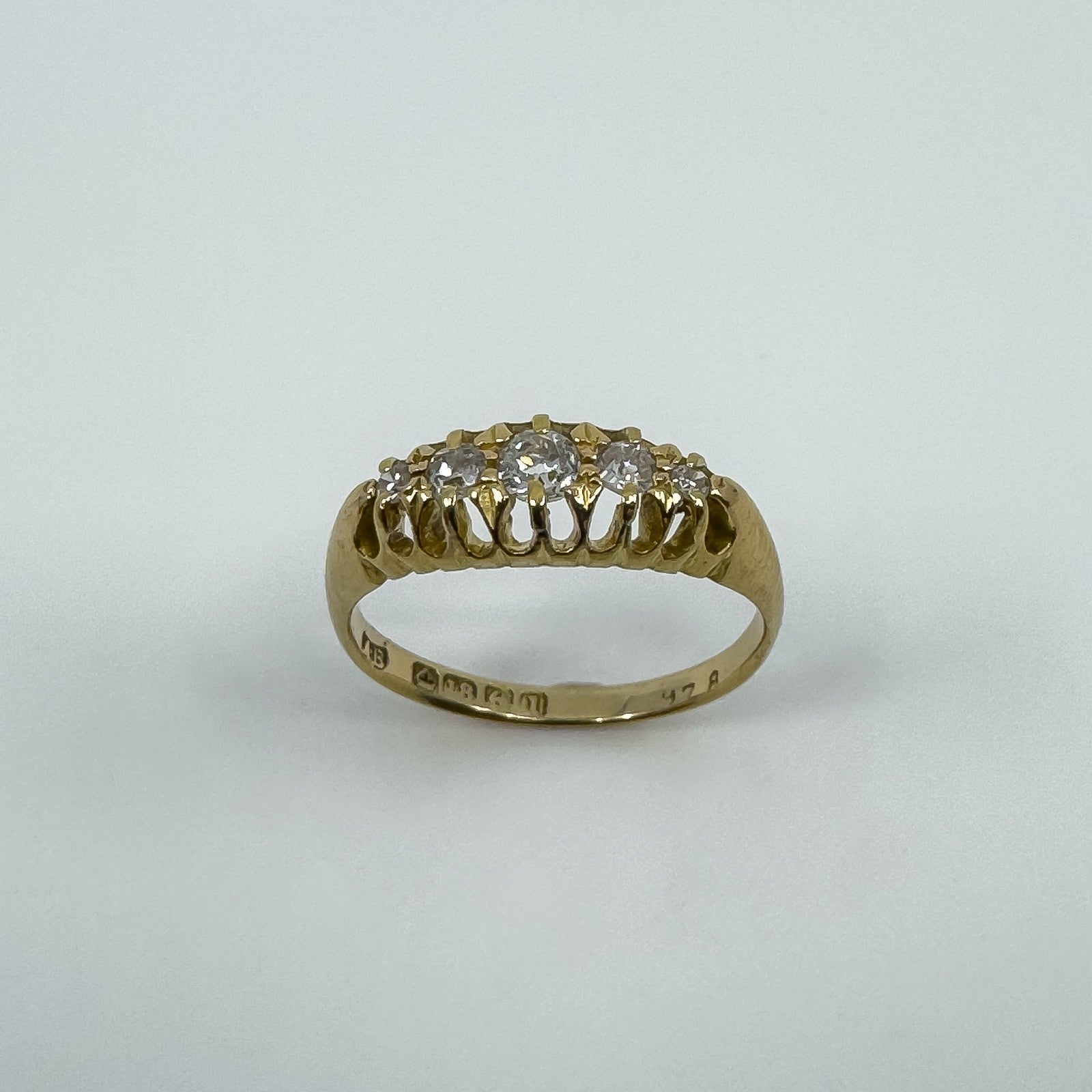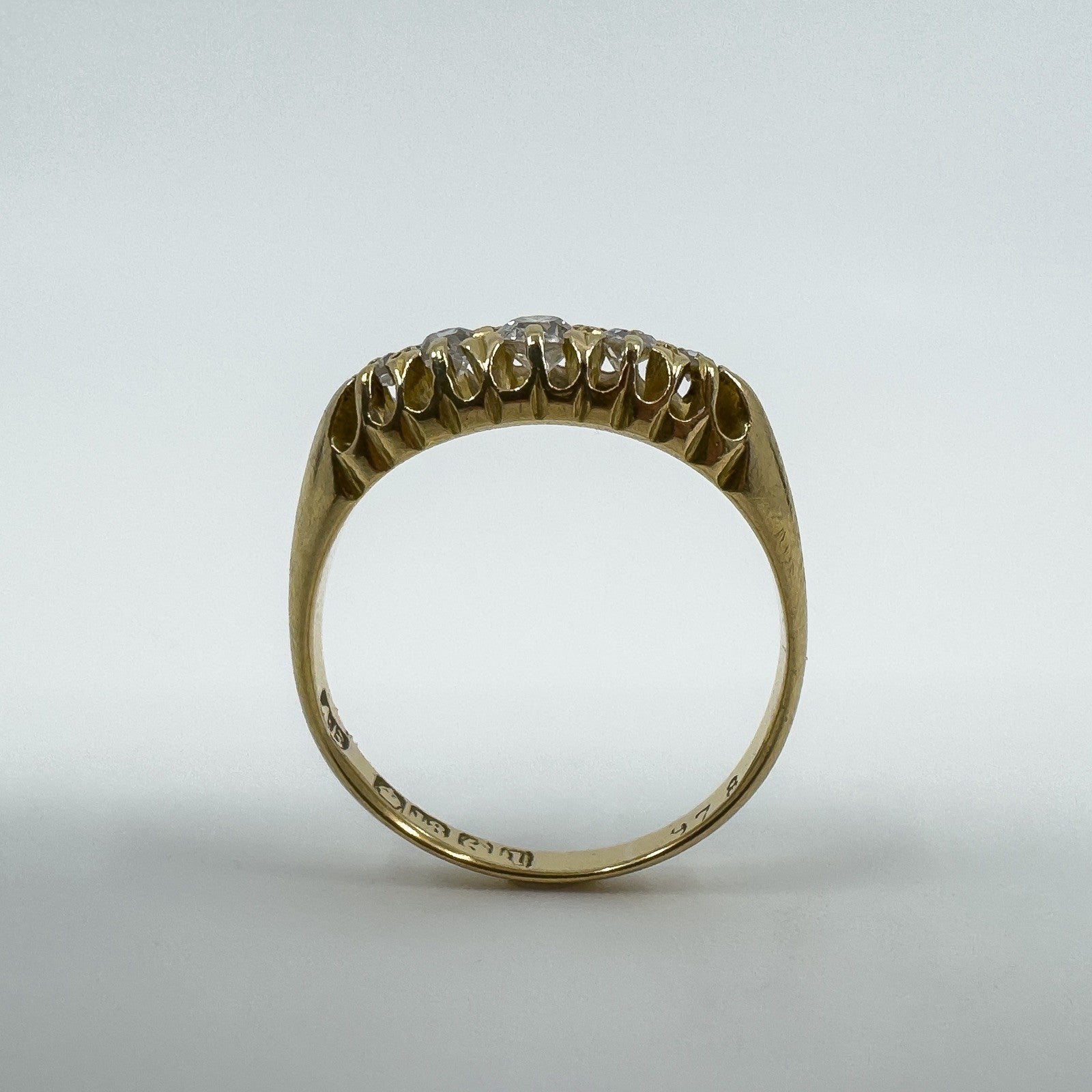 • Edwardian antique 18ct gold diamond boat ring • 5x natural old cut diamonds (tested) in claw settings • Stamped A.B; Crown; 18; Anchor; L (Birmingham 1910) • Head of ring approx. 15.4 × 6.4 mm • Band width on underside approx. 2.1 mm • Depth of ring approx. 3.8 mm • Weight approx. 3.6 g • Ring size P (UK)