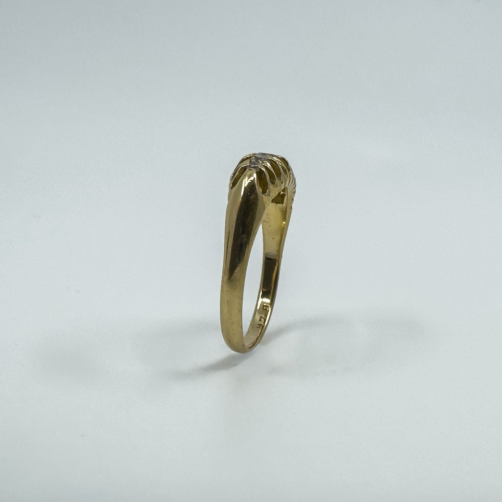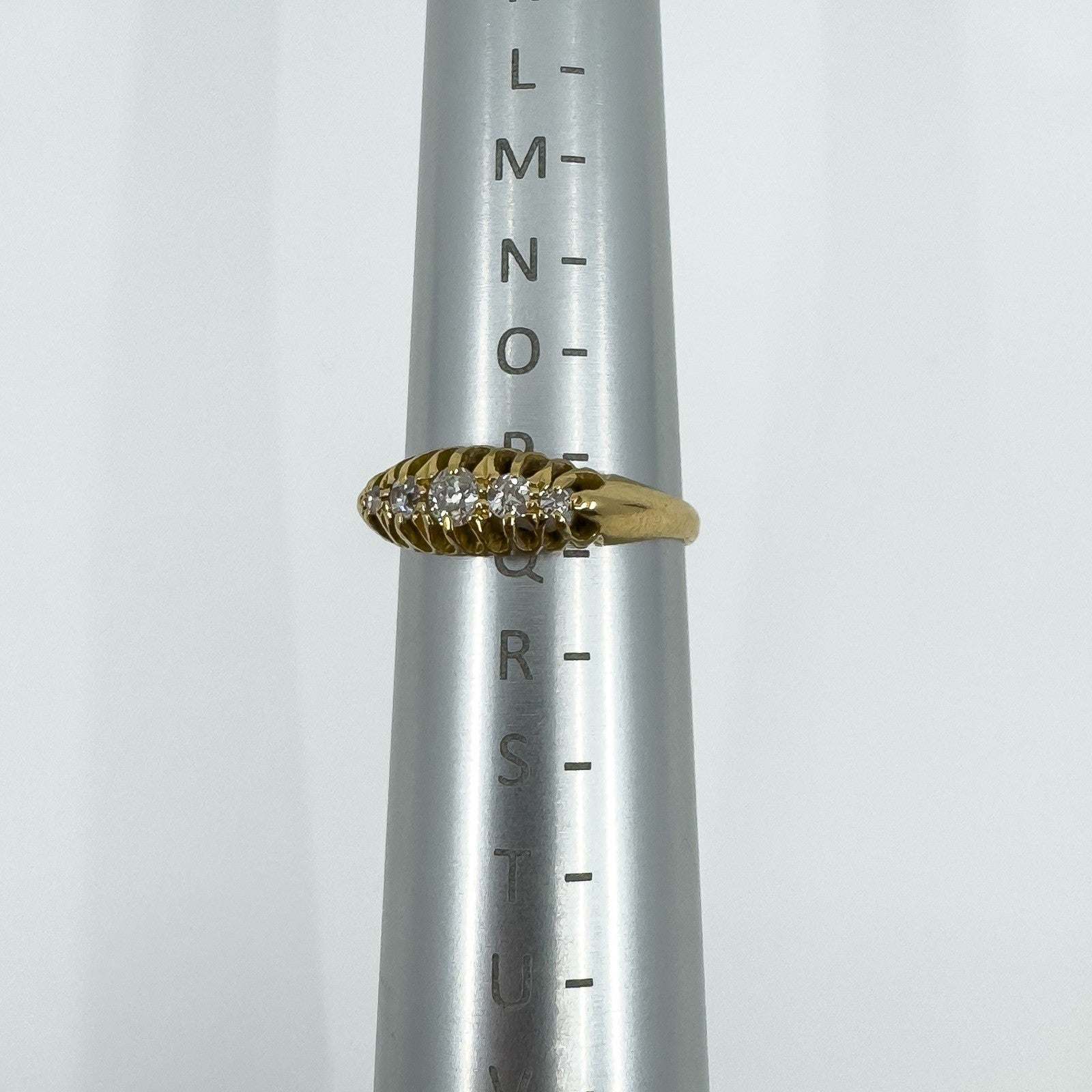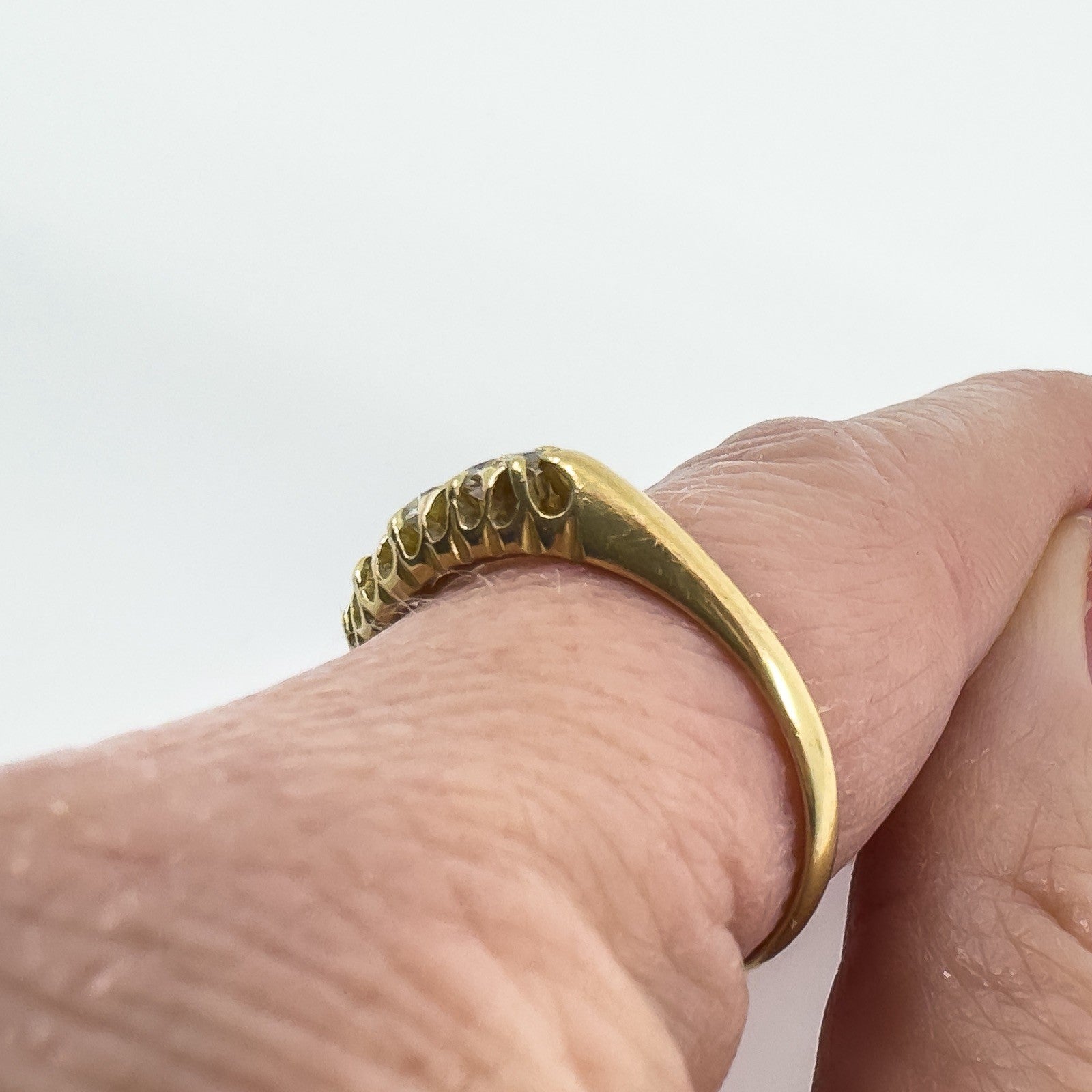 • Edwardian antique 18ct gold diamond boat ring • 5x natural old cut diamonds (tested) in claw settings • Stamped A.B; Crown; 18; Anchor; L (Birmingham 1910) • Head of ring approx. 15.4 × 6.4 mm • Band width on underside approx. 2.1 mm • Depth of ring approx. 3.8 mm • Weight approx. 3.6 g • Ring size P (UK)