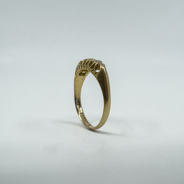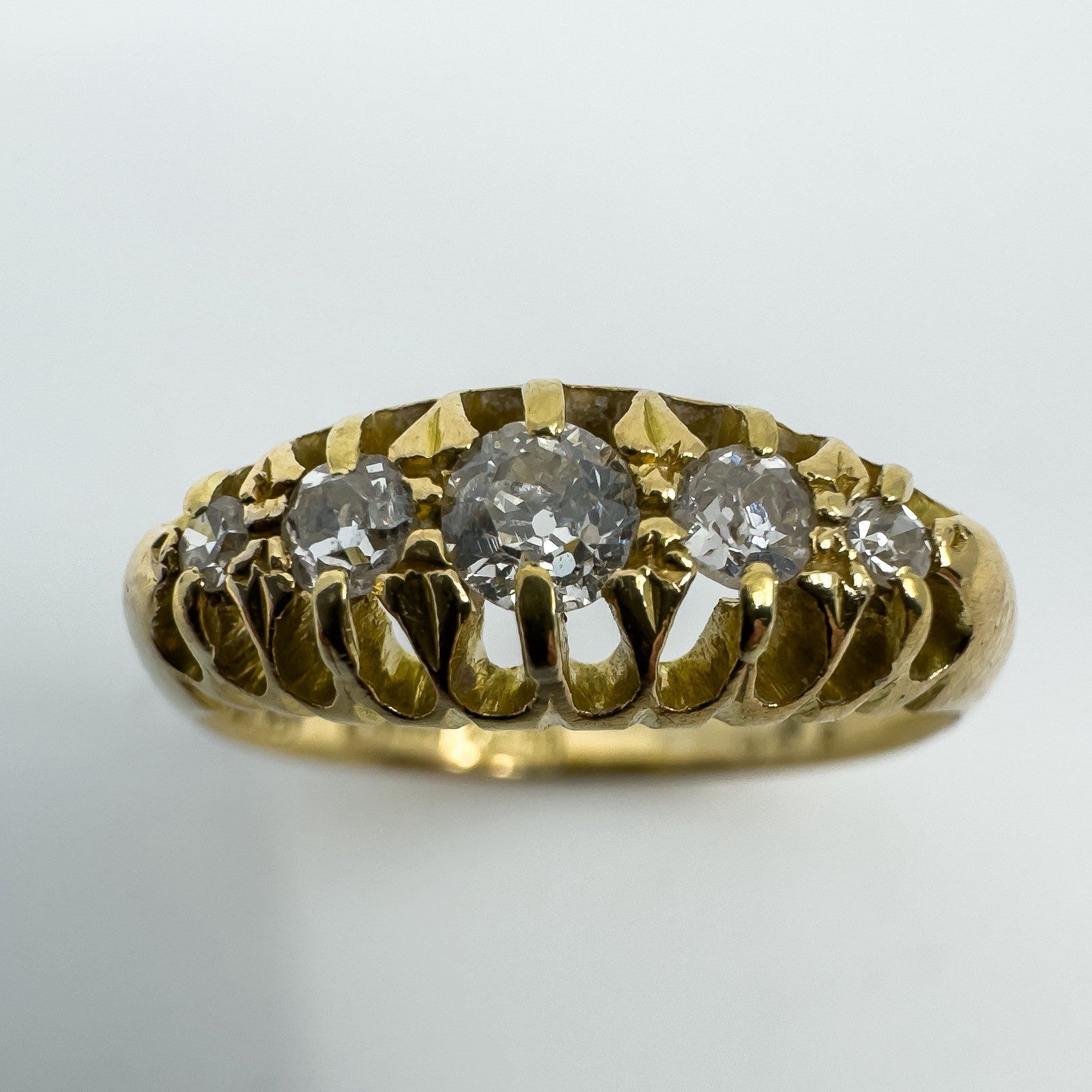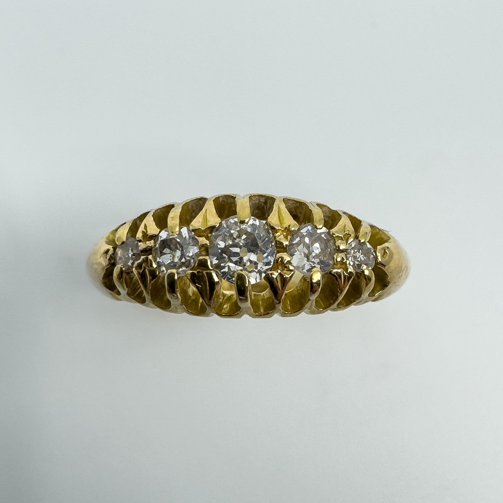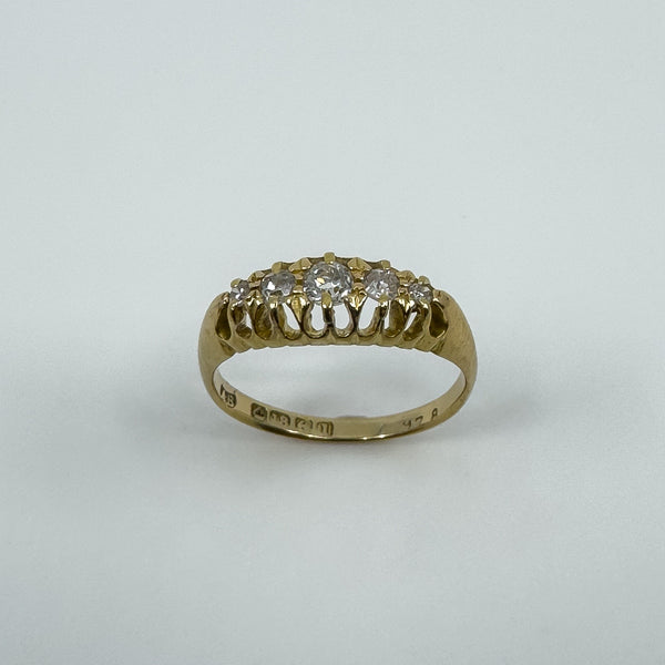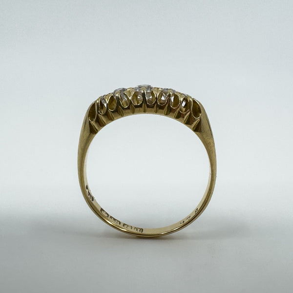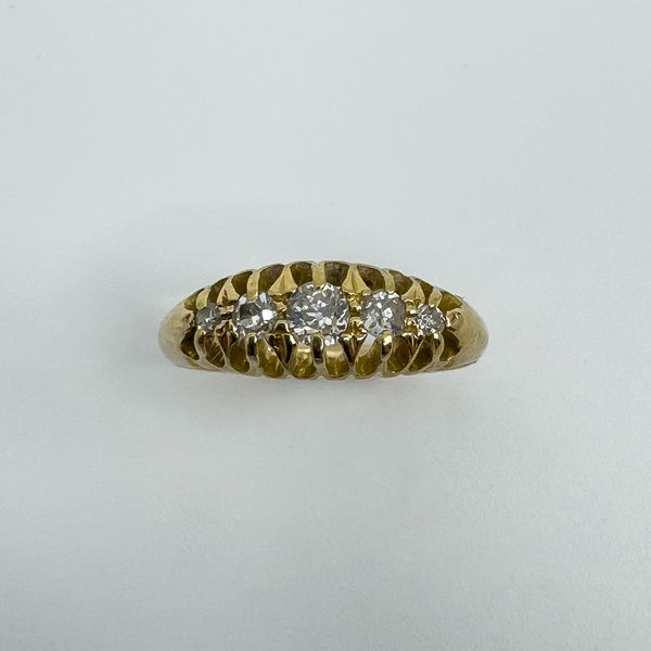 Edwardian antique 18ct gold diamond boat ring set with five old cut natural diamonds in a classic claw setting. A lovely piece with gentle sparkle and timeless style.