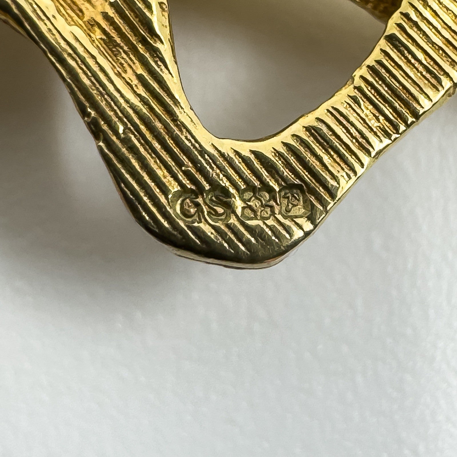 Stamped GS with import marks and date letter P for 1970, and fitted with a rolling C clasp and pin. Measures approximately 35.4 × 26 × 3.6 mm and weighs around 4 g.