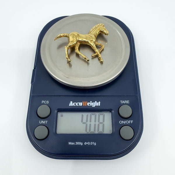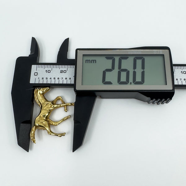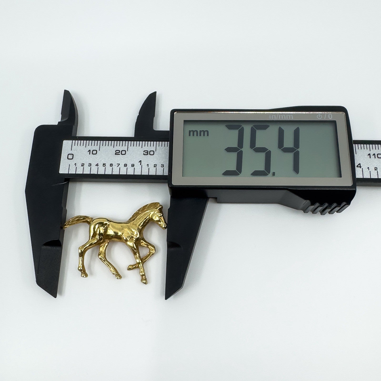 • Large vintage 9ct gold equestrian horse brooch • Detailed horse design with three dimensional profile • Stamped GS with import marks and date letter P (1970) • Rolling C clasp and pin fitting • Measures approx. 35.4 × 26 × 3.6 mm • Weight approx. 4 g