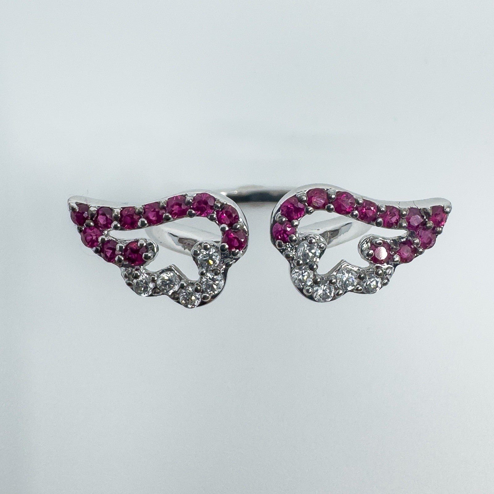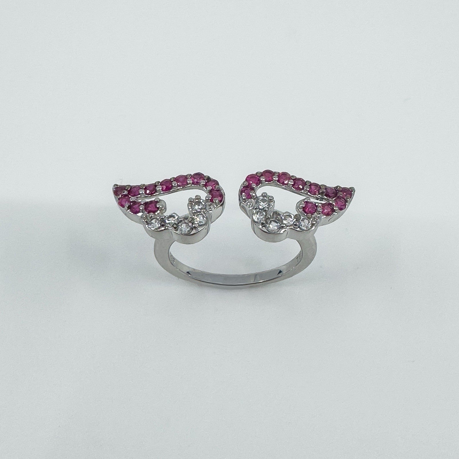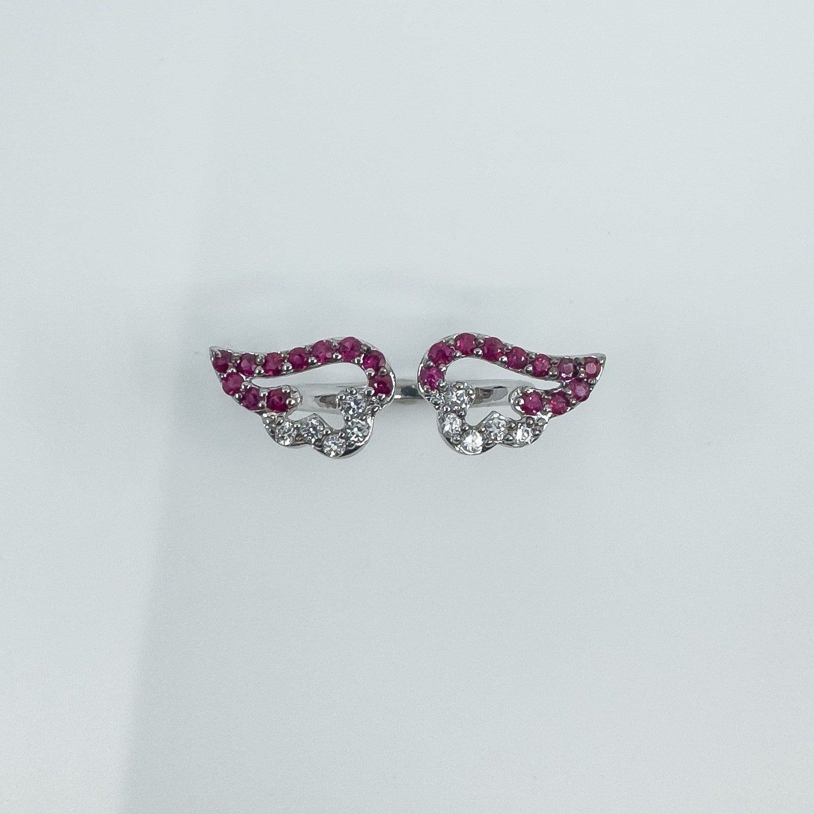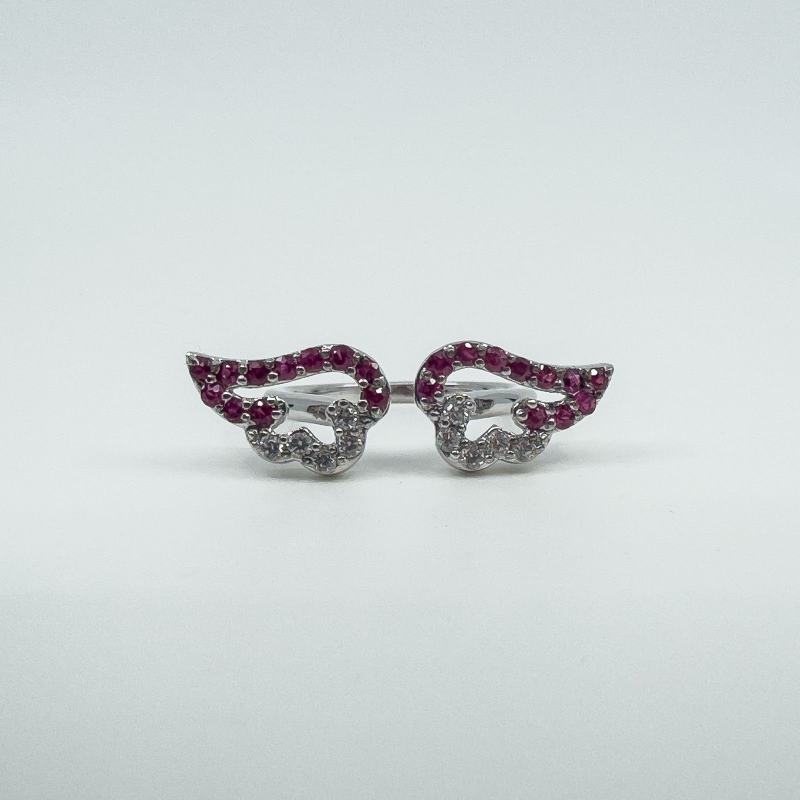 A new and unworn sterling silver ruby double angel wings ring, set with natural round cut rubies and sparkling white CZs arranged to form two angel wings. Symbolic and eye-catching, this piece is ideal as an engagement or stacking ring.