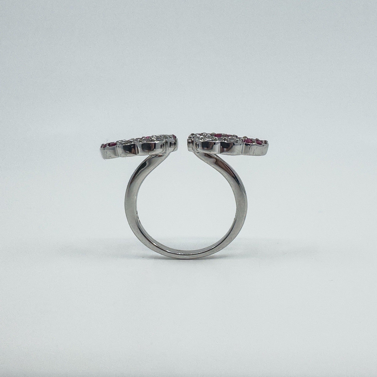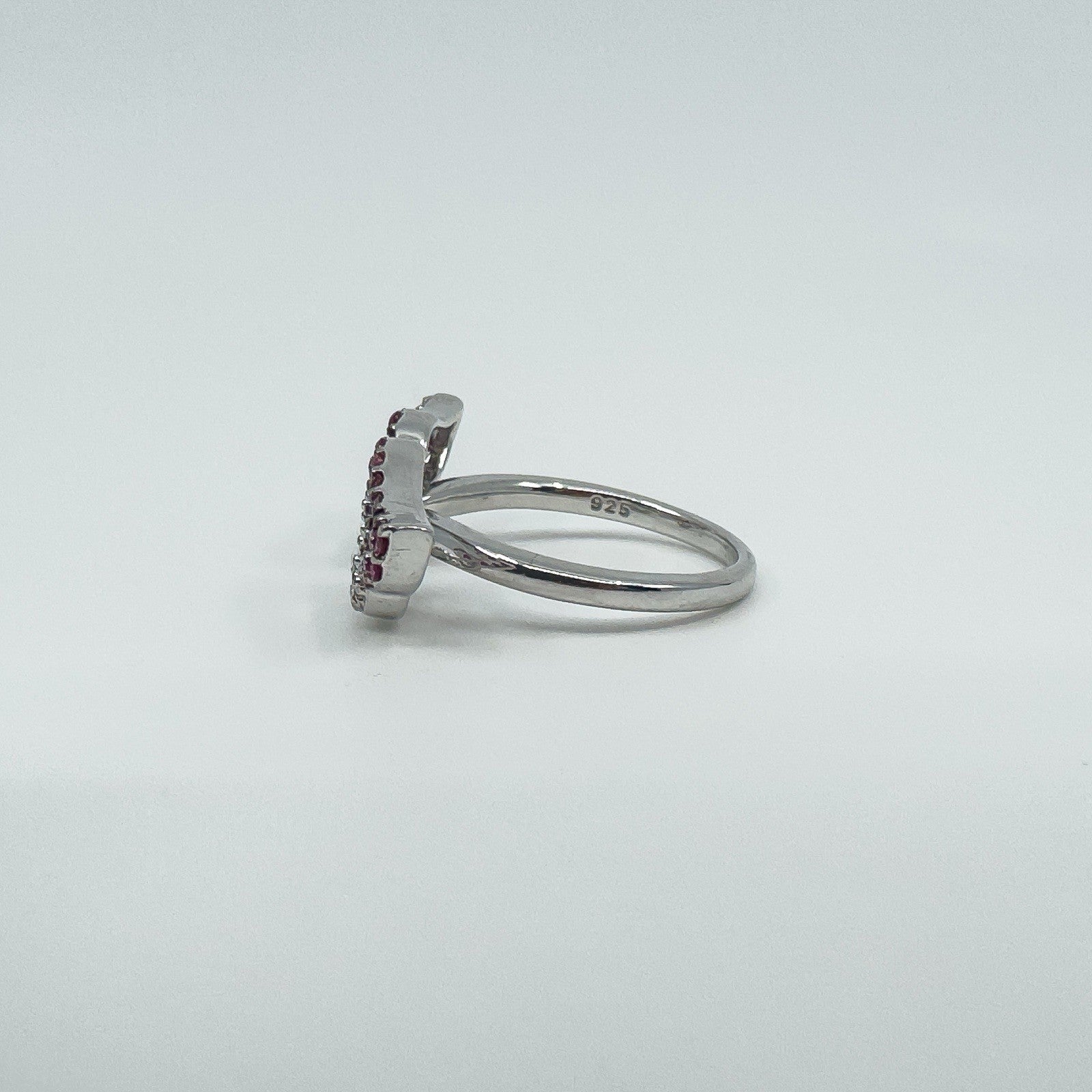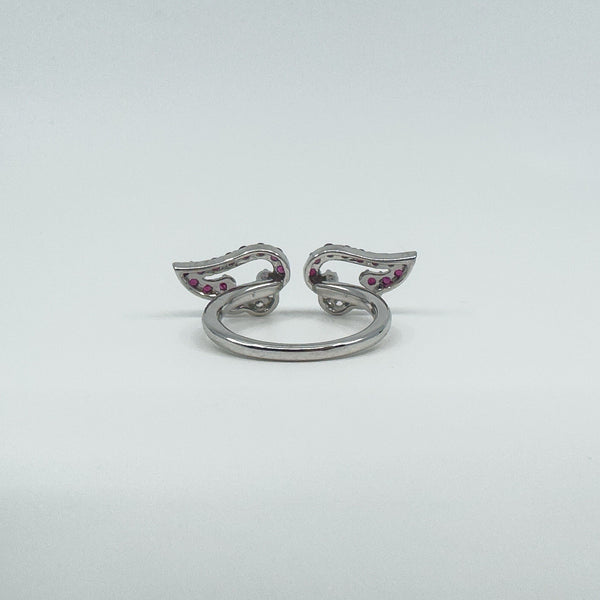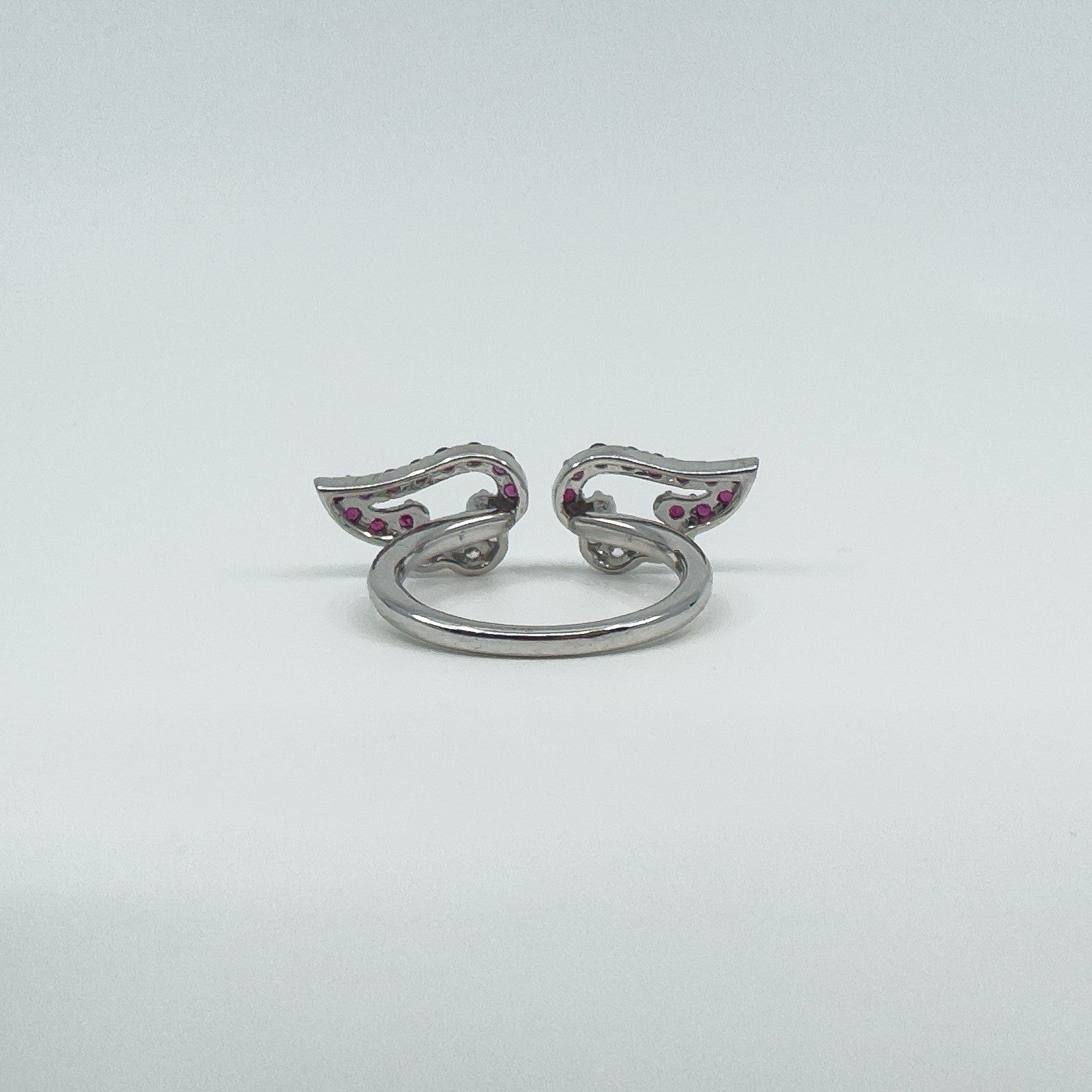 A new and unworn sterling silver ruby double angel wings ring, set with natural round cut rubies and sparkling white CZs arranged to form two angel wings. Symbolic and eye-catching, this piece is ideal as an engagement or stacking ring.