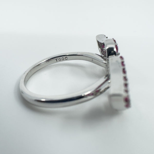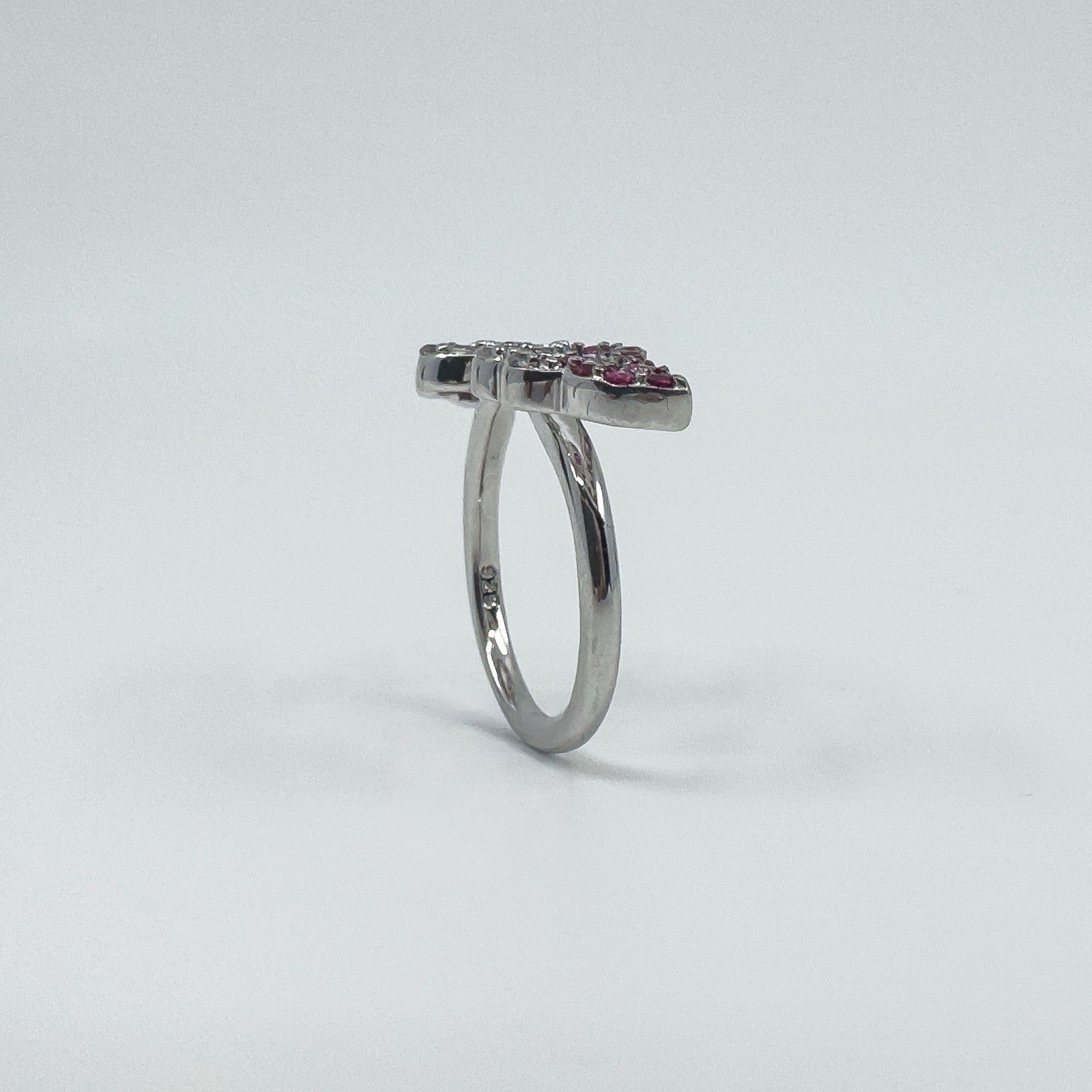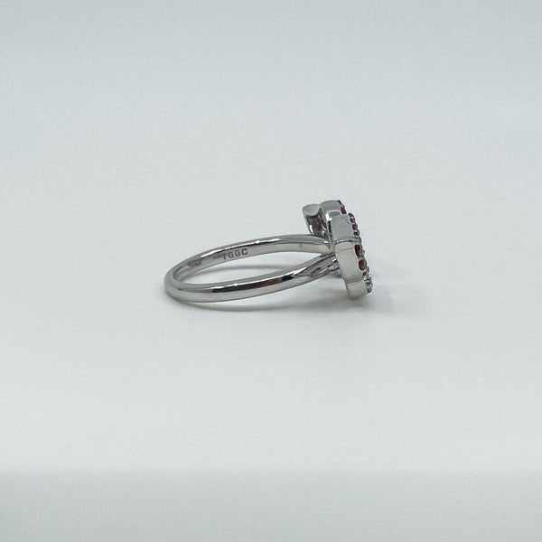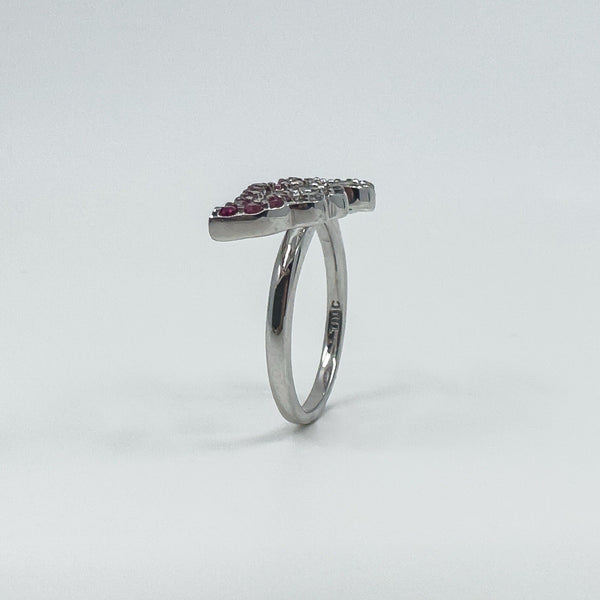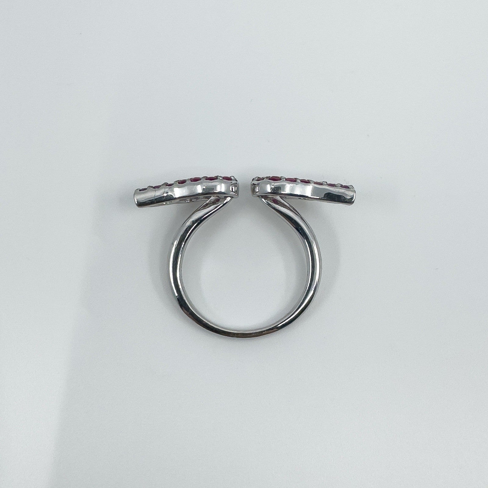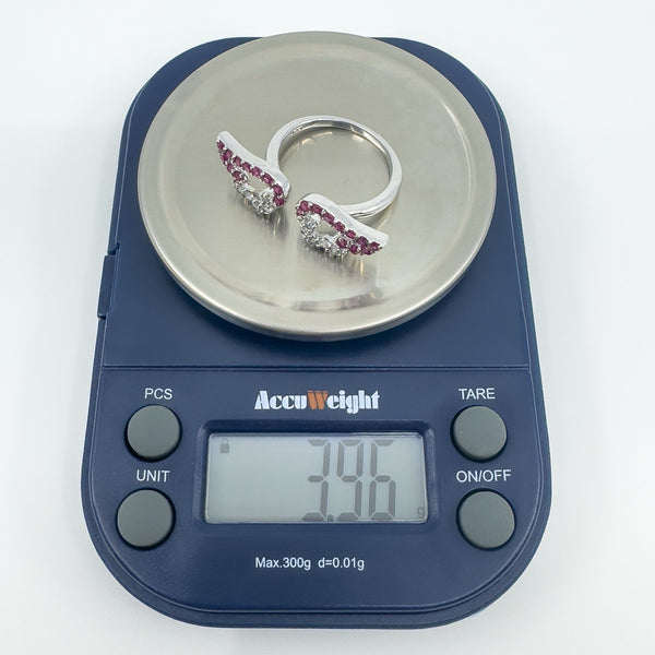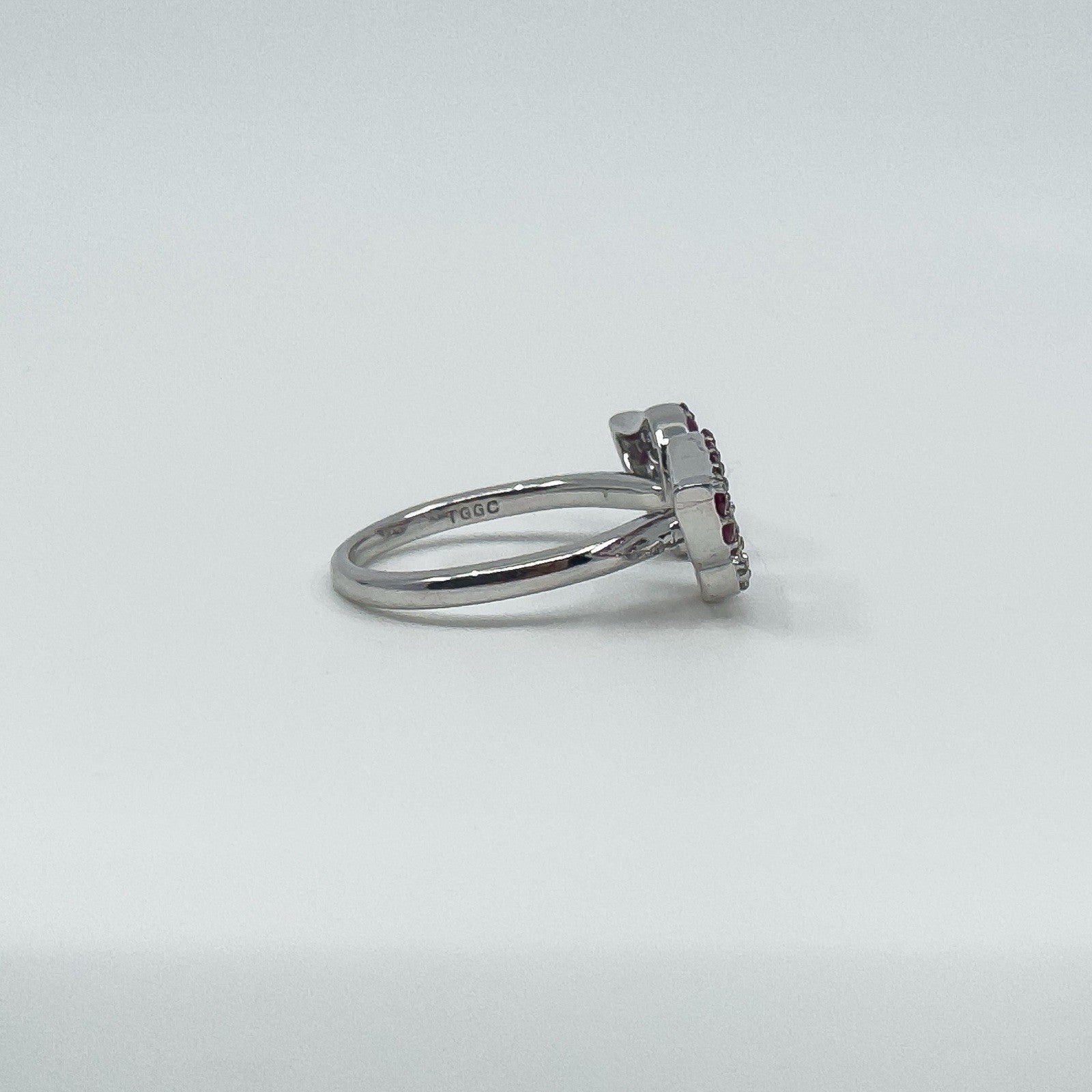 A new and unworn sterling silver ruby double angel wings ring, set with natural round cut rubies and sparkling white CZs arranged to form two angel wings. Symbolic and eye-catching, this piece is ideal as an engagement or stacking ring.