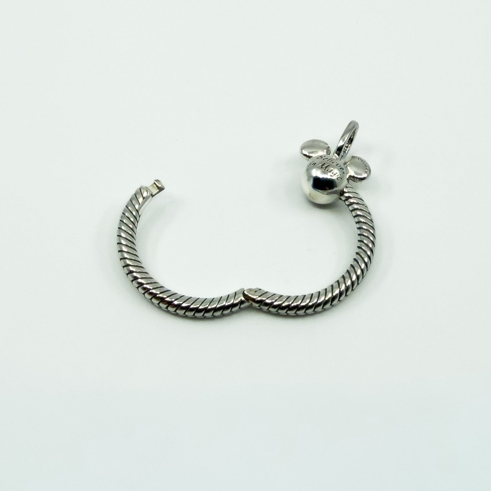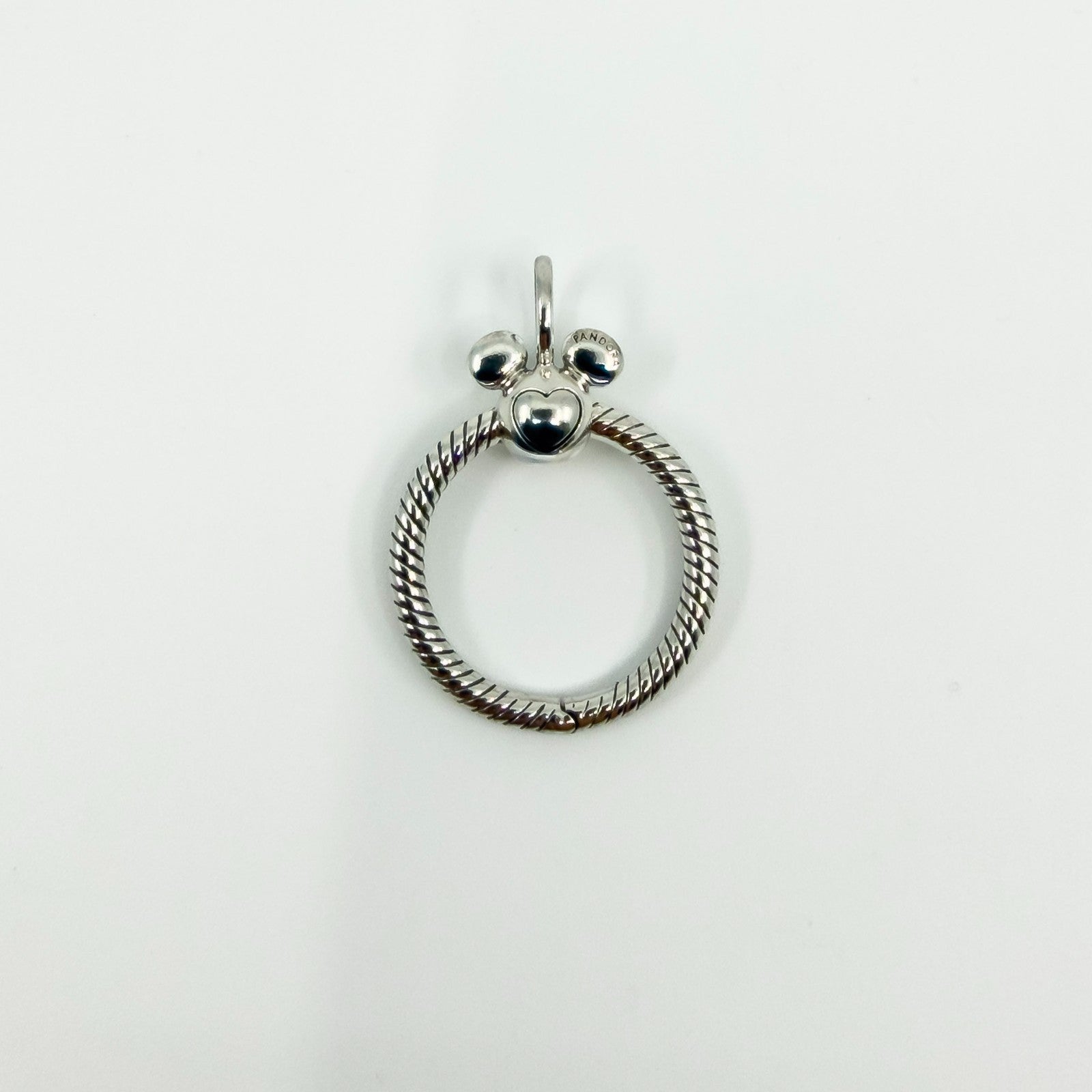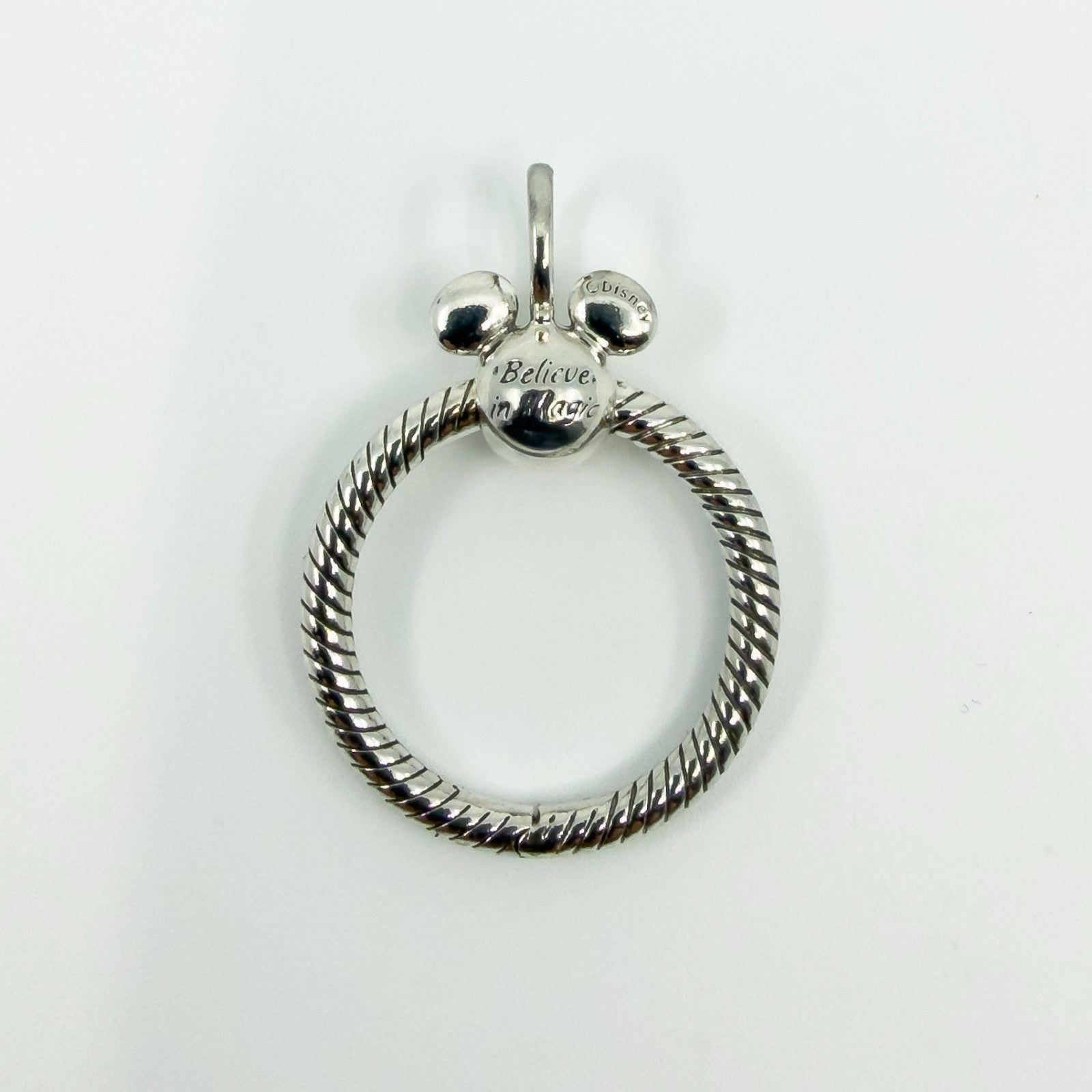 A sterling silver Pandora Disney Mickey Mouse connector charm with a hinged opening and a large bail, ready to be worn on a chain or added to a bracelet.