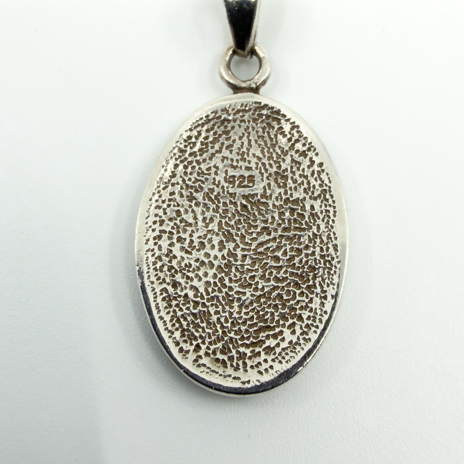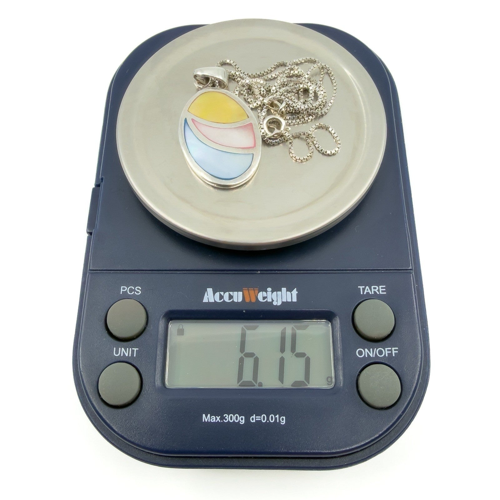 • Item: Multicolour mother of pearl oval pendant with chain • Metal: Sterling silver • Inlay: Mother of pearl (yellow, pink, blue) • Chain style: Box chain • Necklace length: Approx. 18.8 inches • Pendant size: Approx. 34.8mm (with bail) x 17mm • Weight: Approx. 6.1g • Stamps: 925 on pendant and necklace