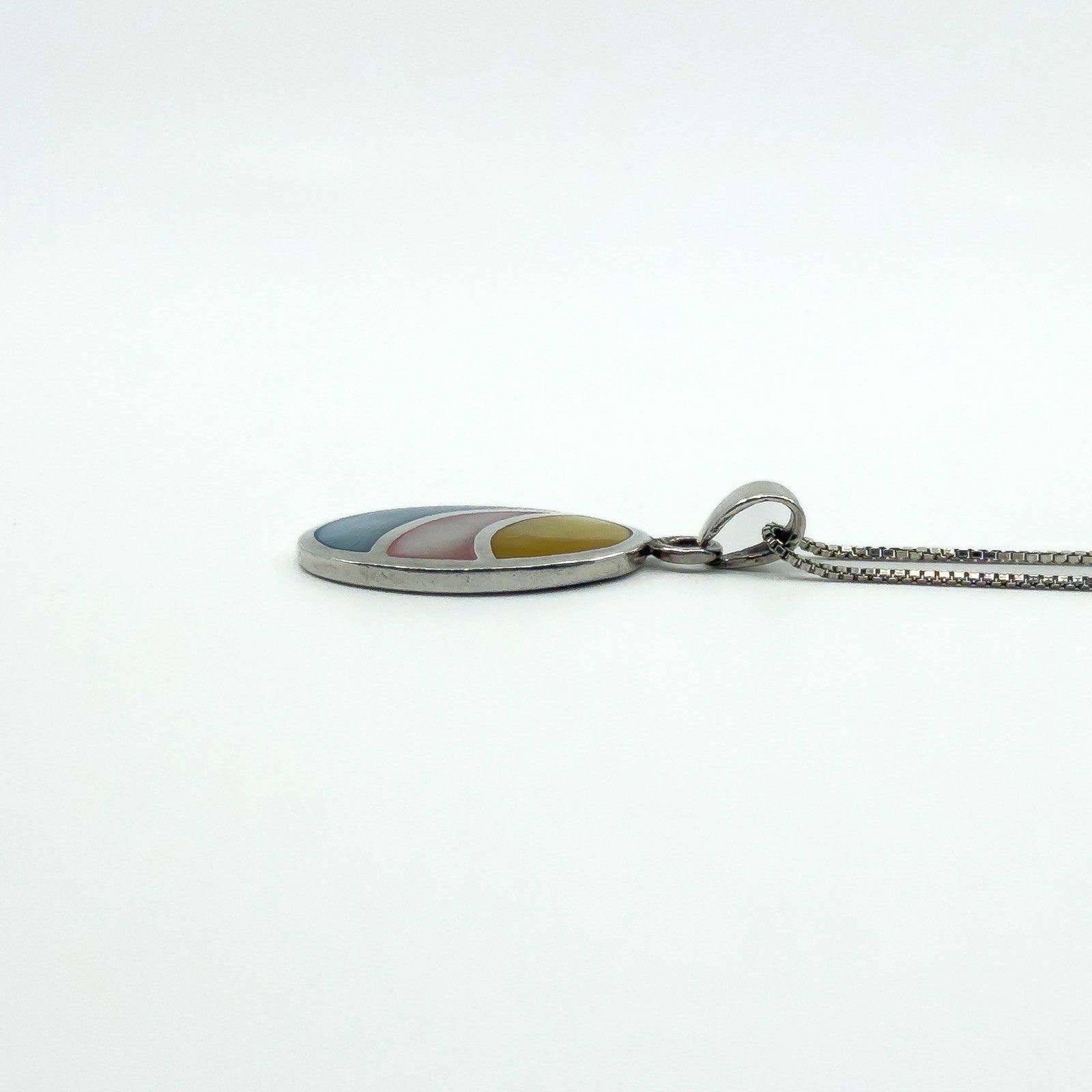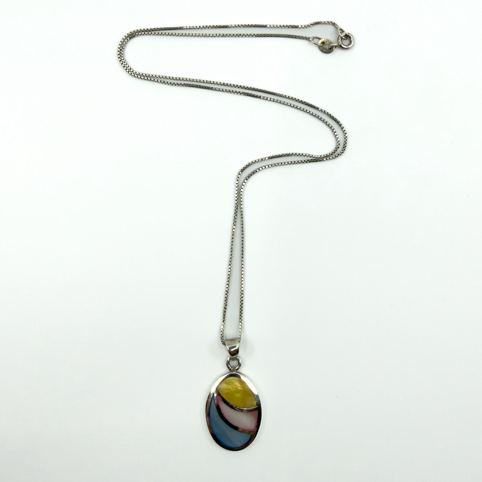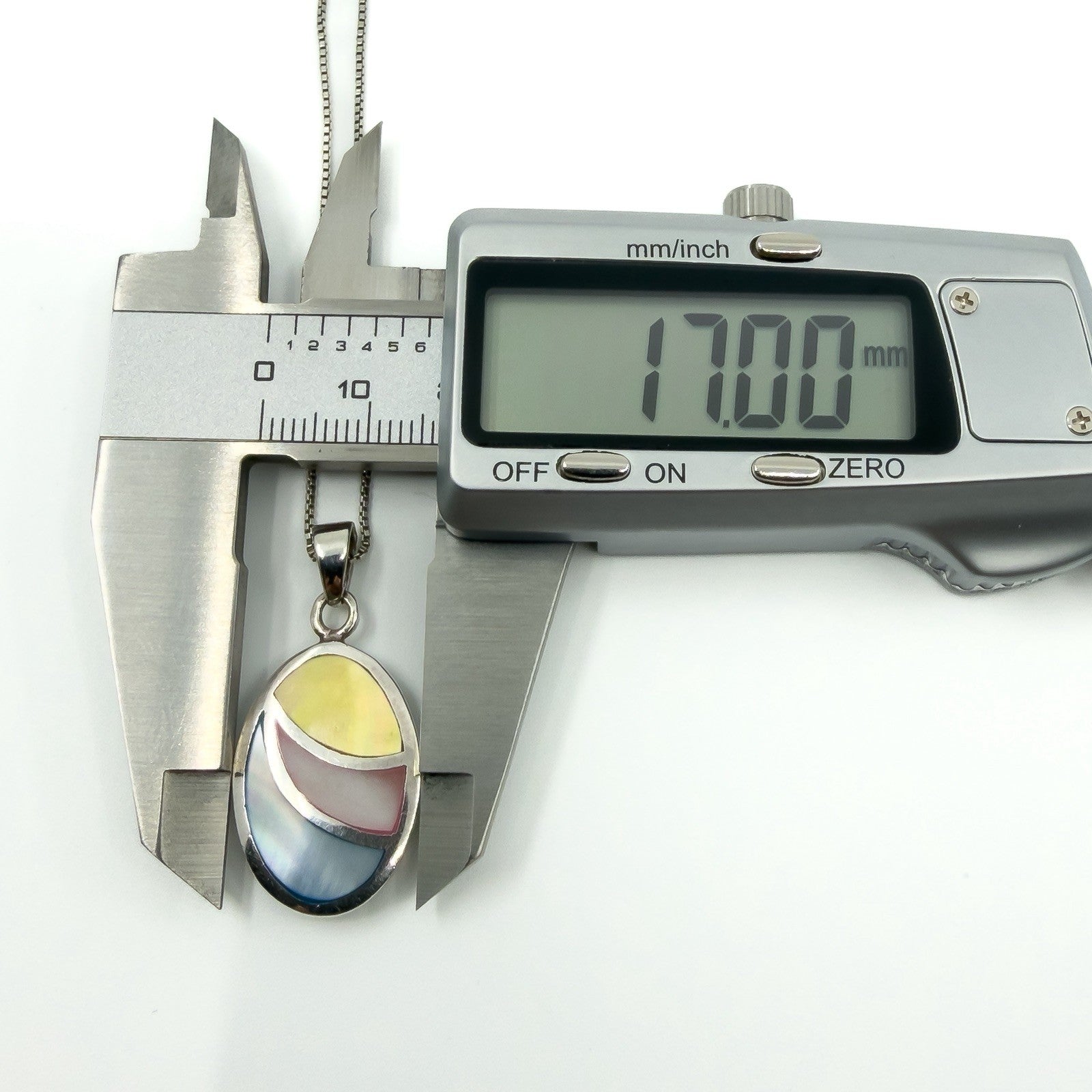 Sterling silver oval pendant inlaid with three pieces of mother of pearl in yellow, pink and blue, set in a smooth bezel setting. Stamped 925 on both the pendant and necklace. Box chain length is approximately 18.8 inches.