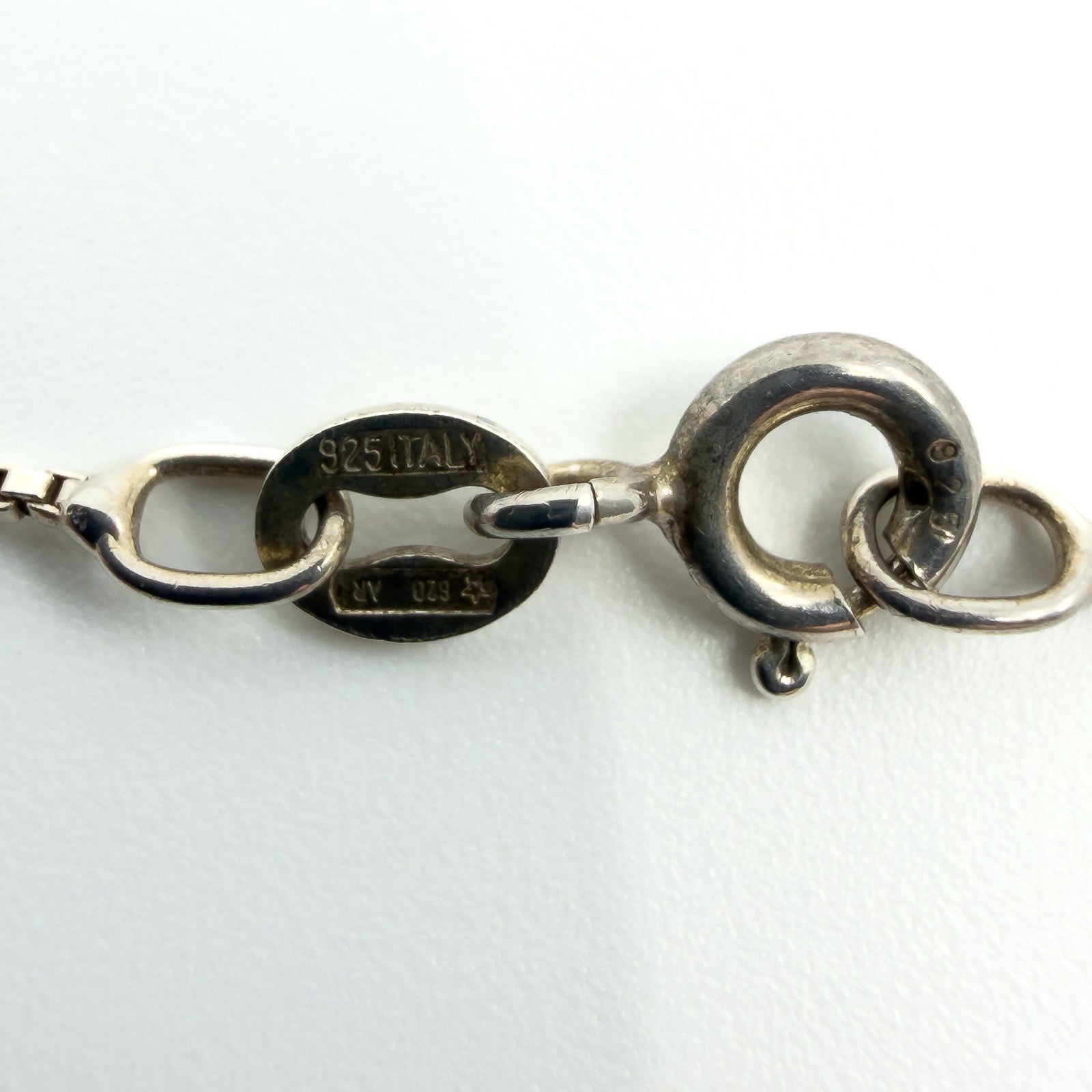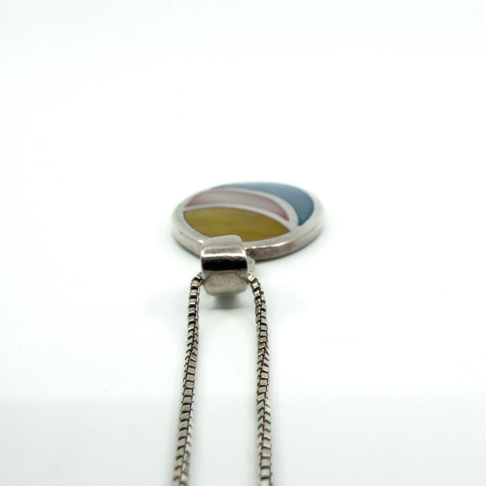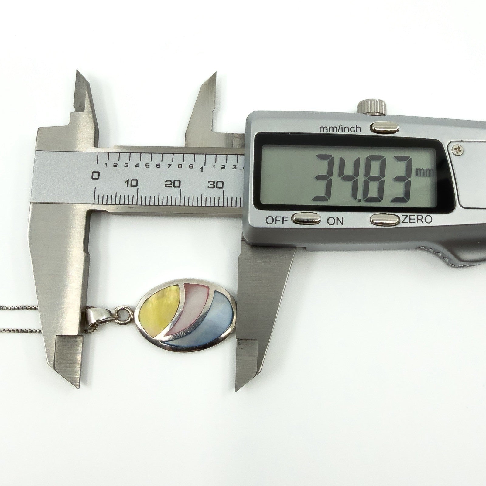 Sterling silver oval pendant inlaid with three pieces of mother of pearl in yellow, pink and blue, set in a smooth bezel setting. Stamped 925 on both the pendant and necklace. Box chain length is approximately 18.8 inches.