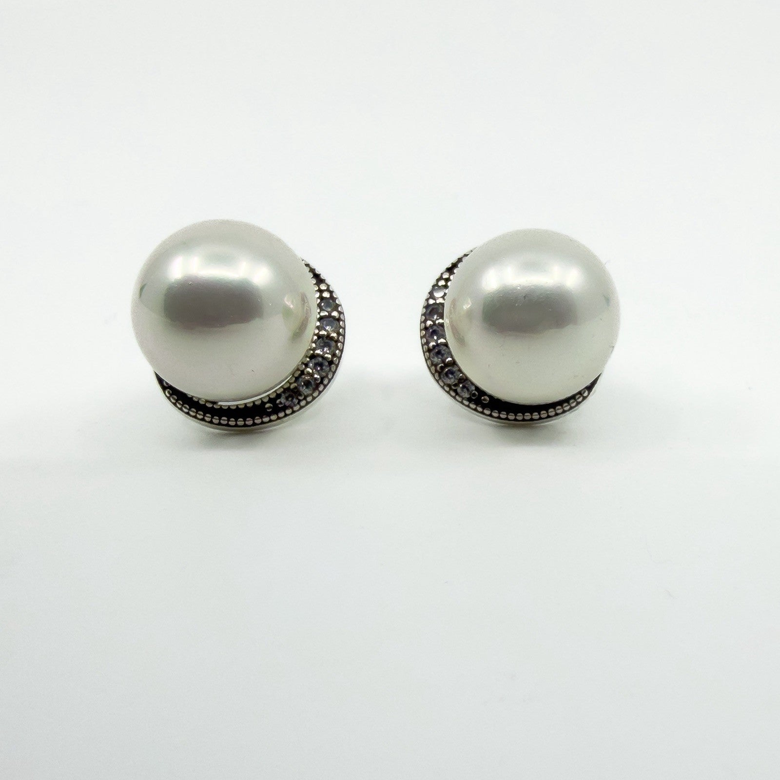 New and unworn chunky sterling silver stud earrings set with white glass coated pearls and clear cubic zirconia for a bright, clean finish.