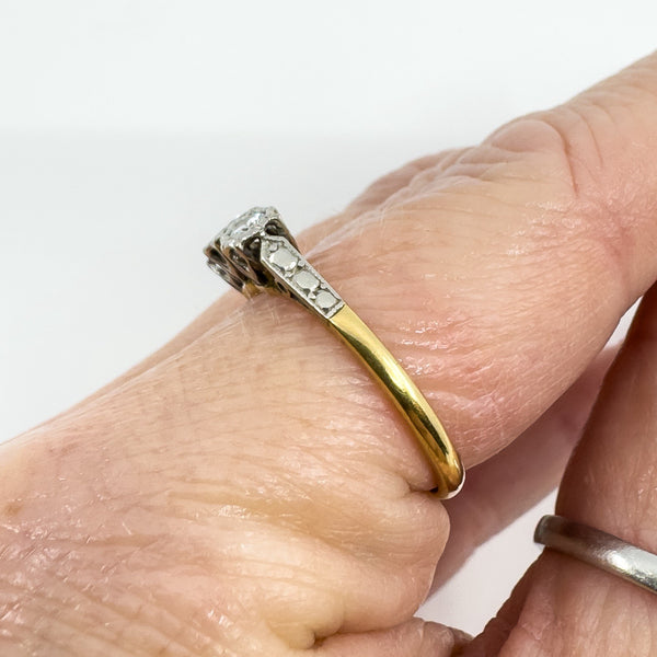 • Vintage 18ct gold and platinum diamond trilogy ring • 3x natural round cut diamonds, approx. 0.40ct total (centre ≈0.20ct, outer ≈0.10ct each) • Bezel / rub over settings for smooth, secure wear • Platinum head with 18ct yellow gold band • Stamped 18ct and PT • Head of ring approx. 13.1 × 5.1 mm • Band width on underside approx. 1.8 mm • Depth of ring approx. 5.2 mm • Weight approx. 3 g • Ring size P (UK)