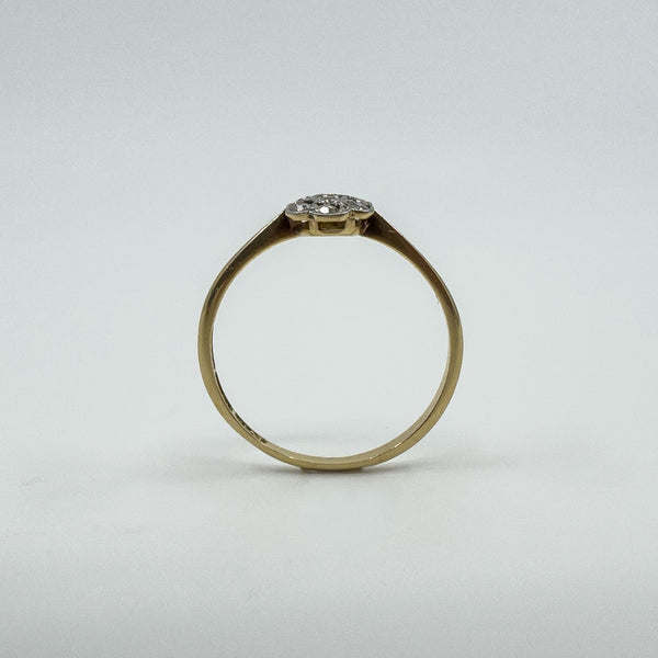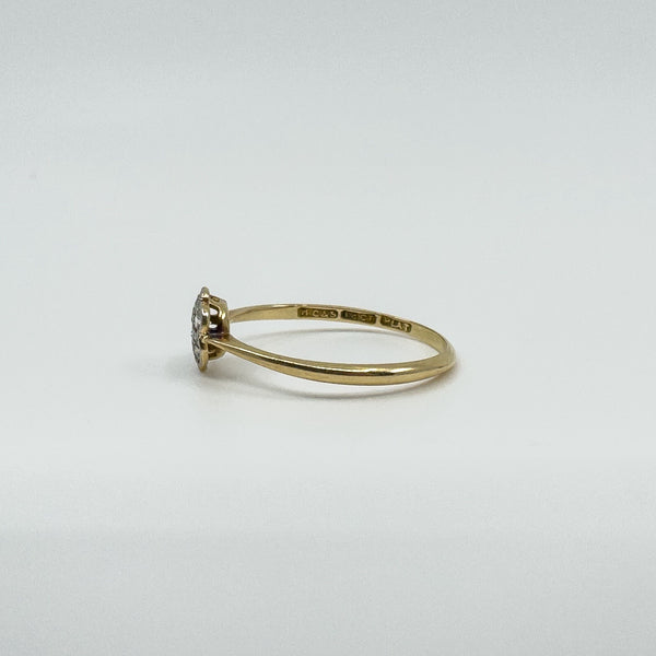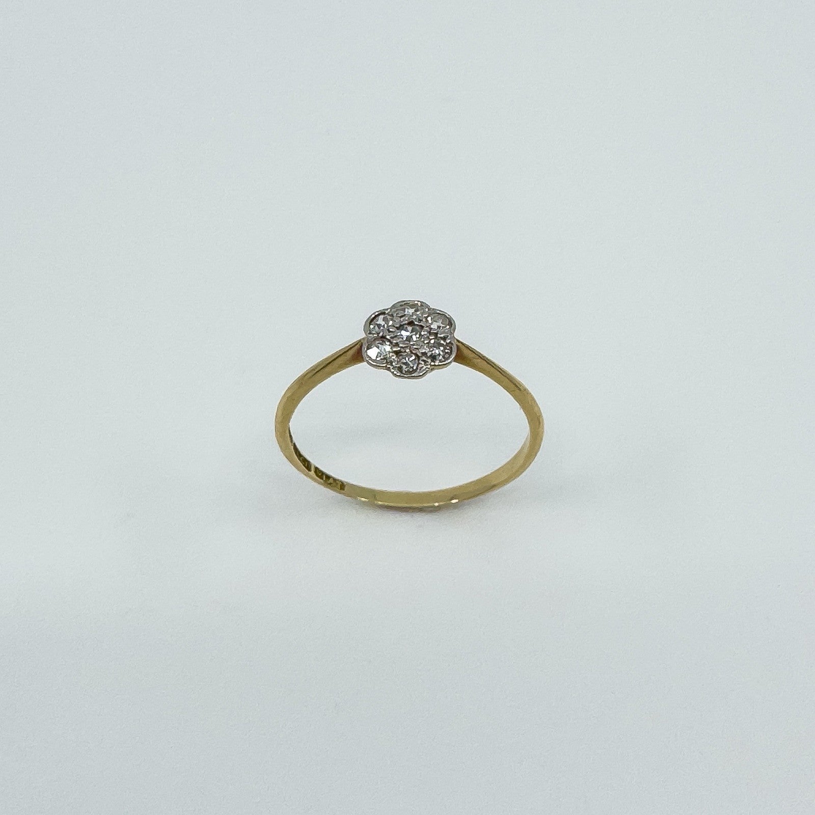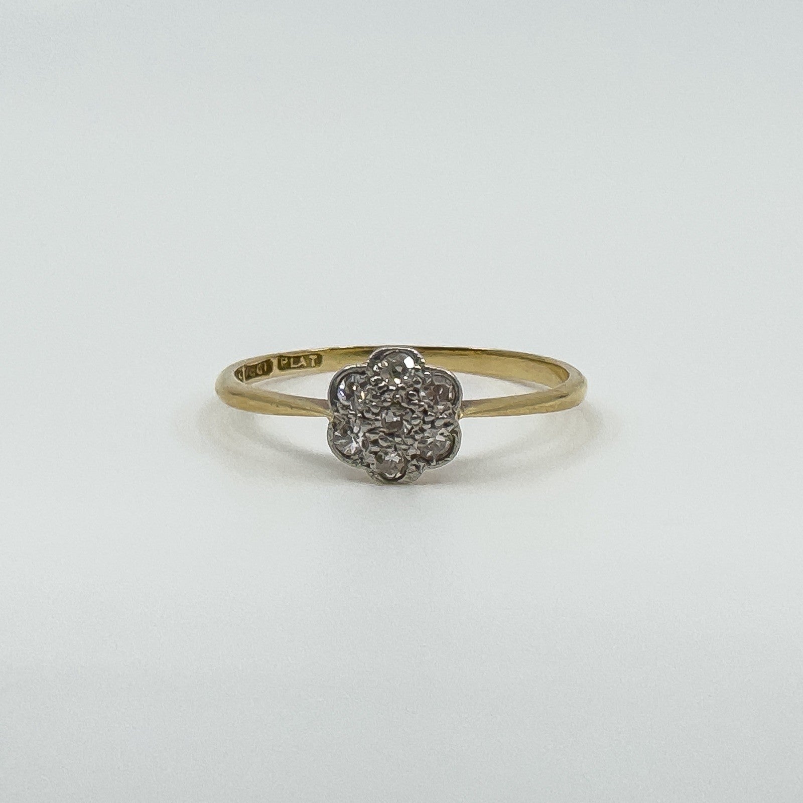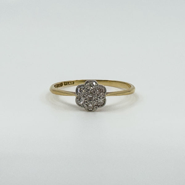 Vintage 18ct gold and platinum diamond cluster flower ring with a low profile setting, easy to wear as an everyday ring or as a simple sparkling accent.