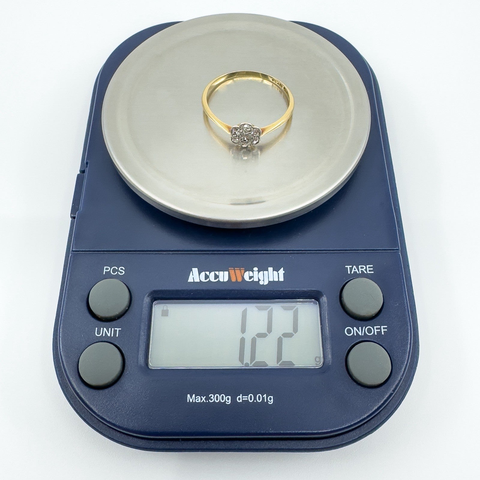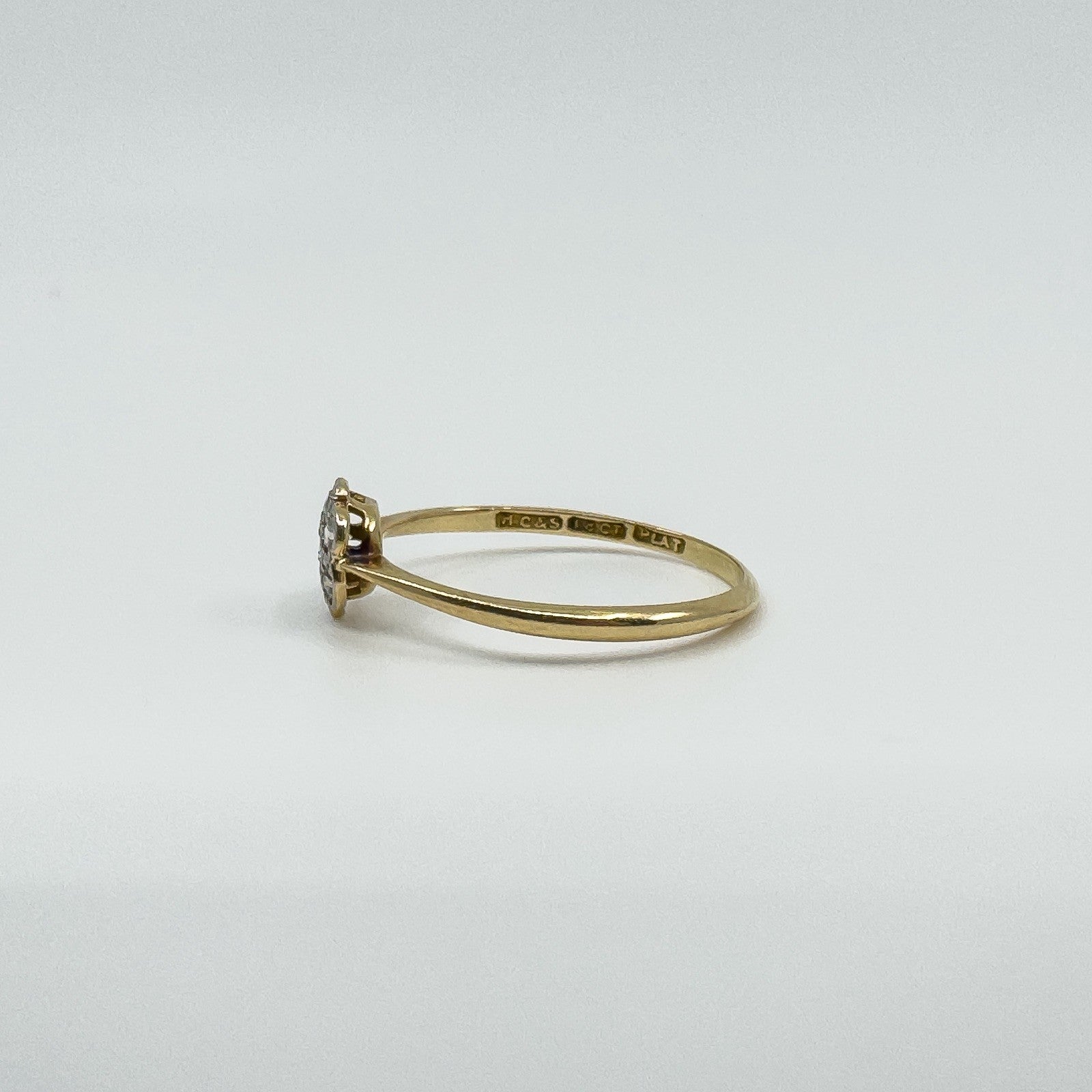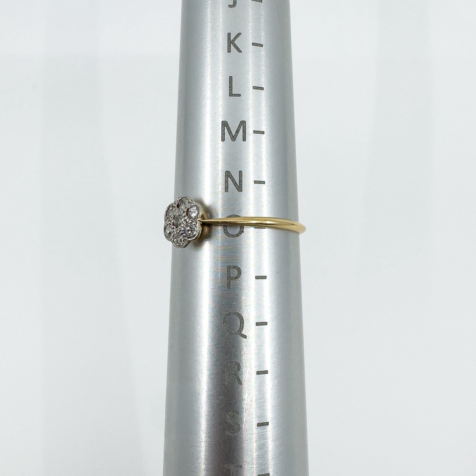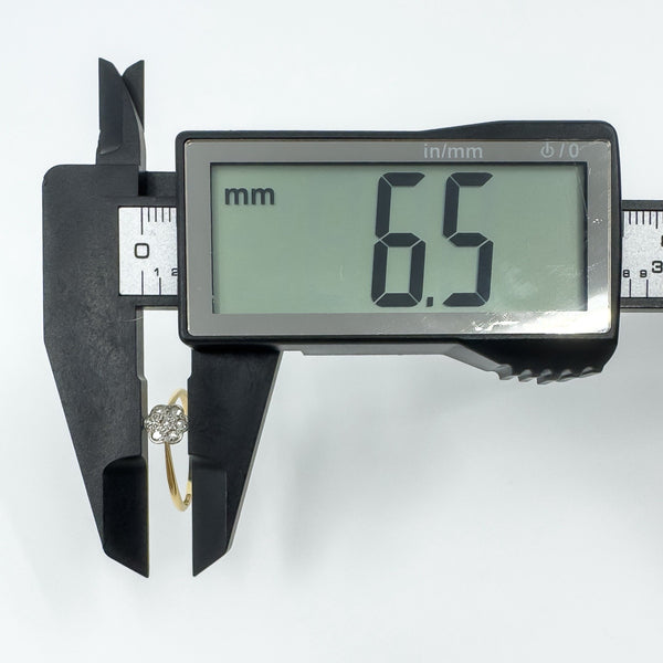 • Vintage 18ct gold and platinum diamond cluster flower ring • 7x natural round diamonds, approx. 0.01ct each (0.07ct total) • Stamped HG & S, 18ct and PLAT • Head of ring approx. 6.8 × 6.5 mm • Band width on underside approx. 1.3 mm (fine, dainty band) • Depth of ring approx. 2.8 mm • Weight approx. 1.2 g • Ring size O (UK)