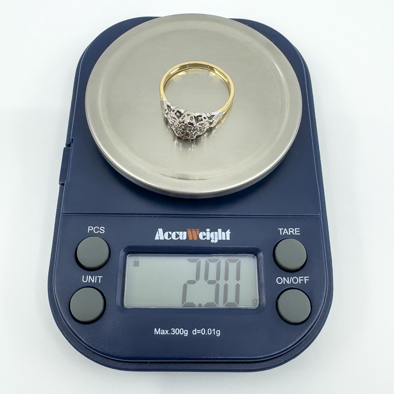 • Vintage 18ct gold & platinum diamond solitaire ring • Natural round diamond (tested), est. ≈0.20 ct • Flush rub over setting; platinum head • 18ct yellow gold band • Head measures approx. 15.2 × 6.6 mm • Depth approx. 6.1 mm • Band underside approx. 1.7 mm • Weight approx. 2.9 g • Ring size O • Not stamped; tested for 18ct gold & platinum