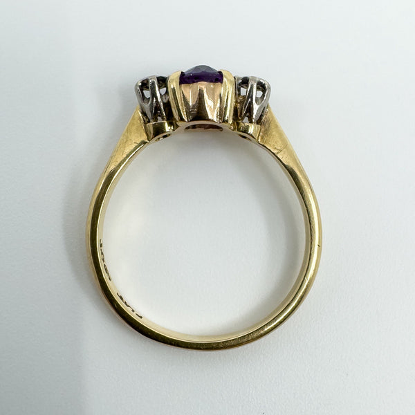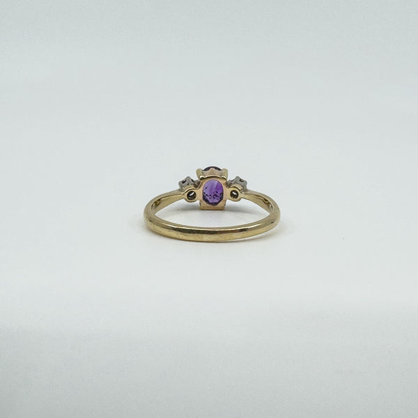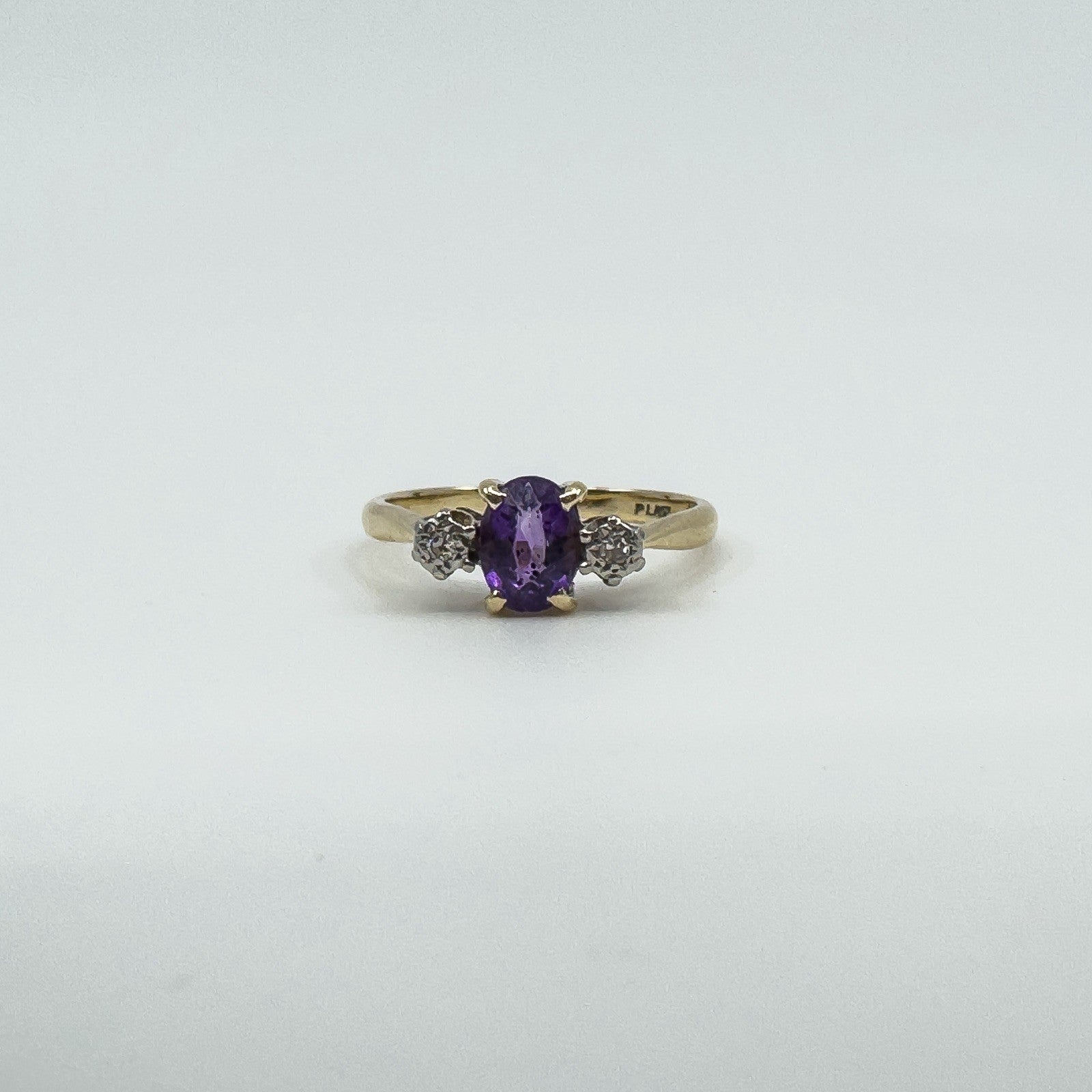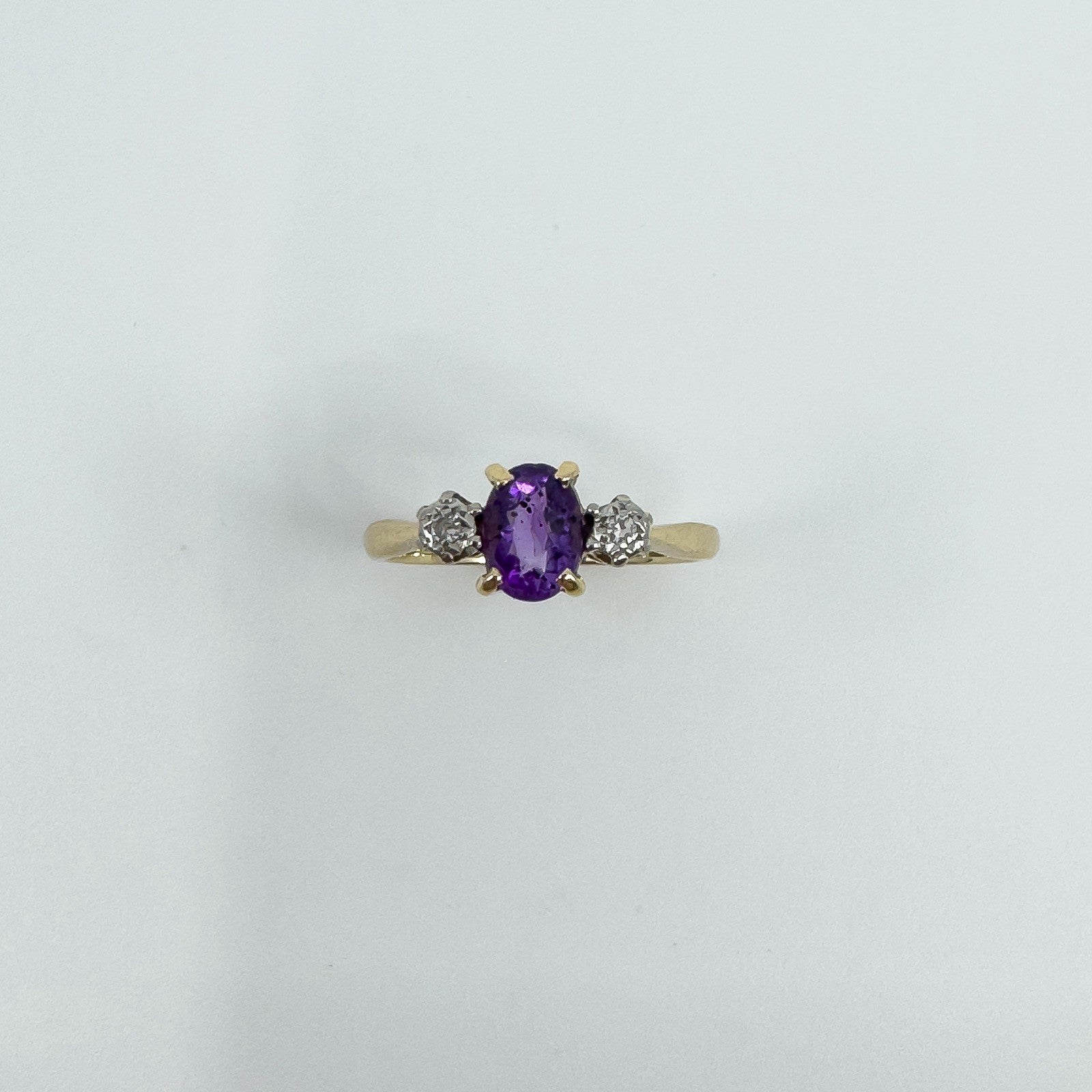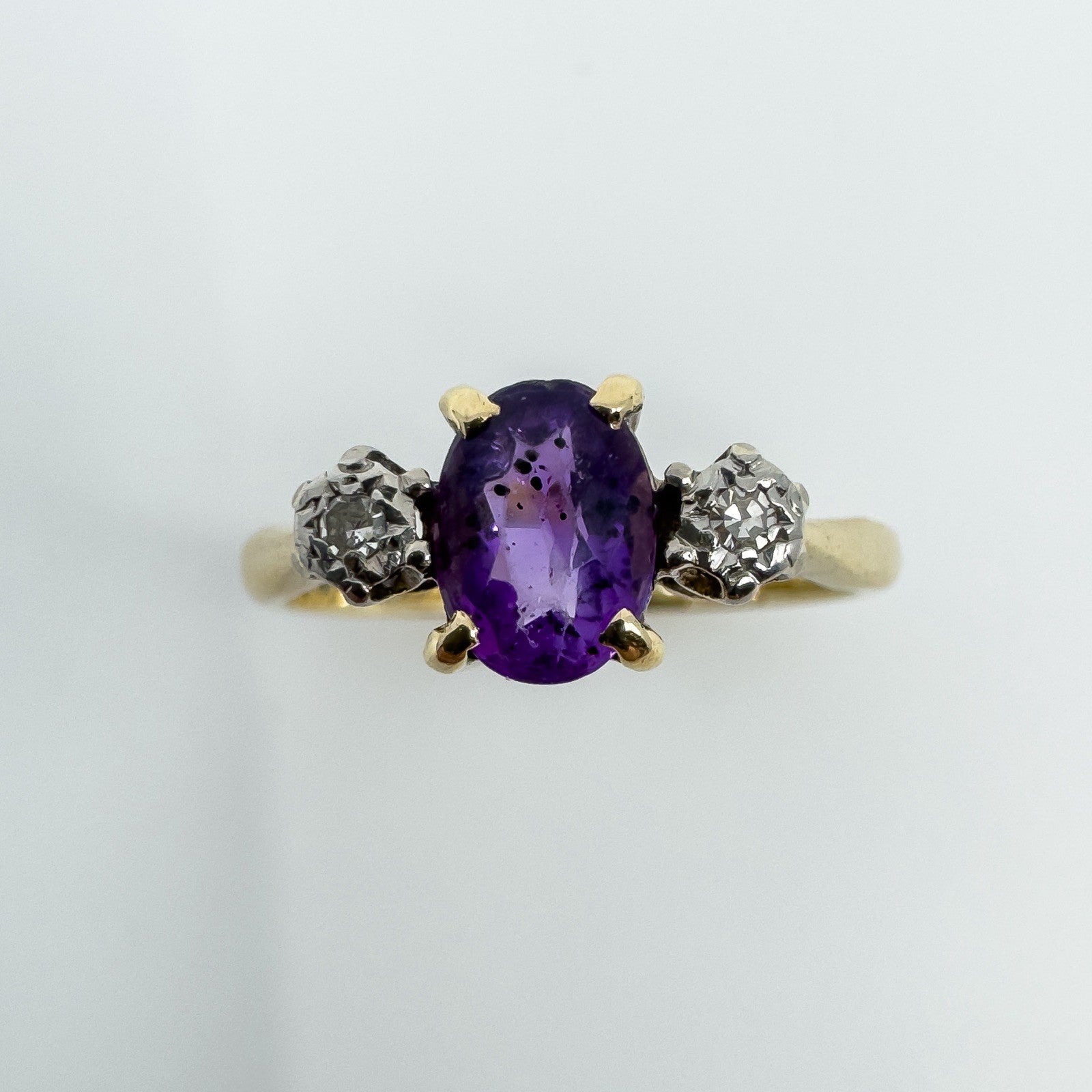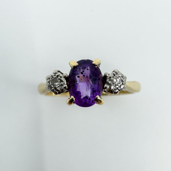 A vintage 9ct yellow gold trilogy ring set with an oval amethyst and two round diamonds.