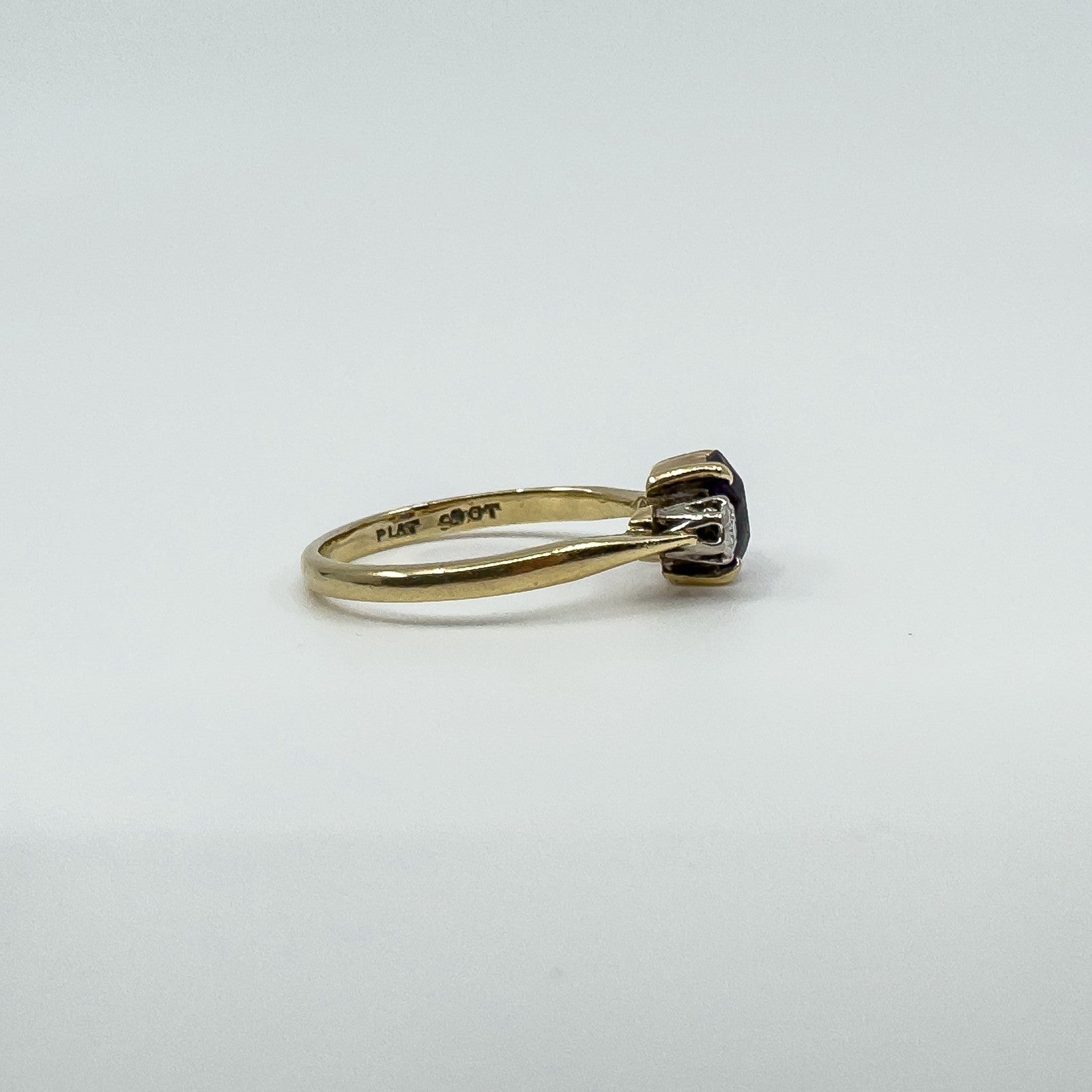The amethyst is estimated at around 0.60 ct in a bezel setting, with a diamond to each side. Stamped PLAT & 9ct.