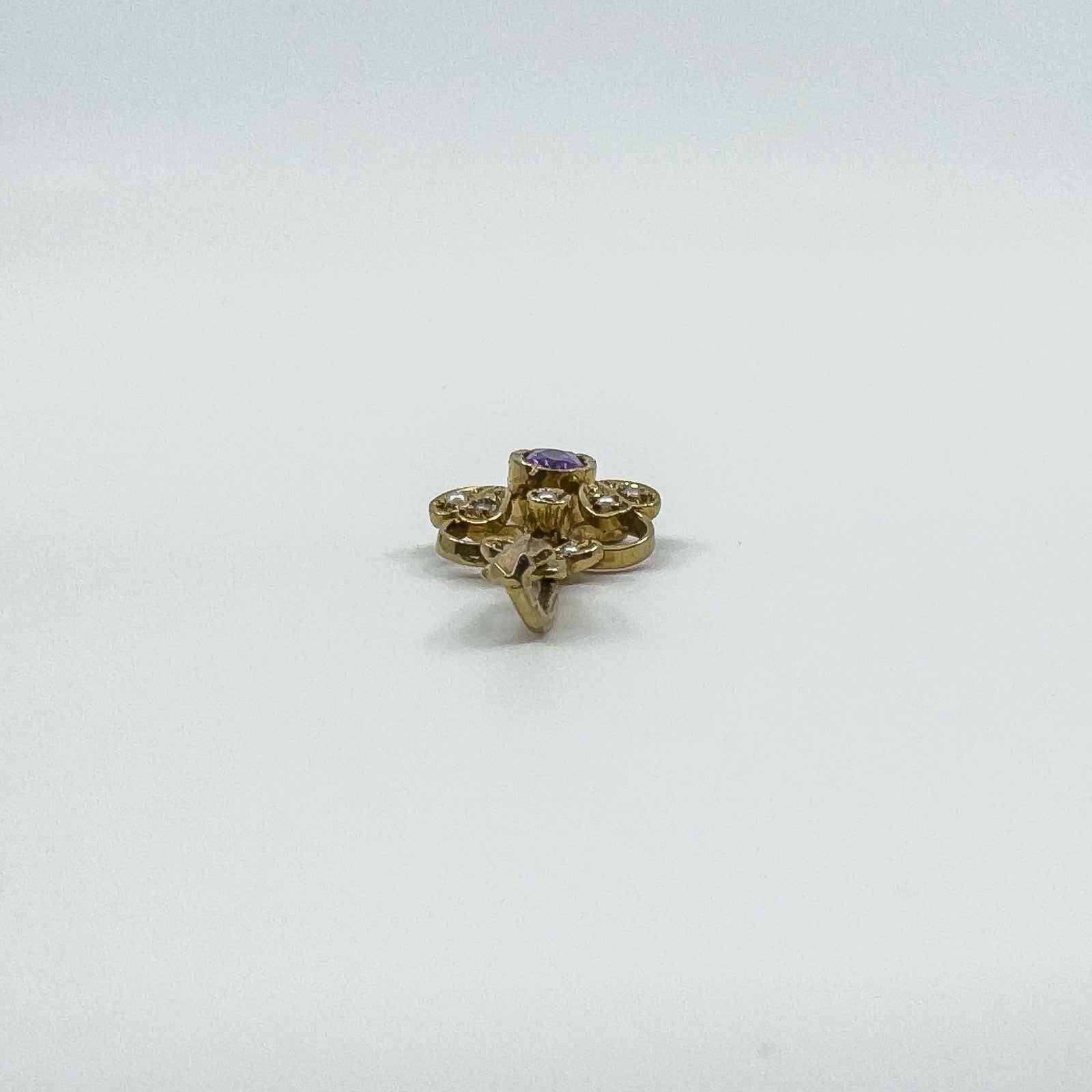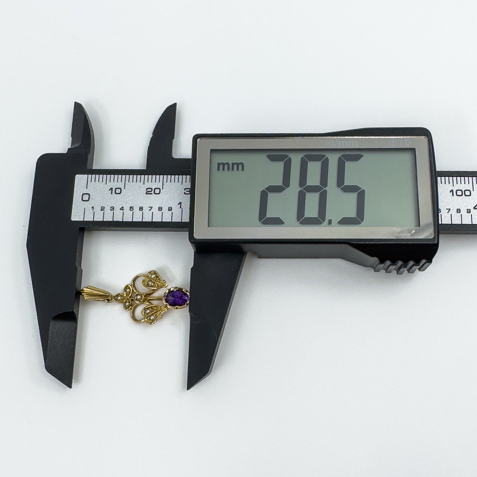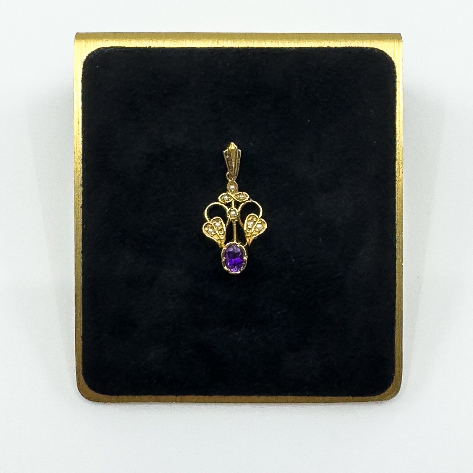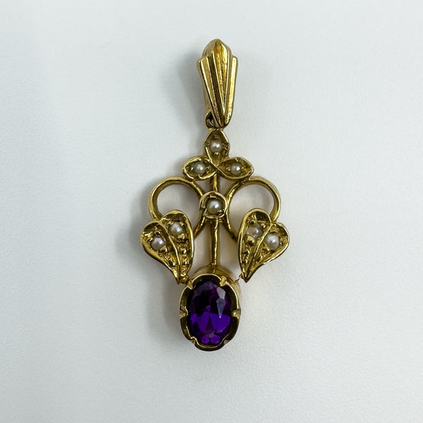 A vintage 9ct gold lavalier pendant in an elegant Art Nouveau style, set with an oval cut purple amethyst and eight small seed pearls. A delicate and timeless piece of jewellery, ideal for wearing on a chain or adding to a collection of antique-inspired pendants.