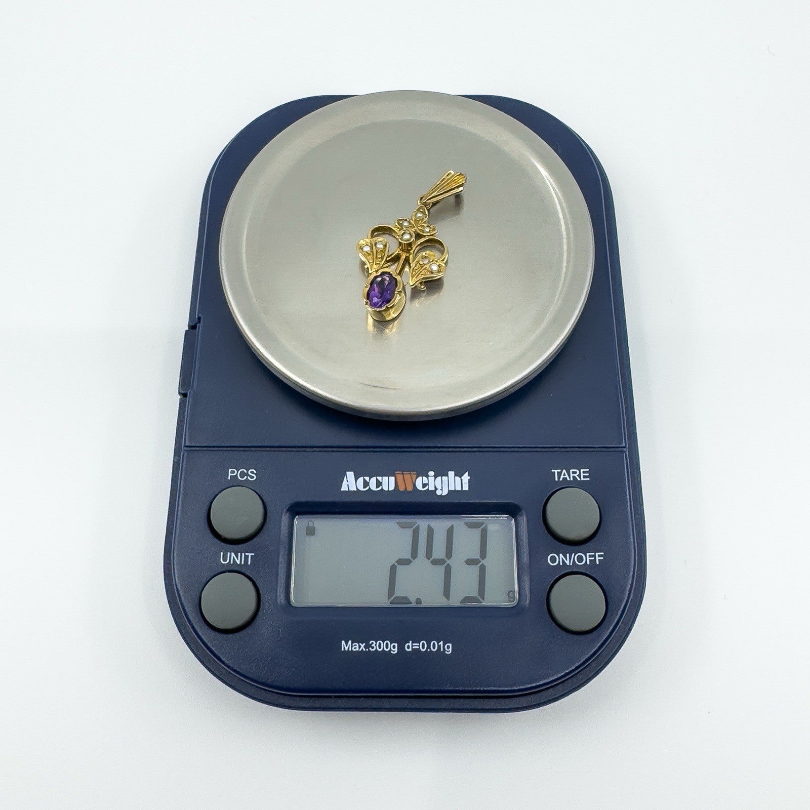 Vintage 9ct Gold Amethyst and Pearl Lavalier Pendant London 375