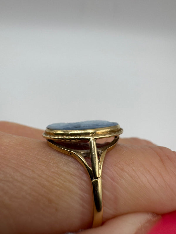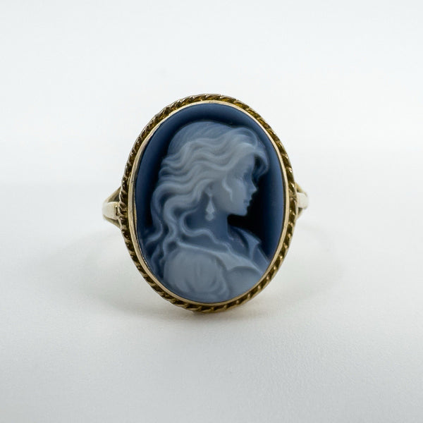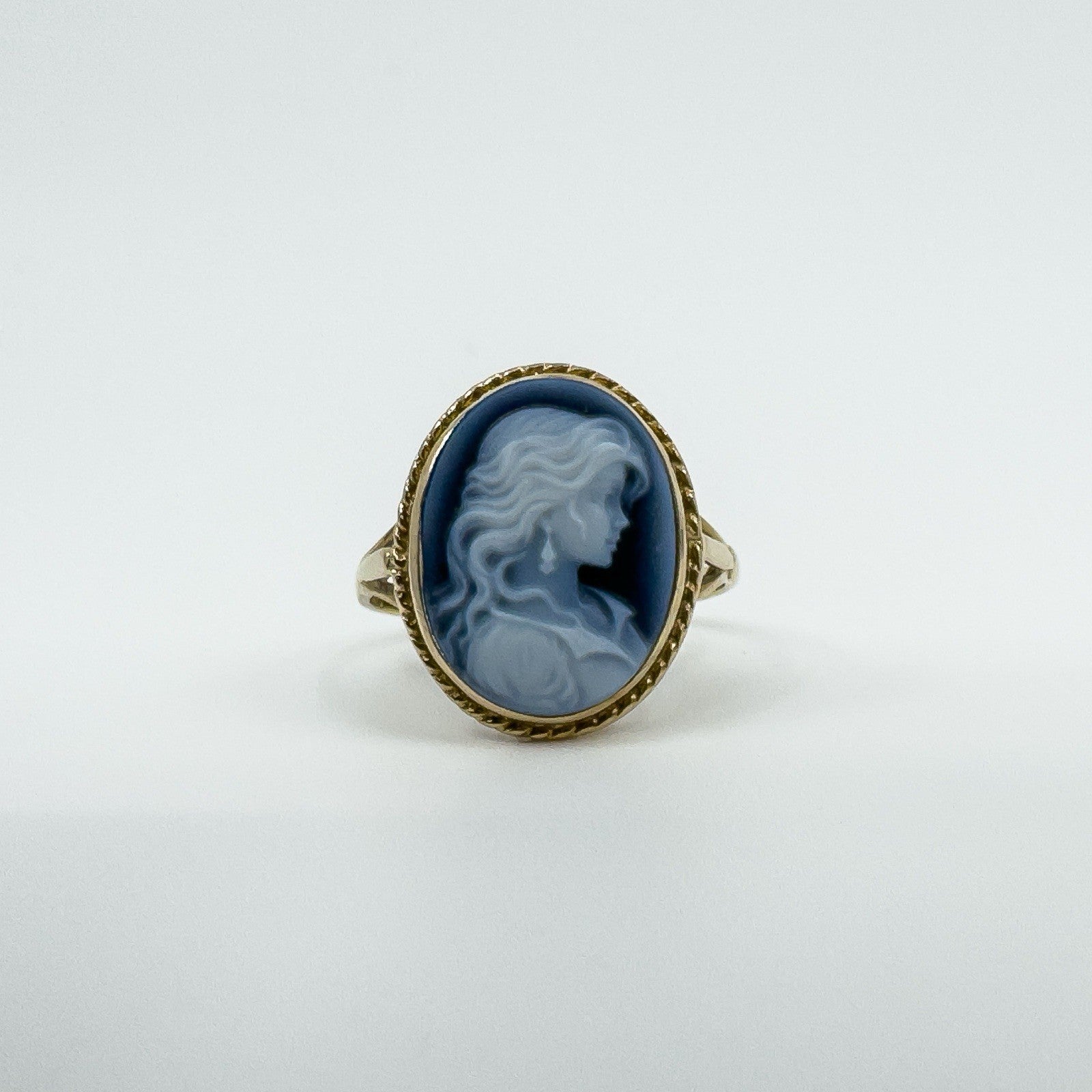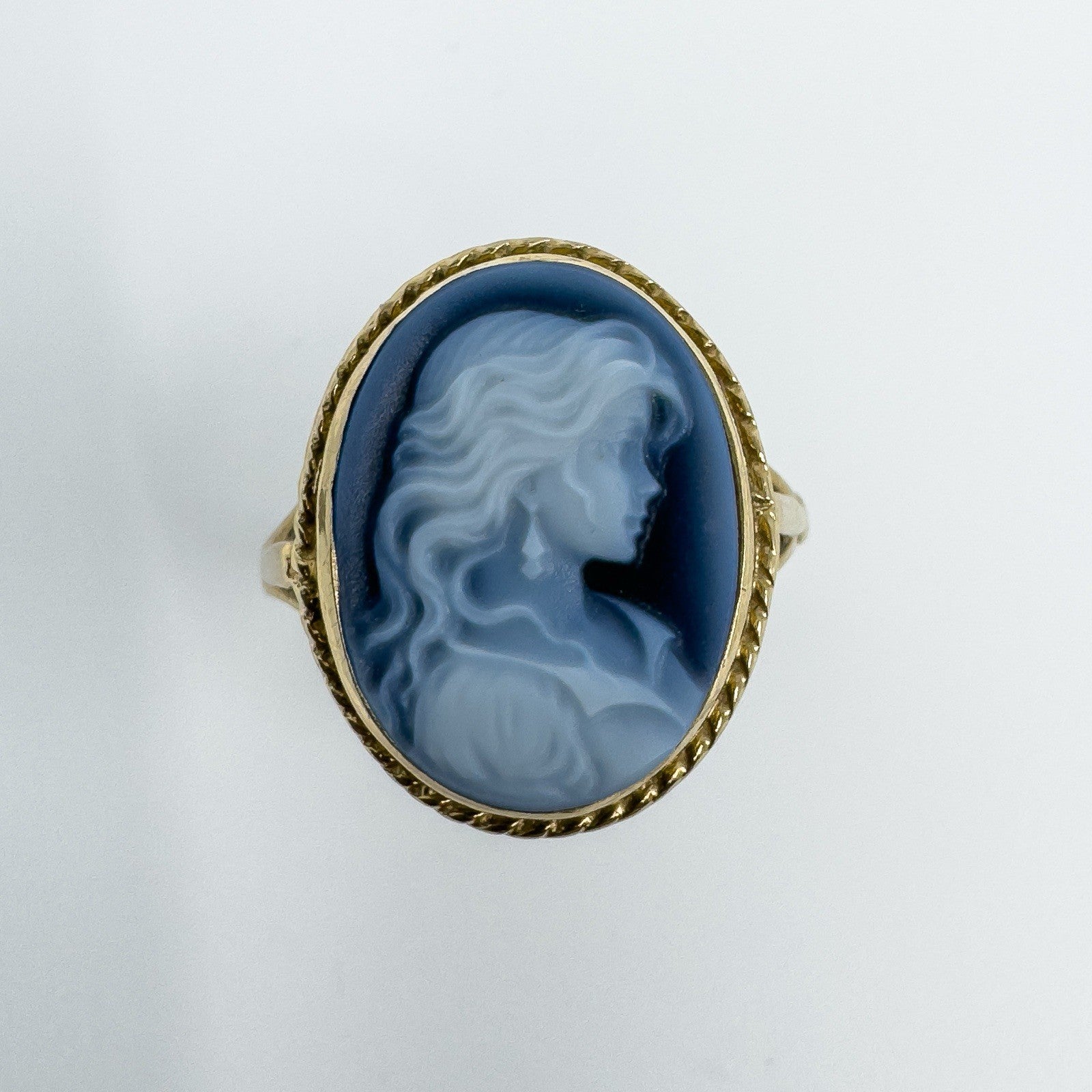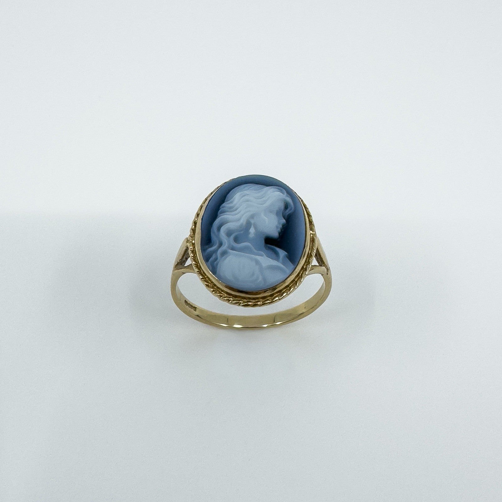 A vintage 9ct gold blue agate cameo ring, bezel set with a finely carved portrait of a lady. The carving shows elegant detail in her features, making this ring both a work of art and a wearable piece of history.