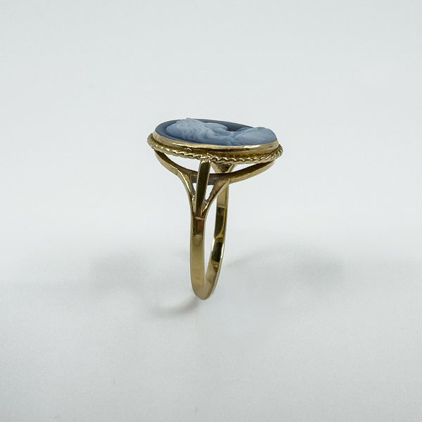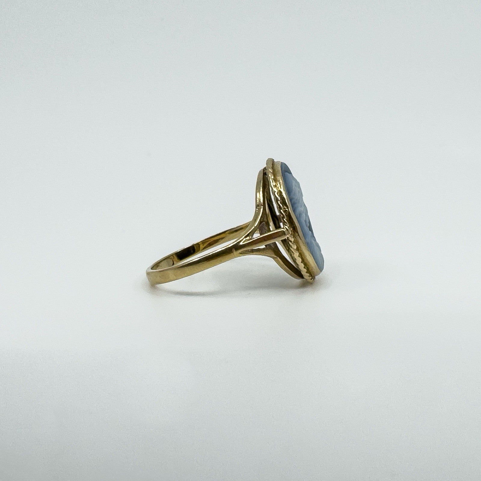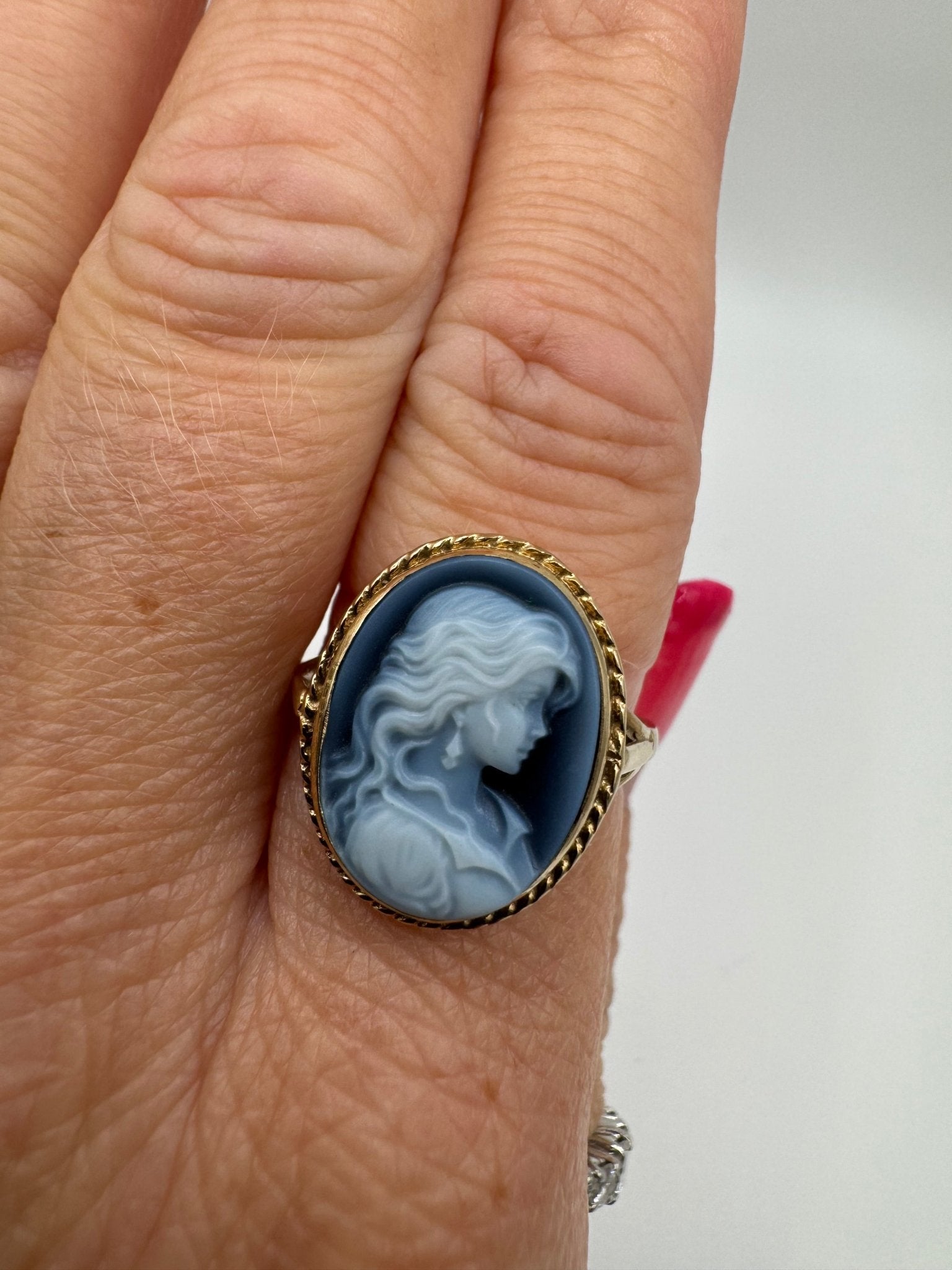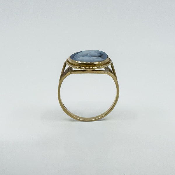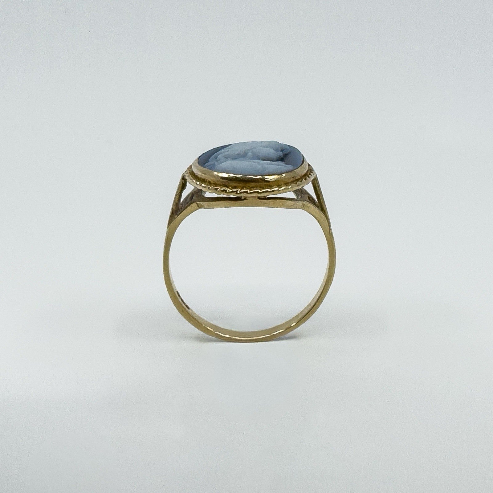 A vintage 9ct gold blue agate cameo ring, bezel set with a finely carved portrait of a lady. The carving shows elegant detail in her features, making this ring both a work of art and a wearable piece of history.