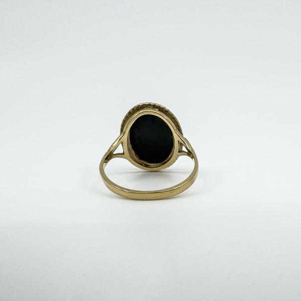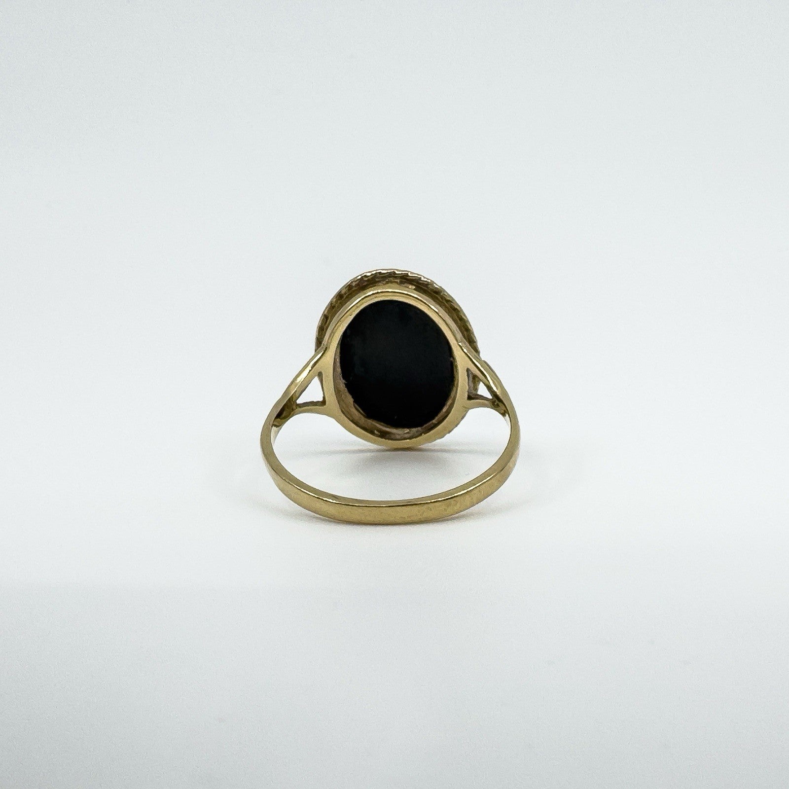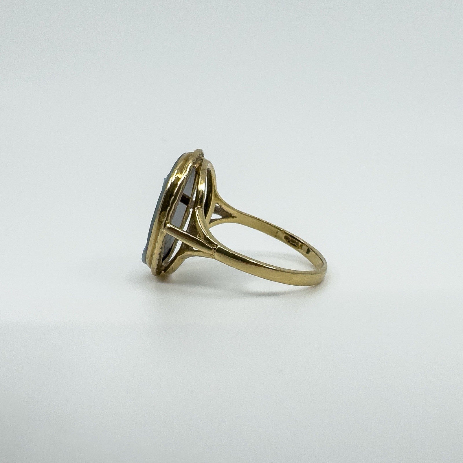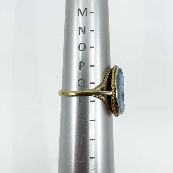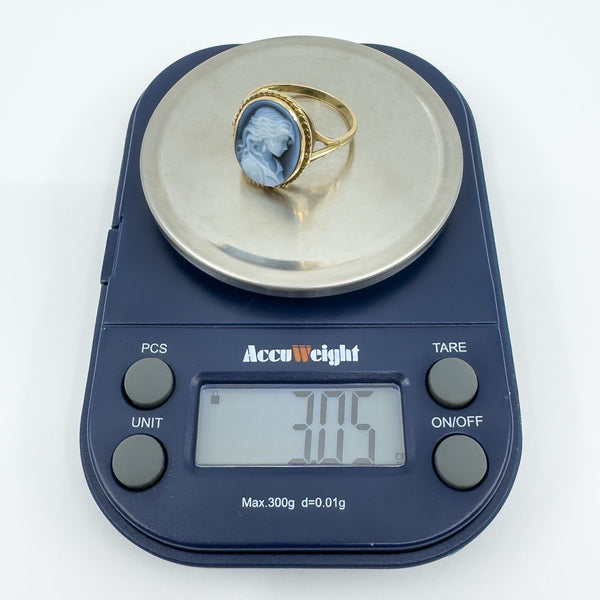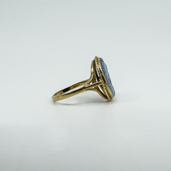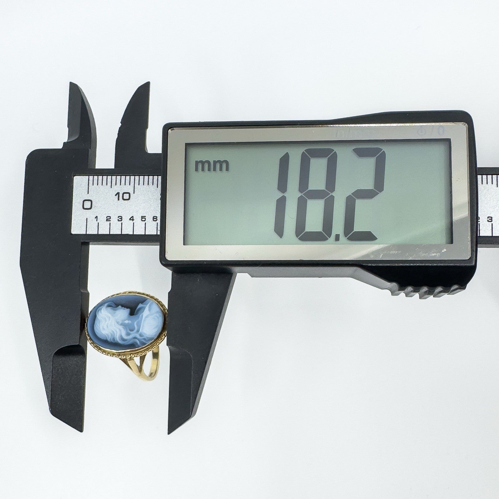 A vintage 9ct gold blue agate cameo ring, bezel set with a finely carved portrait of a lady. The carving shows elegant detail in her features, making this ring both a work of art and a wearable piece of history.