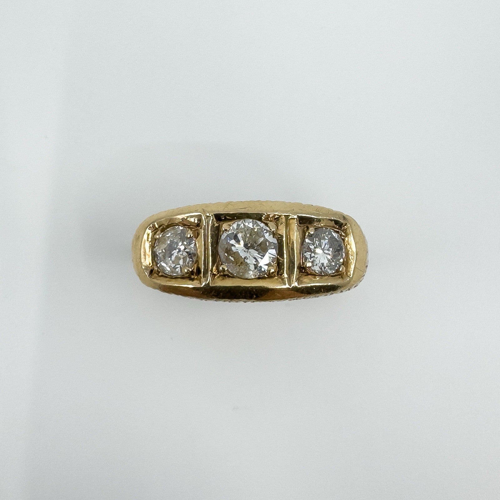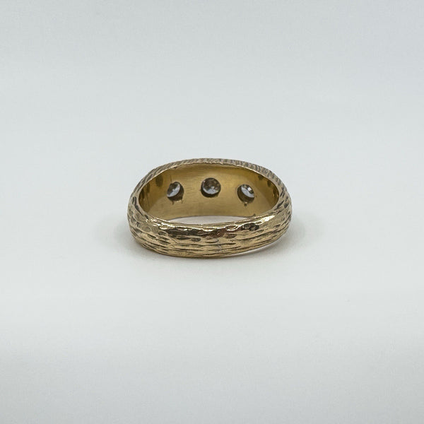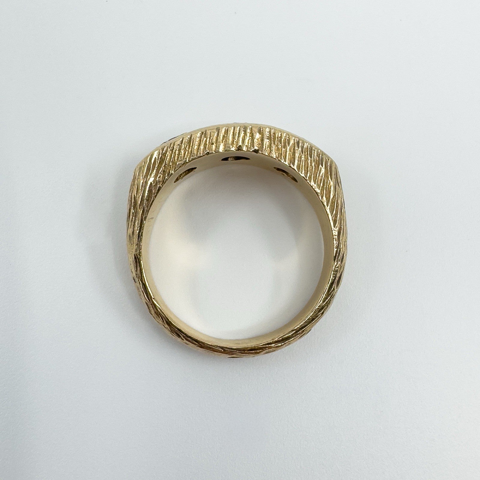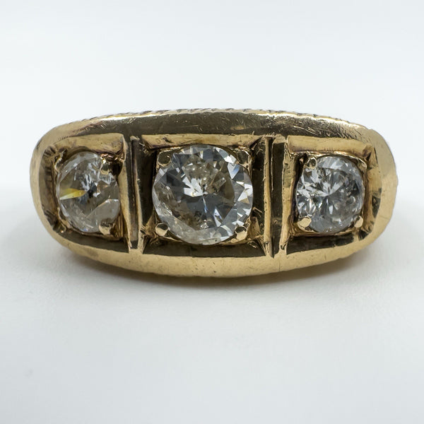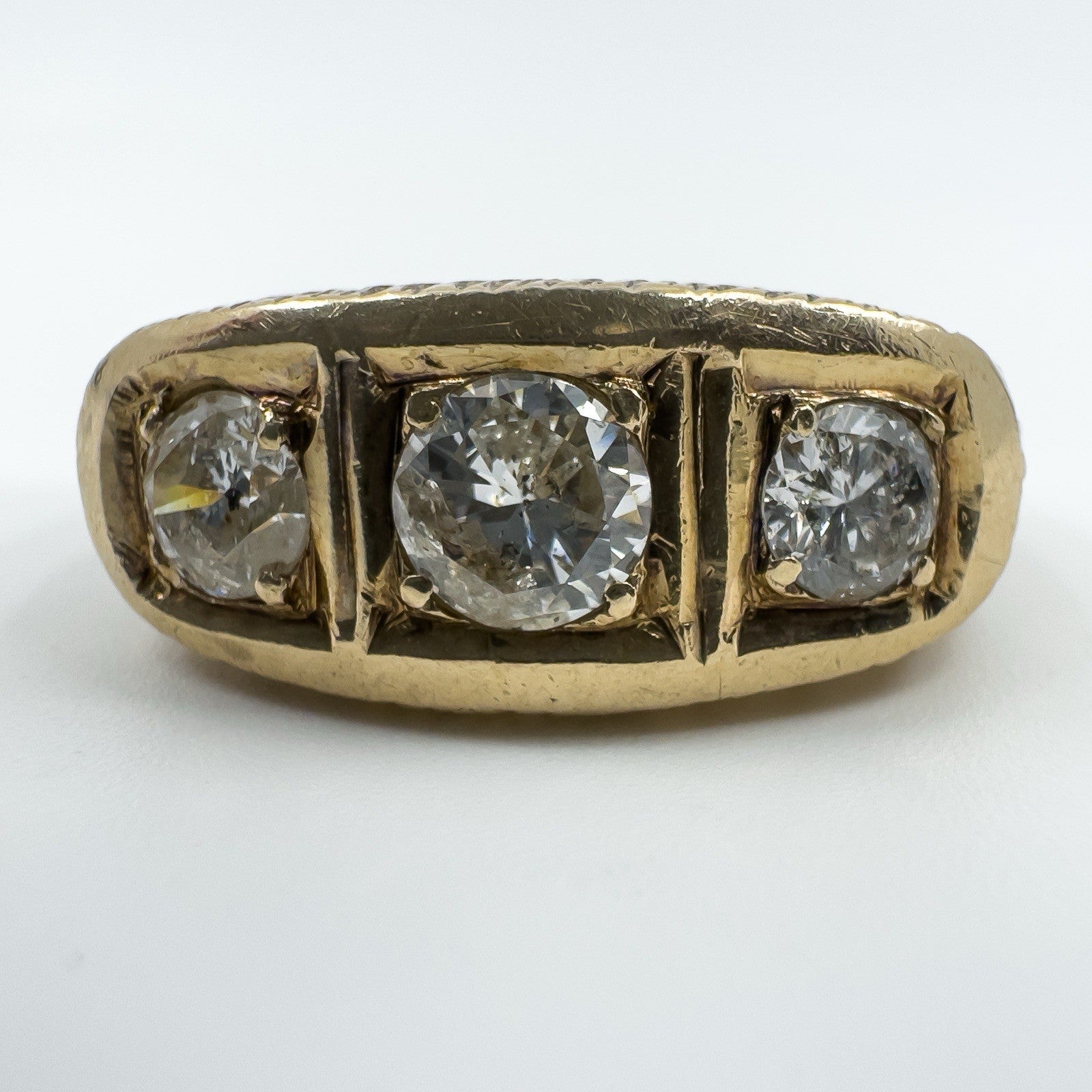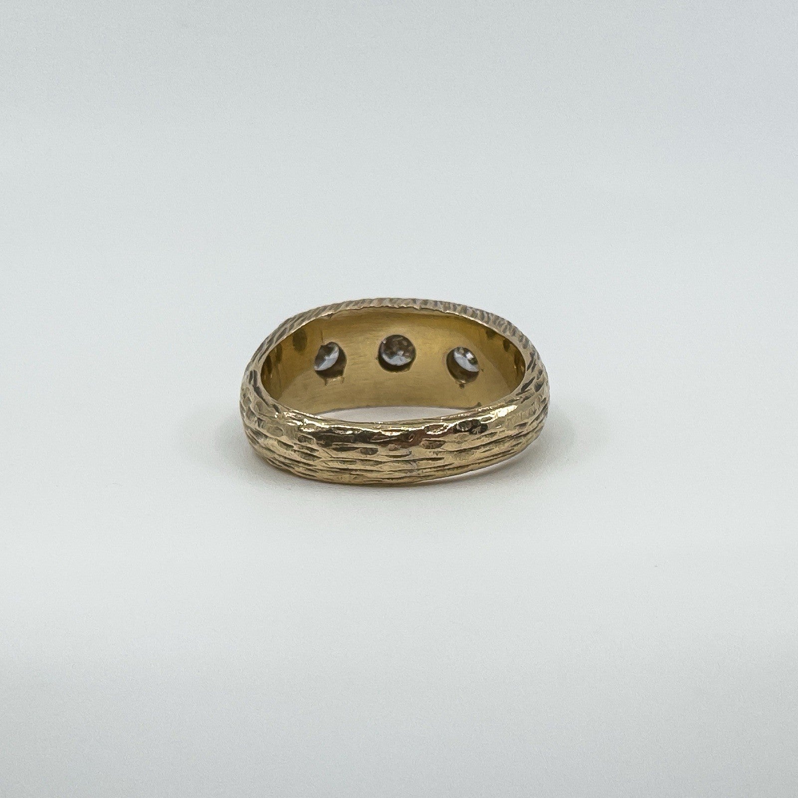 A chunky vintage 9ct gold gypsy band ring set with three round cut natural diamonds in a striking starburst setting. With engraved detail around the band, this bold and retro-style ring has timeless appeal and excellent presence on the hand.