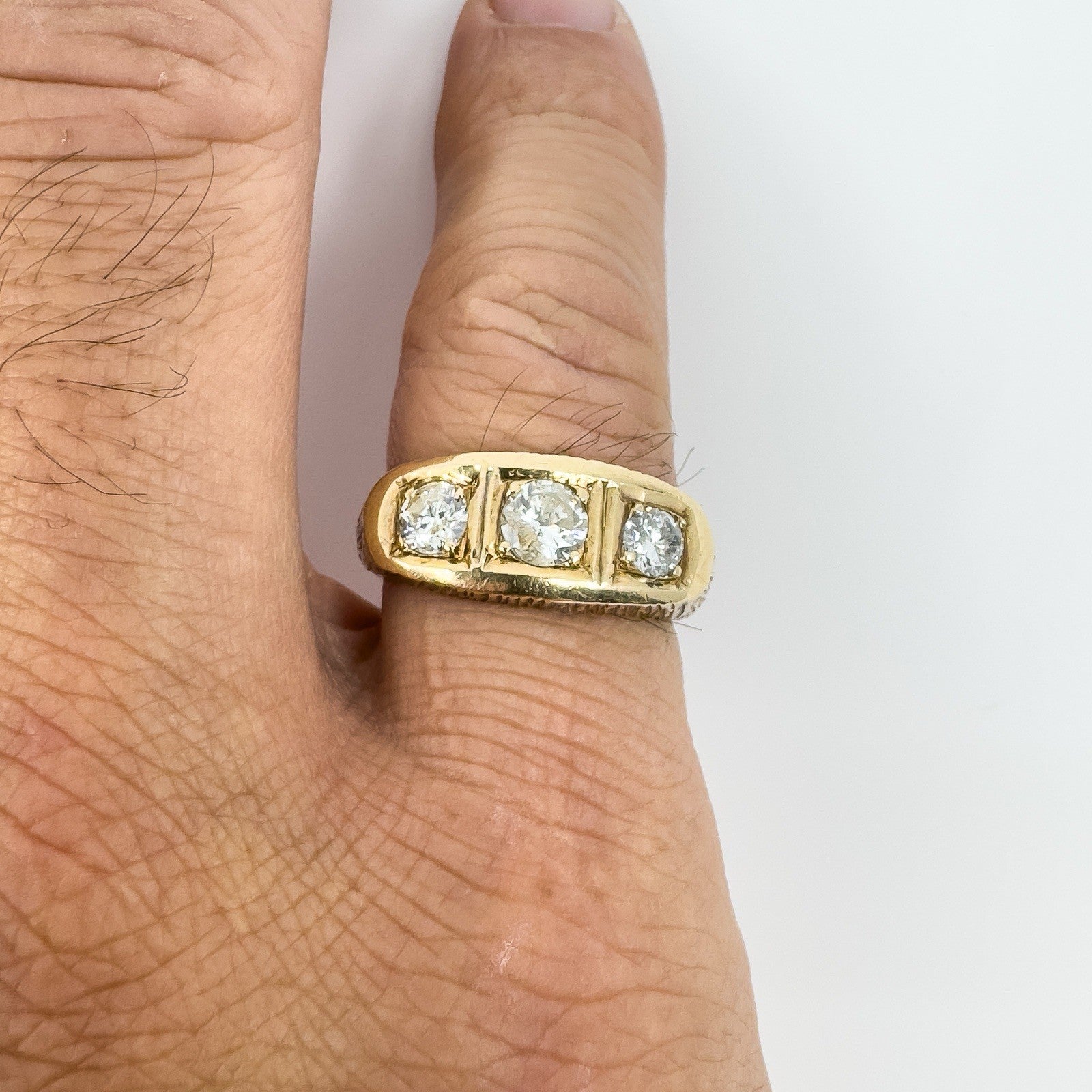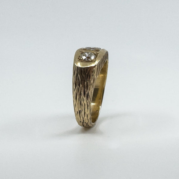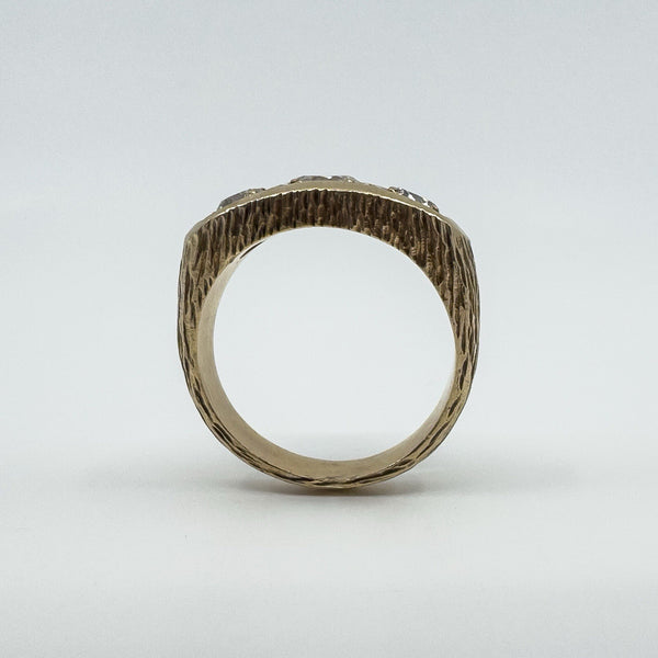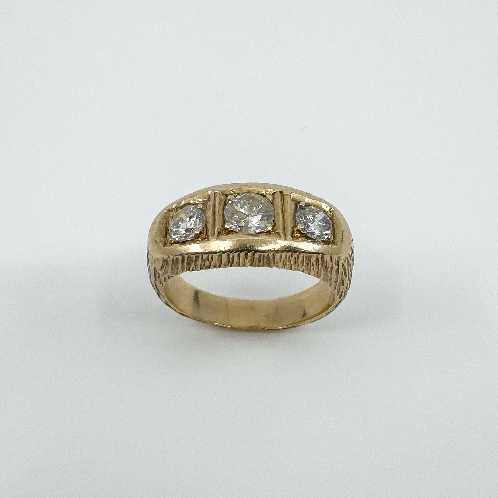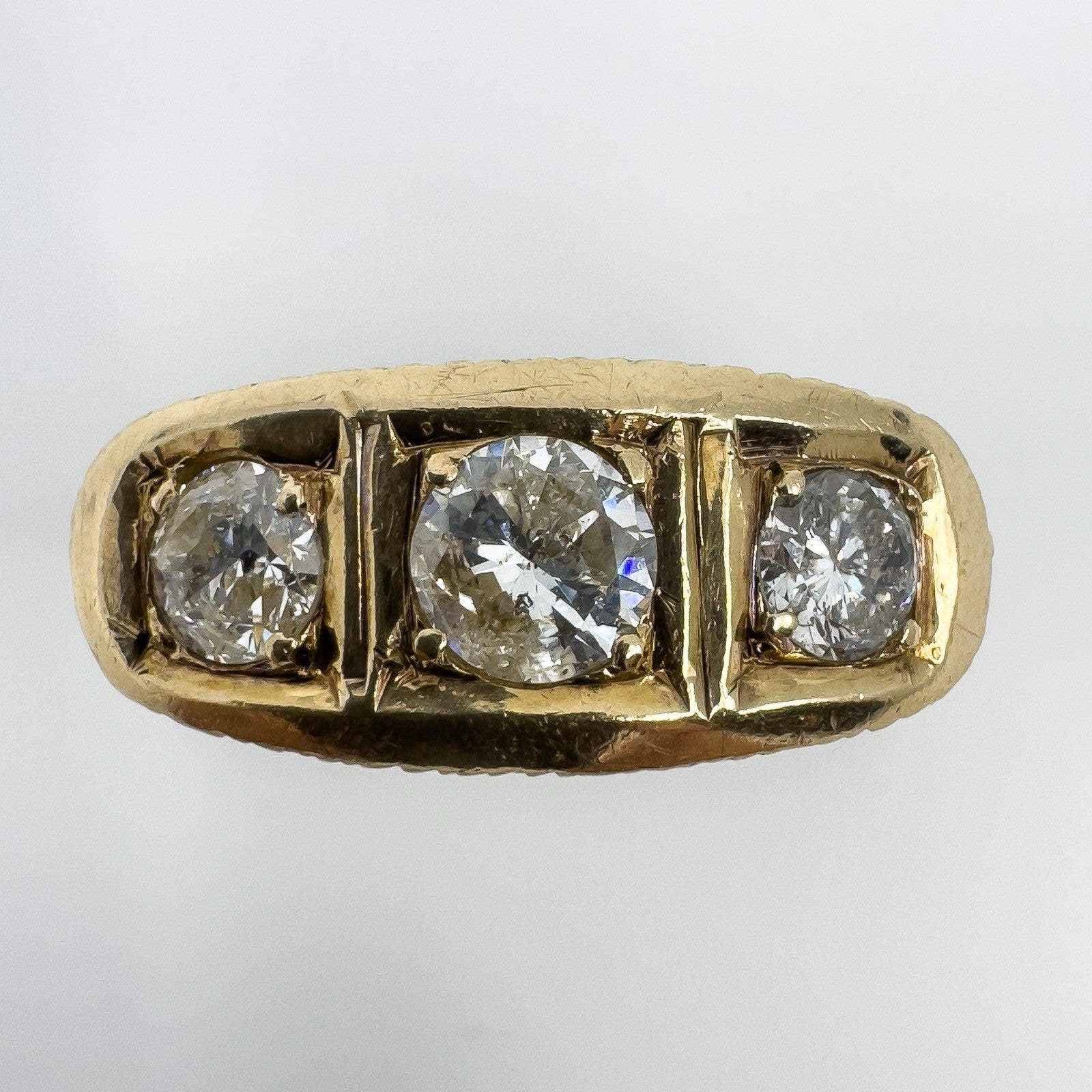 A chunky vintage 9ct gold gypsy band ring set with three round cut natural diamonds in a striking starburst setting. With engraved detail around the band, this bold and retro-style ring has timeless appeal and excellent presence on the hand.