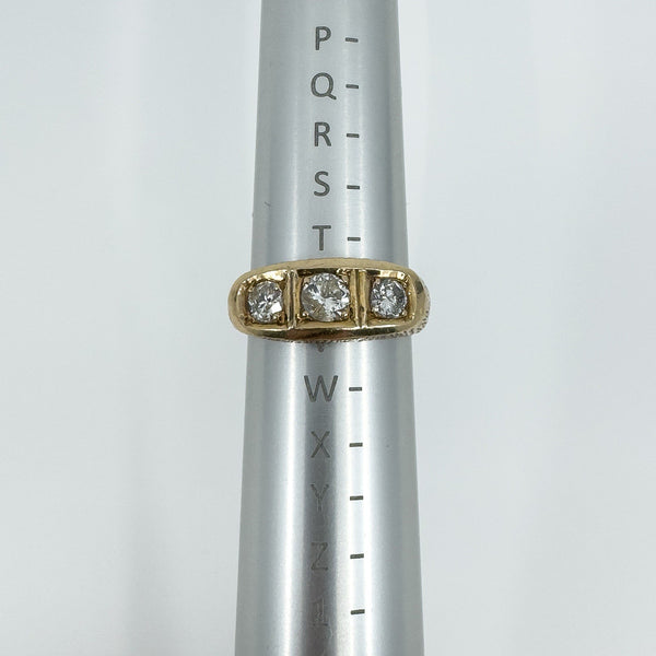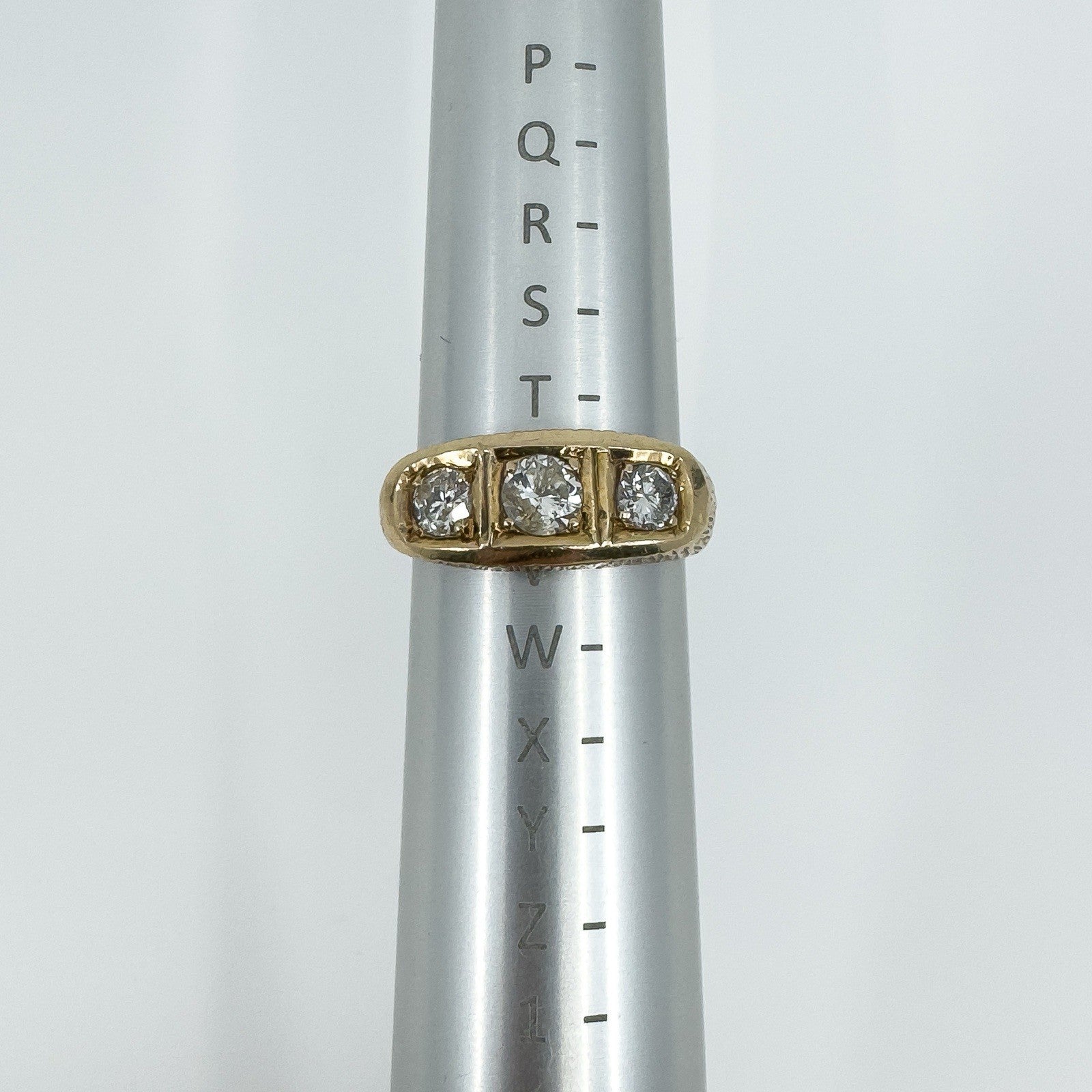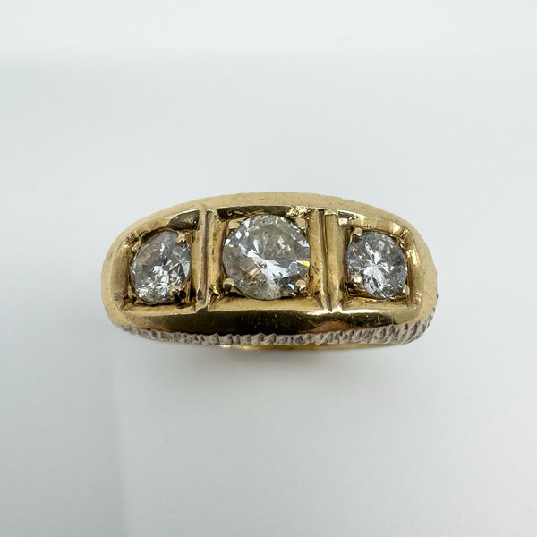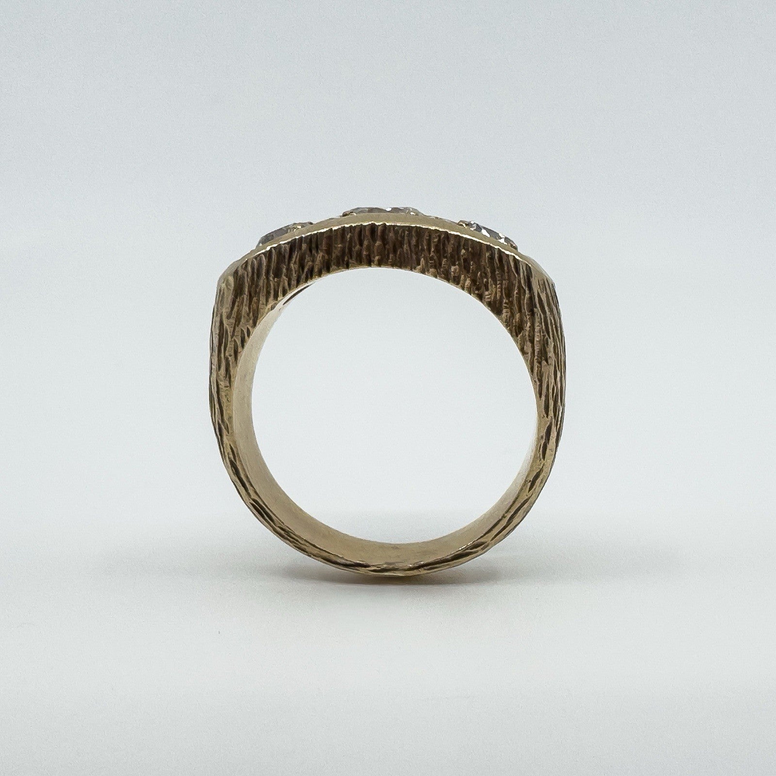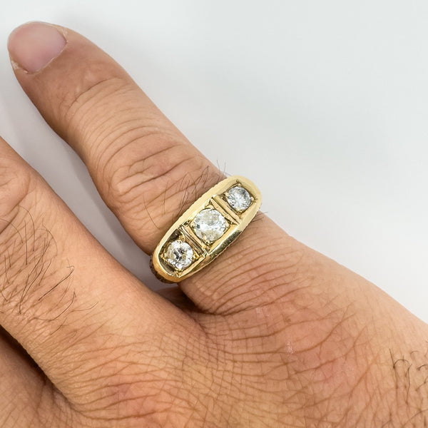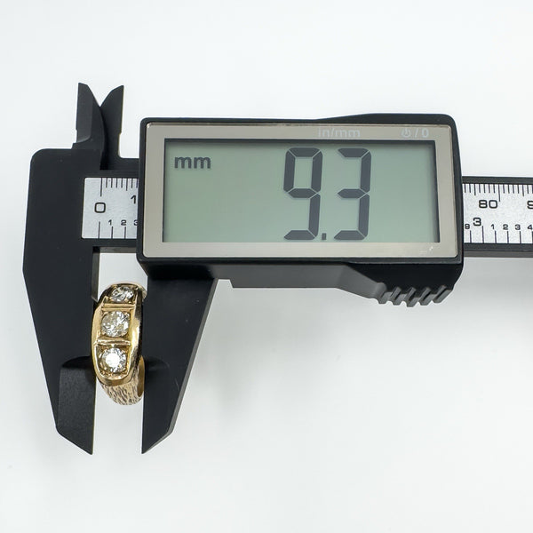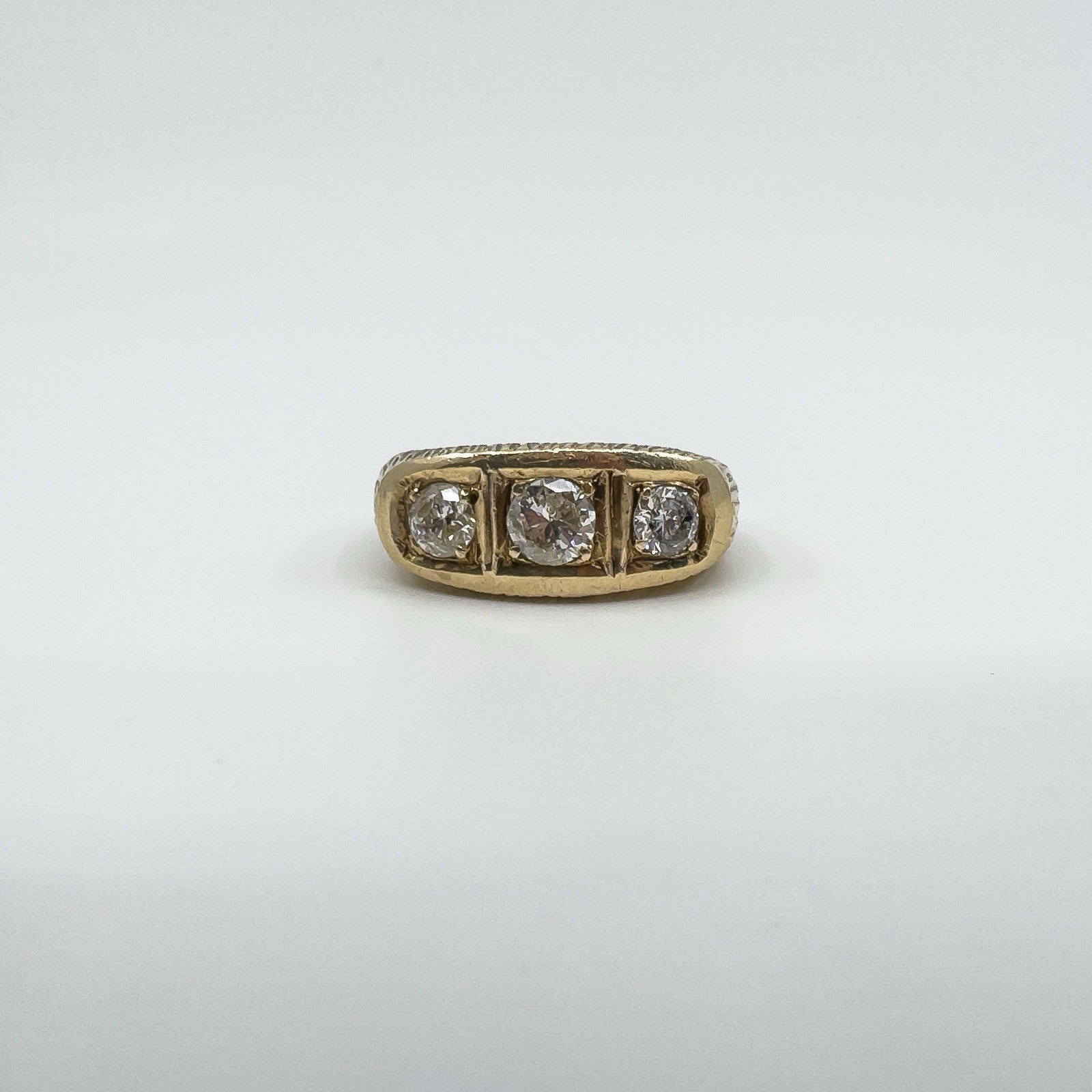 A chunky vintage 9ct gold gypsy band ring set with three round cut natural diamonds in a striking starburst setting. With engraved detail around the band, this bold and retro-style ring has timeless appeal and excellent presence on the hand.