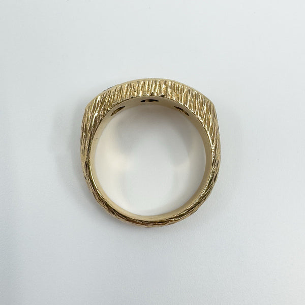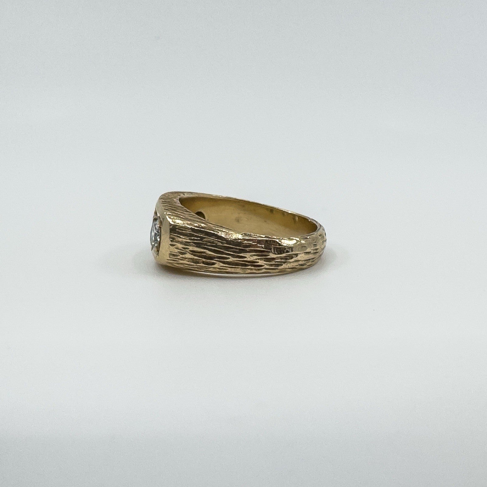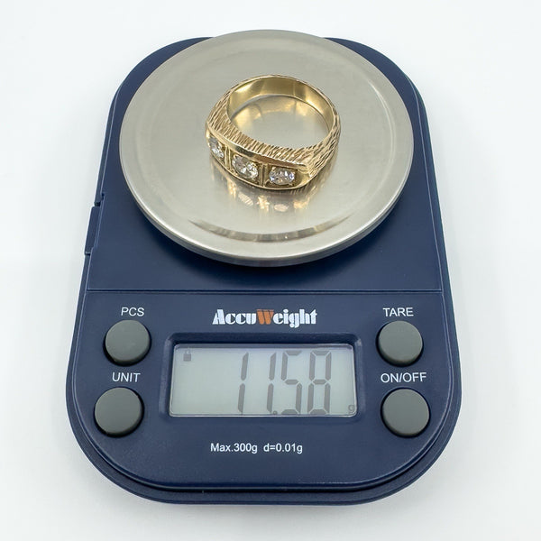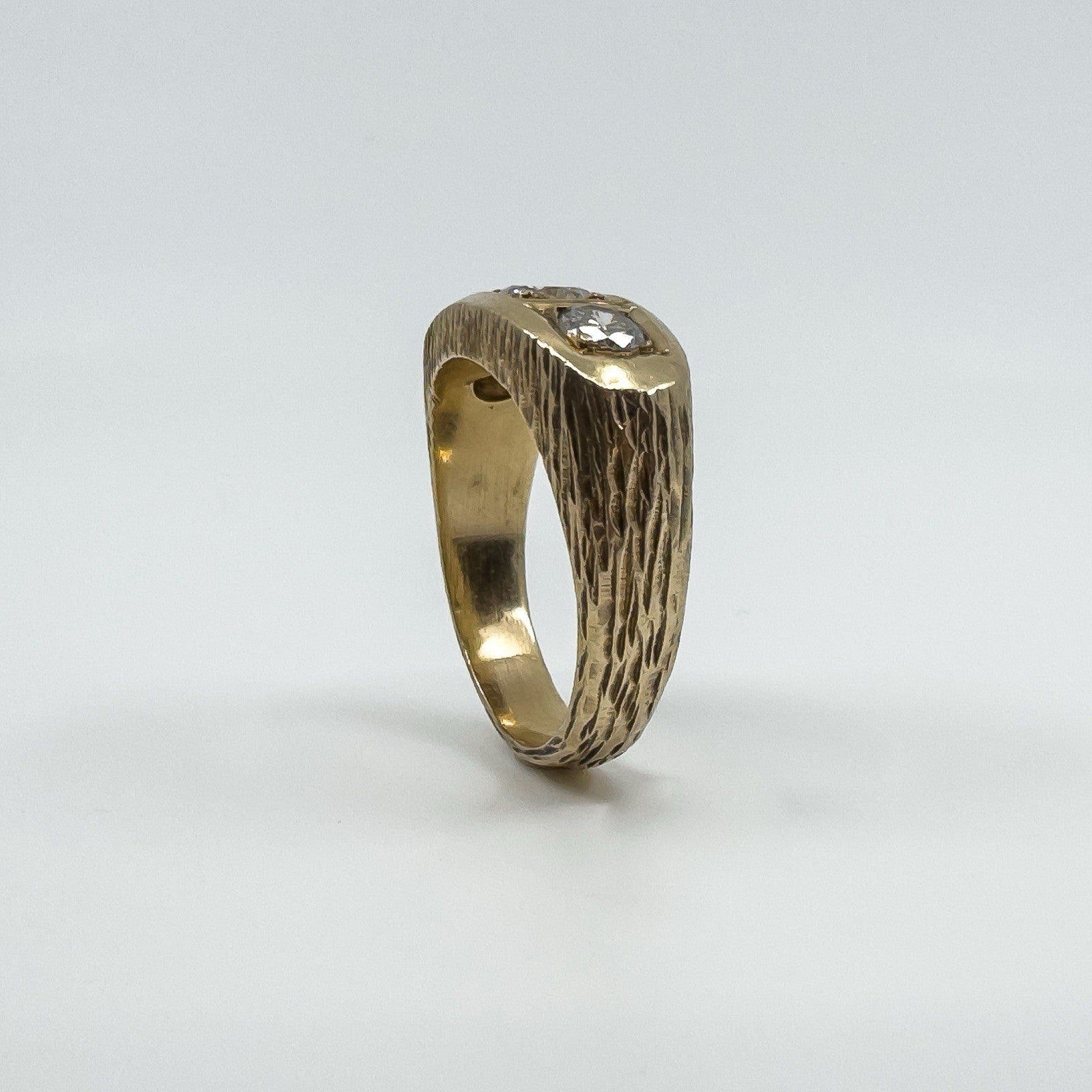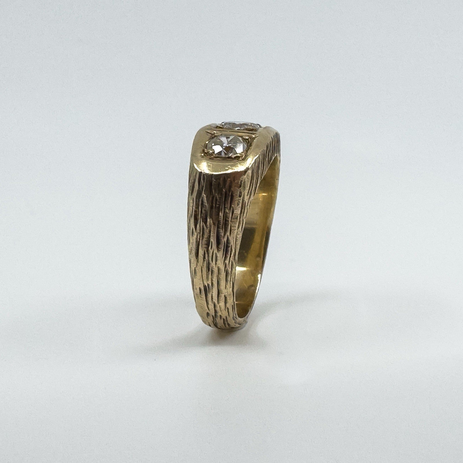 Tested for 9ct gold though not stamped, this solid ring weighs 11.5g and is set with approximately 1.30ct of diamonds in total. A substantial and collectible piece that’s easy to wear and full of character.